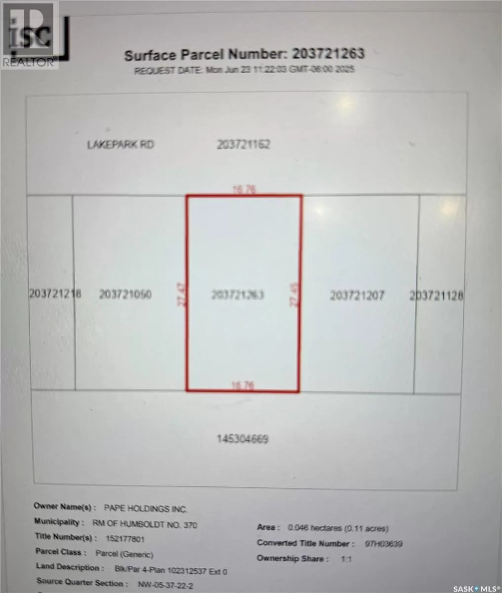 Enjoy lake living on this lot. The Seasonal lot is .11 acre. Culverts and driveways have been installed and trees planted. Lot has 100 amp power to property line. Buyer to sign Servicing Agreement with Pape Holdings Inc.. Buyer responsible for utility hookup costs. Buyer is responsible for septic holding tank cost and install. Buyers to consult with RM of Humboldt regarding building guidelines and approval. Minutes from the City of Humboldt and approx. 50 min from the BHP Jansen Potash Mine site. Call today for more information! (id:27476)