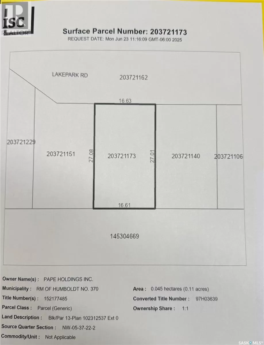 Enjoy lake living on this lot. The Seasonal lot is .11 acre. Culverts and driveways have been installed and trees planted. Lot has 100 amp power to property line. Buyer to sign Servicing Agreement with Pape Holdings Inc.. Buyer responsible for utility hookup costs. Buyer is responsible for septic holding tank cost and install. Buyers to consult with RM of Humboldt regarding building guidelines and approval. Minutes from the City of Humboldt and approx. 50 min from the BHP Jansen Potash Mine site. Call today for more information! (id:27476)