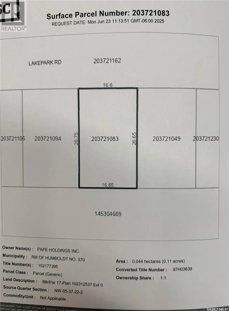 Enjoy lake living on this lot. The Seasonal lot is .11 acre. Culverts and driveways have been installed and trees planted. Lot has 100 amp power to property line. Buyer to sign Servicing Agreement with Pape Holdings Inc.. Buyer responsible for utility hookup costs. Buyer is responsible for septic holding tank cost and install. Buyers to consult with RM of Humboldt regarding building guidelines and approval. Minutes from the City of Humboldt and approx. 50 min from the BHP Jansen Potash Mine site. Call today for more information! (id:27476)