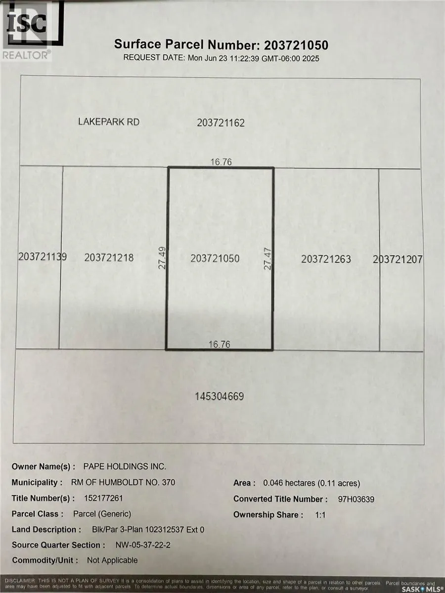 Enjoy lake living on this lot. The Seasonal lot is .11 acre. Culverts and driveways have been installed and trees planted. Lot has 100 amp power meter on property. Buyer to sign Servicing Agreement with Pape Holdings Inc.. Buyer responsible for utility hookup costs. Buyer is responsible for septic holding tank cost and install. Buyers to consult with RM of Humboldt regarding building guidelines and approval. Minutes from the City of Humboldt and approx. 50 min from the BHP Jansen Potash Mine site. Call today for more information! (id:27476)