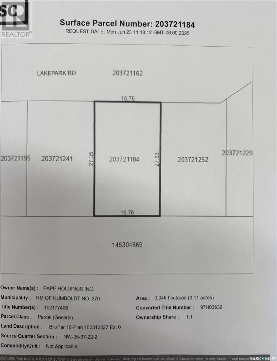 Enjoy lake living on this lot. The Seasonal lot is .11 acre. Culverts and driveways have been installed and trees planted. Lot has 100 amp power to property line. Buyer to sign Servicing Agreement with Pape Holdings Inc.. Buyer responsible for utility hookup costs. Buyer is responsible for septic holding tank cost and install. Buyers to consult with RM of Humboldt regarding building guidelines and approval. Minutes from the City of Humboldt and approx. 50 min from the BHP Jansen Potash Mine site. Call today for more information! (id:27476)