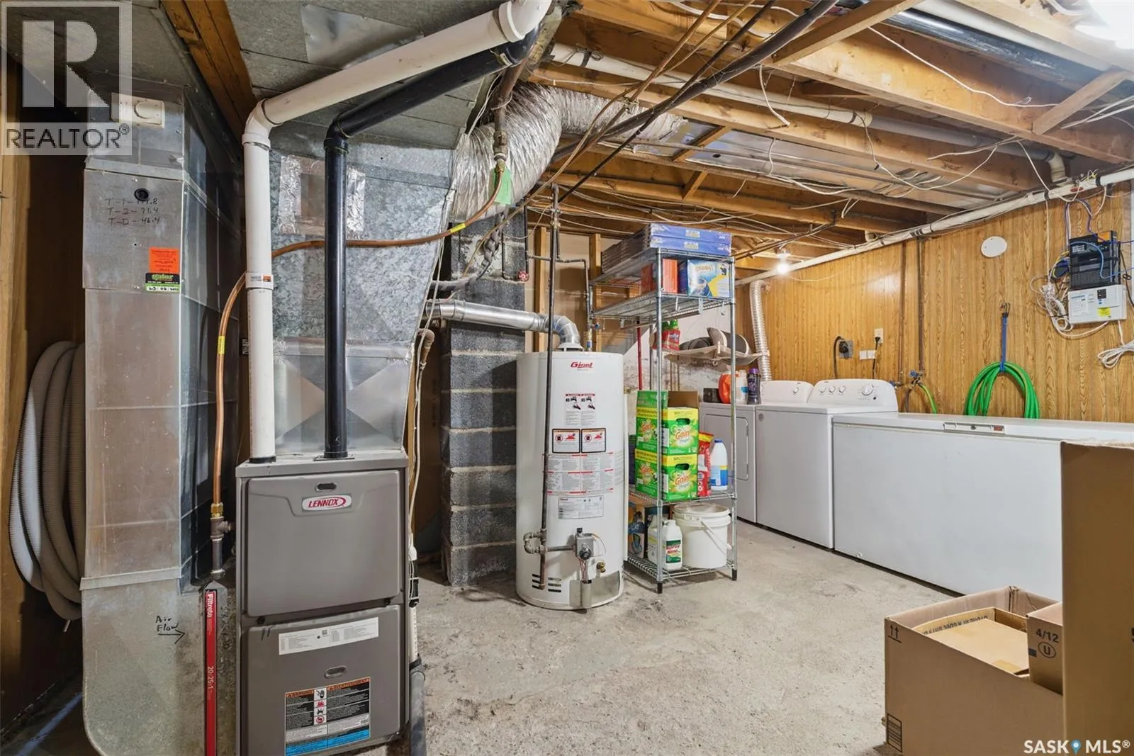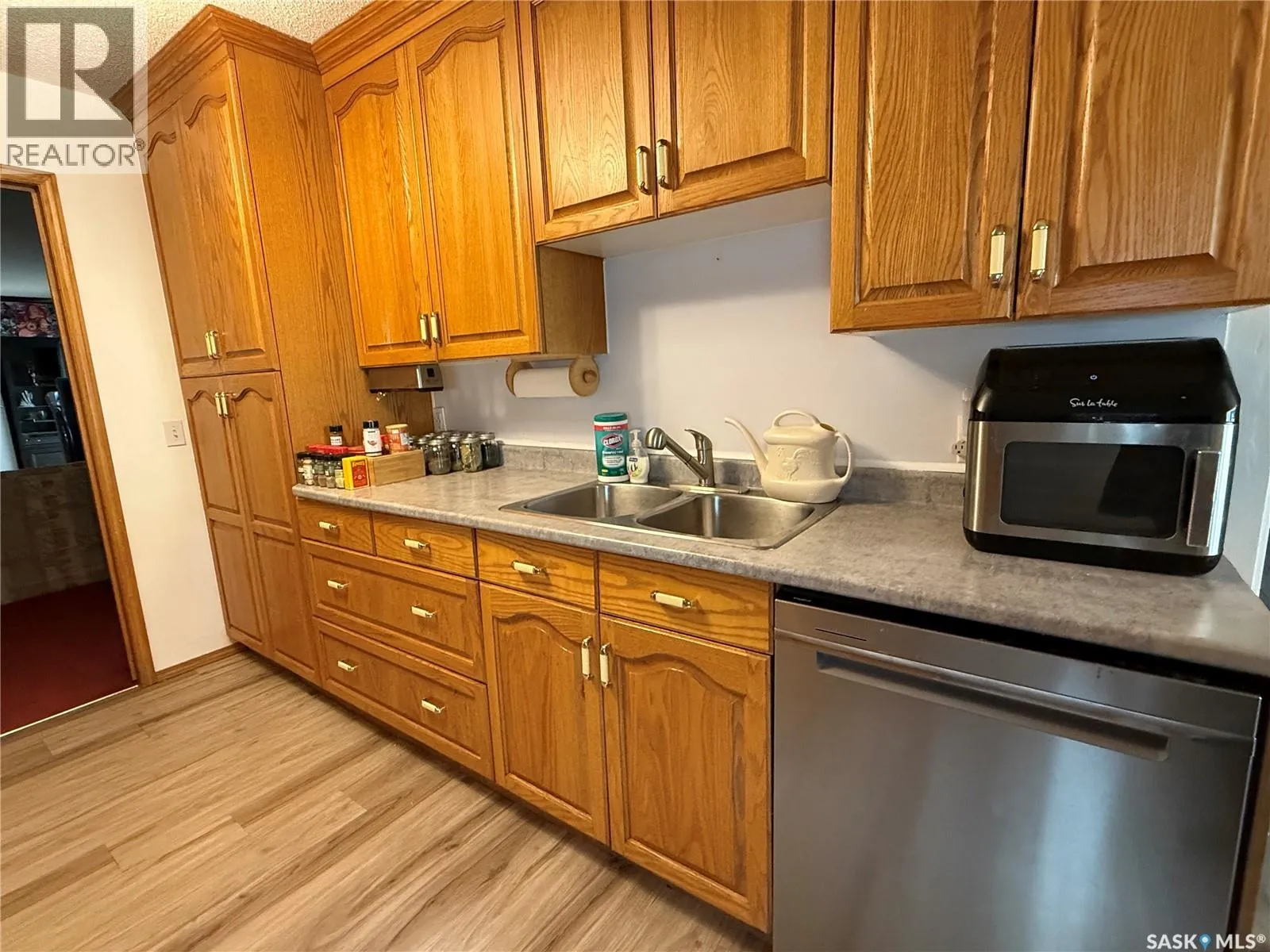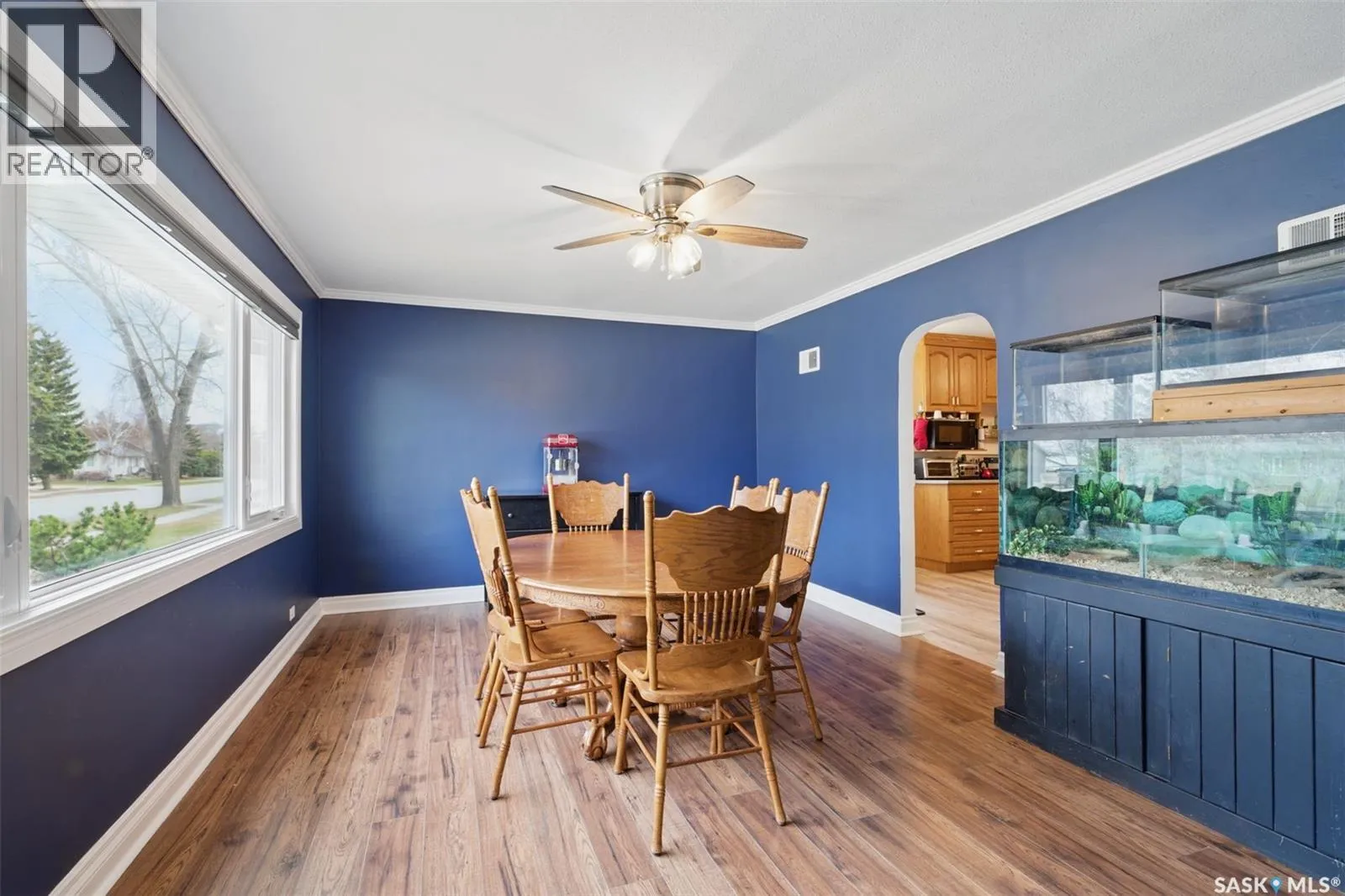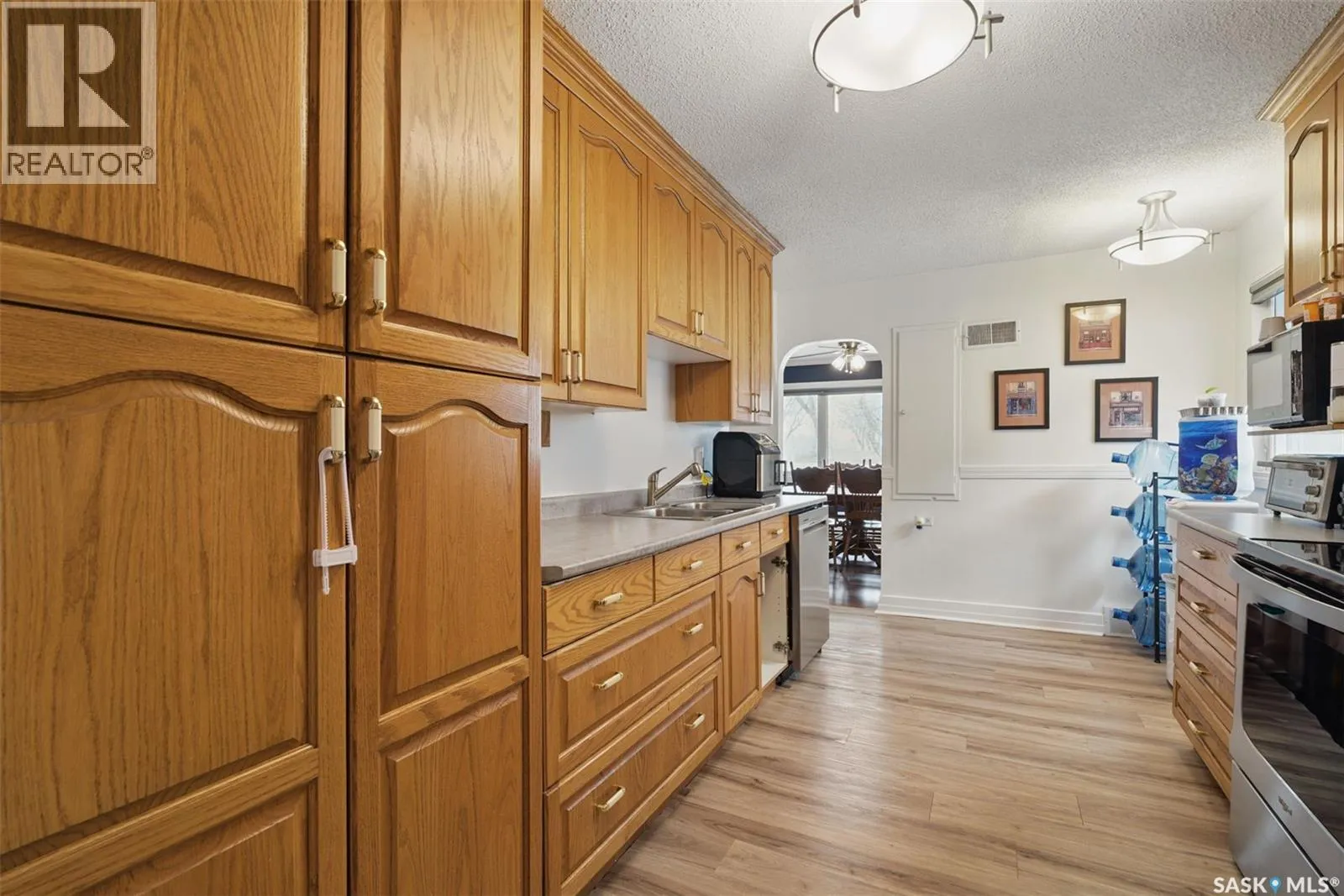 Welcome to this well-maintained 2+1 bedroom bungalow with a den, offering a spacious and thoughtfully laid-out floor plan, located within walking distance to downtown Humboldt and a nearby elementary school. The main level features a large front-facing dining area, bathed in natural light from an expansive east-facing window, creating a warm and inviting atmosphere. The oak kitchen provides ample cabinet and counter space. It seamlessly connects to the bright and comfortable living room, complete with a natural gas fireplace and patio doors leading to a two-tiered deck and fully fenced backyardâperfect for relaxing or entertaining. The main floor also includes a generous primary bedroom with a 3-piece ensuite, a second bedroom, and a versatile den. A beautifully updated 4-piece bathroom with modern finishes adds both style and functionality. The lower level is partially finished, offering a third bedroom, a large carpeted family room that provides additional living space, and a utility/storage area, with the remaining space ready for your finishing touches. A single detached garage with back alley access provides added convenience, and the yard is fully fenced with ample green space for outdoor enjoyment. This home has received several recent updates, including new shingles, some new windows, a water heater, furnace, stove, dishwasher, washer, and dryer. The main level has also seen updates, including a renovated bathroom, newer flooring, and modern light fixtures throughout. With its family-friendly layout, modern upgrades, and prime location, this move-in-ready home presents an excellent opportunity. Contact your REALTOR® today to schedule a private viewing. (id:27476)