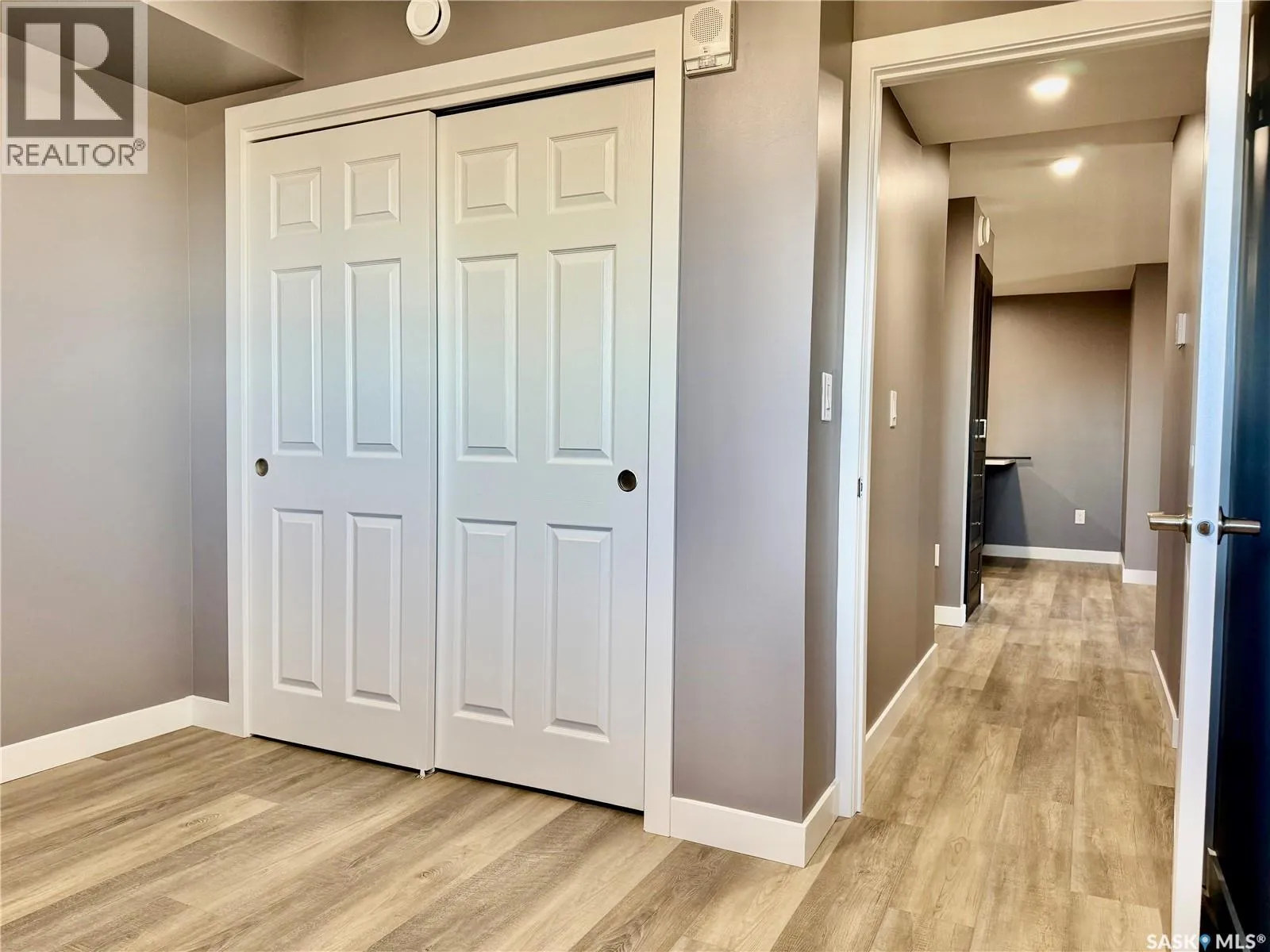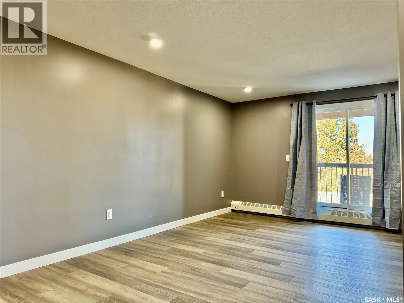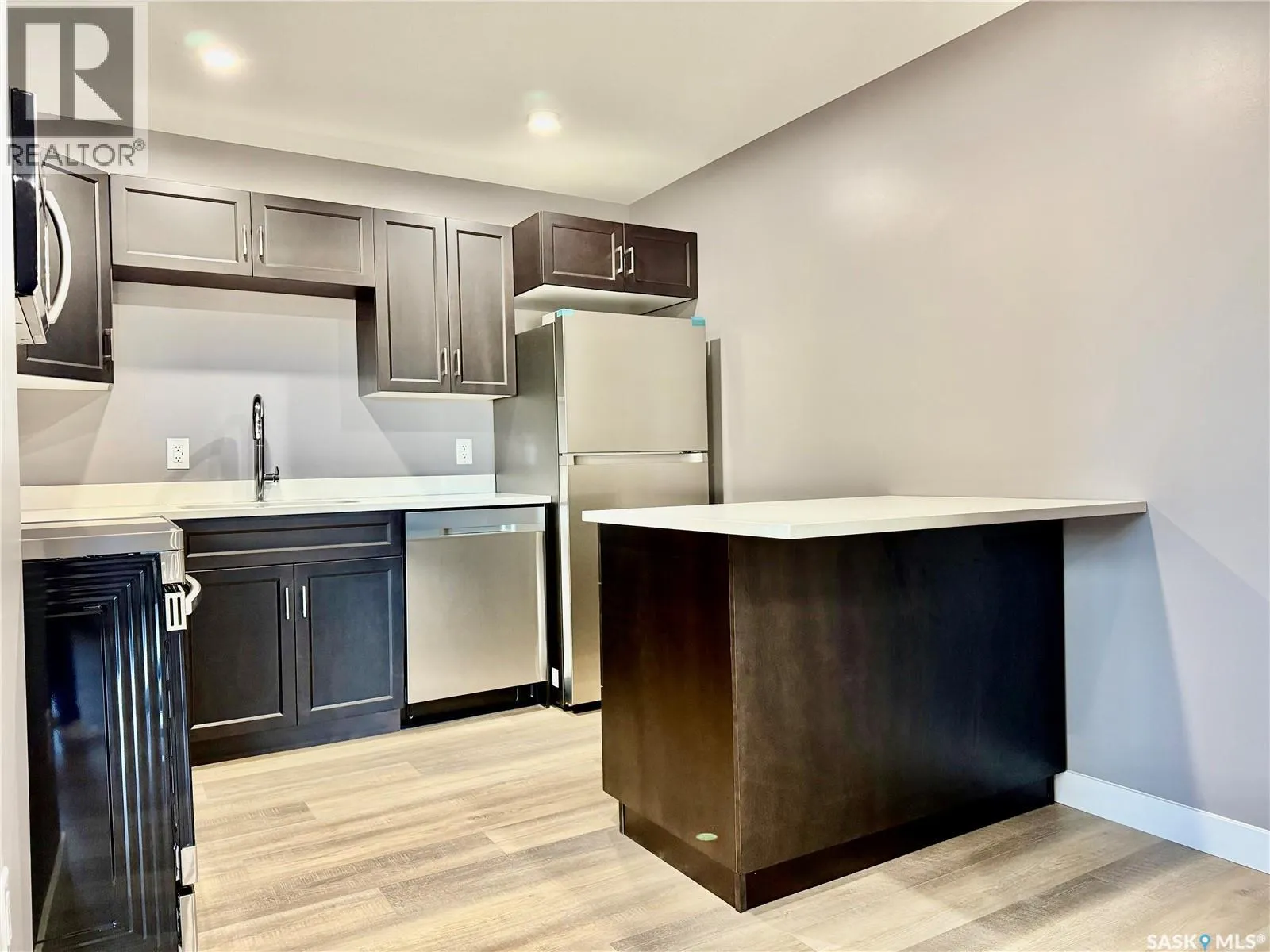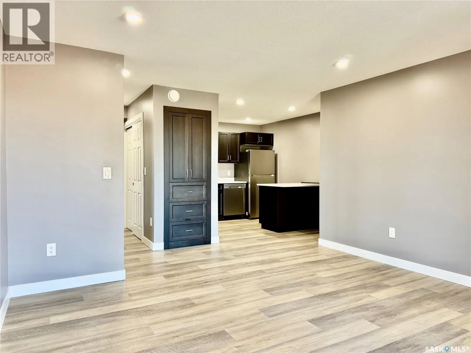Top floor North East facing 2 bedroom condo in Parkland Condominiums with city skyline view! This suite has luxury vinyl plank floors throughout. Entry to unit has good size closet and direct access to In Suite Laundry room with new washer/dryer. Kitchen features new Pine finger joint cabinets with undermount sink & quartz counter tops, also boasting an island with quartz counter top. New fridge, stove, b/i dishwasher, and microwave/rangehood included. Livingroom has patio doors leading to North facing balcony. Down the hall are two bedrooms and a four piece bathroom. Pantry just off kitchen. The primary bedroom has walk in closet and vinyl plank floor. 2nd bedroom has closet and vinyl plank floor. 4 pc bath has new tub/shower, toilet and vanity with undermount sink and quartz counter top. Nice size storage in bathroom as well and vinyl plank floors. The condo will also have new window treatments throughout. One electrified outdoor parking stall included. Don't miss out on this modern unit with a great view of the city skyline! Buyer to contact City of Humboldt regarding taxes. Call today to view! (id:27476)