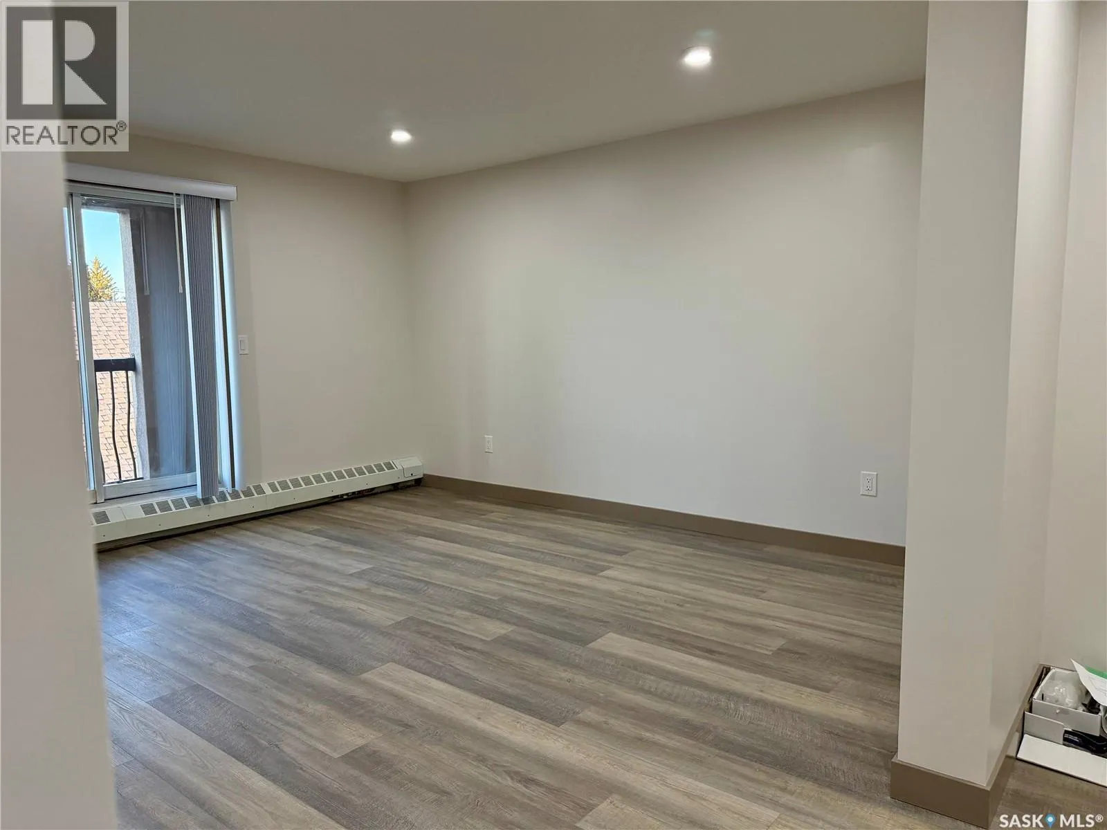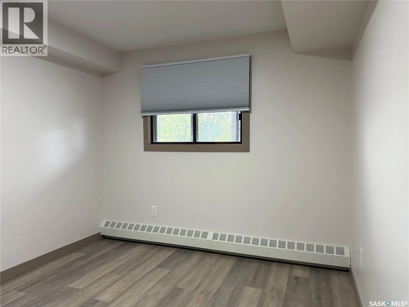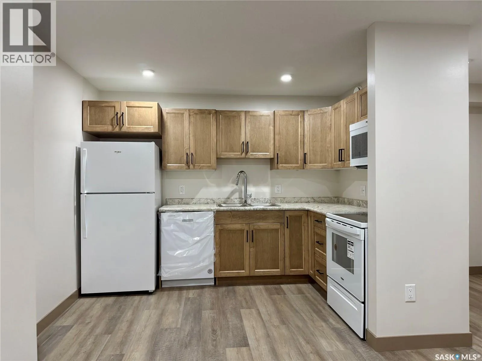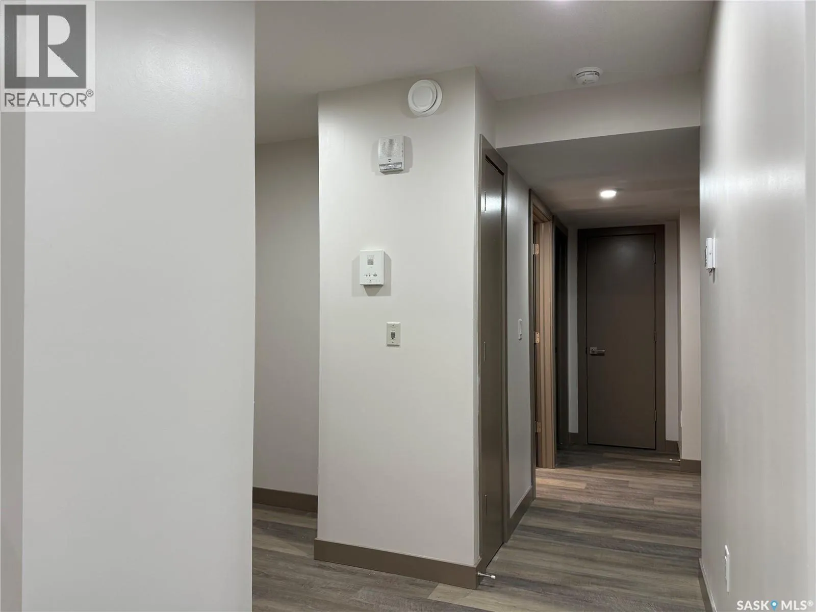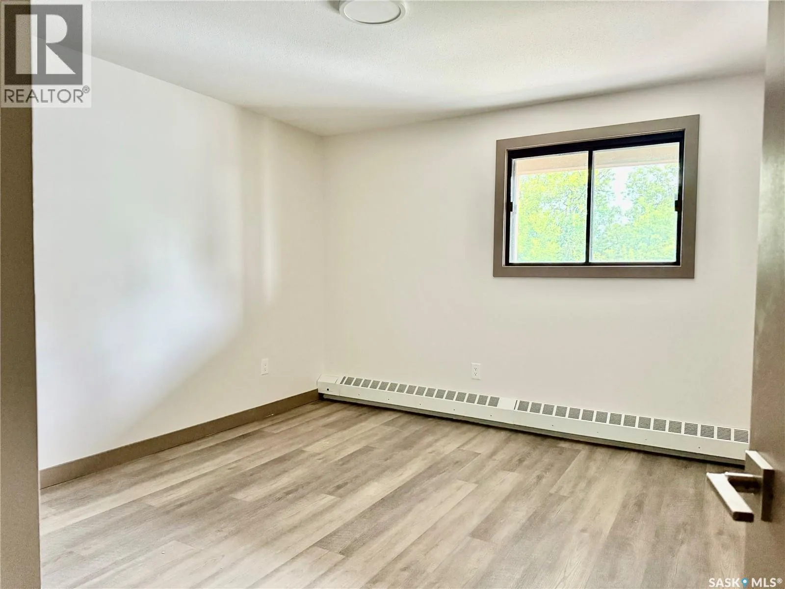 Bright open third floor Condo at Parkland Condominiums for Sale! This 2 bedroom suite has access to balcony overlooking the city skyline just off your living room. Enter this suite into a bright open foyer with Okanagen Desert Canyon vinyl plank floors throughout the unit. The kitchen will have winter maple cabinets with counter tops, fridge, glass top stove, B/I dishwasher and microwave rangehood included. The living room allows lots of natural light through the patio doors and boasts a wall air conditioner. A bright hallway leads you to the two bedrooms with closets. The laundry room is spacious and conveniently located across from bedrooms, includes washer/dryer. A 4 pc bath with winter maple cabinets. The windows and patio doors will have window treatments. One electrified exterior parking stall included. Enjoy living close to downtown, shopping, schools and services. Buyers to contact City of Humboldt for more information regarding taxes. Close to downtown Humboldt and approx 45 min from BHP Jansen Mine site. Call today to view! (id:27476)