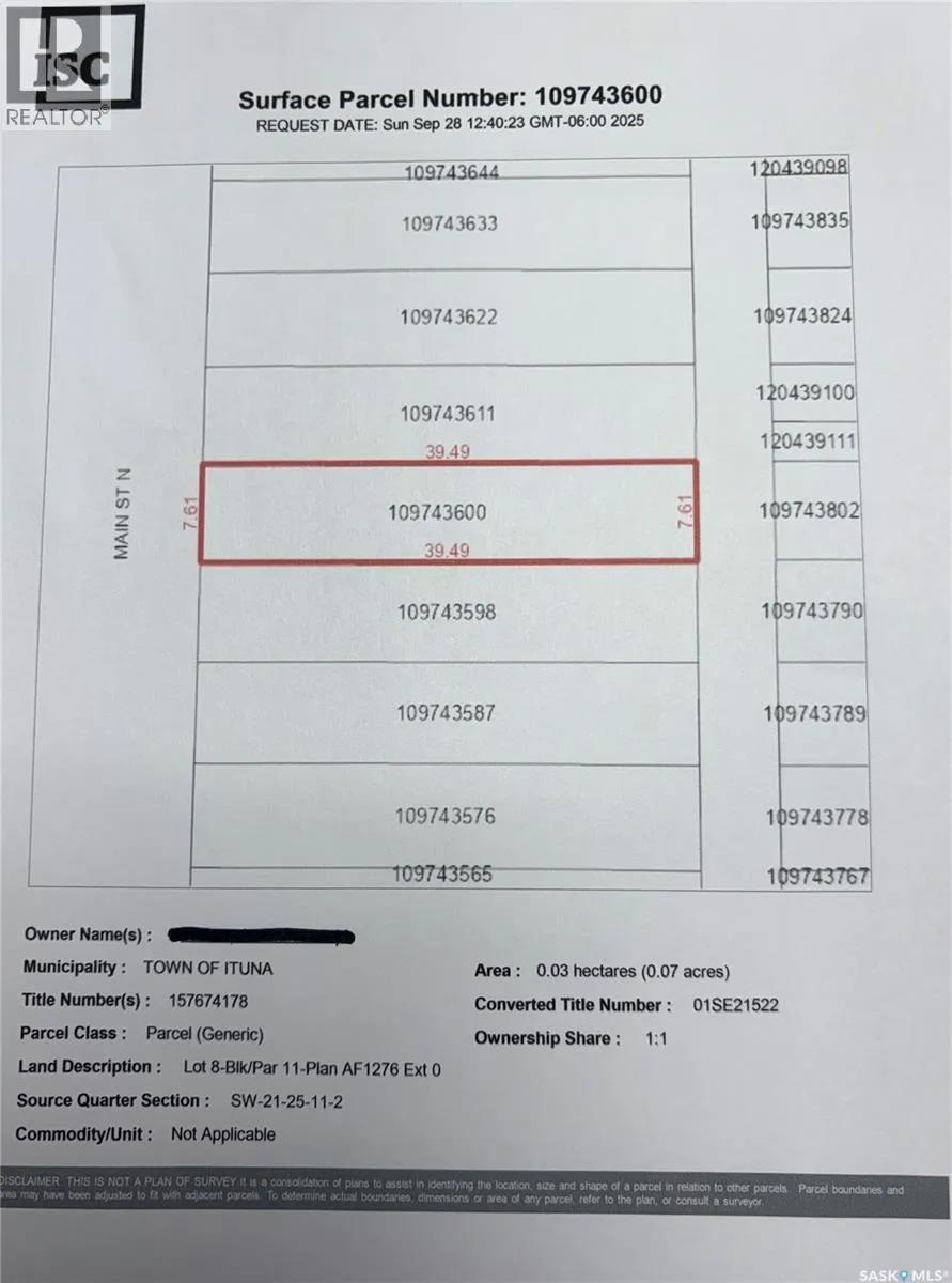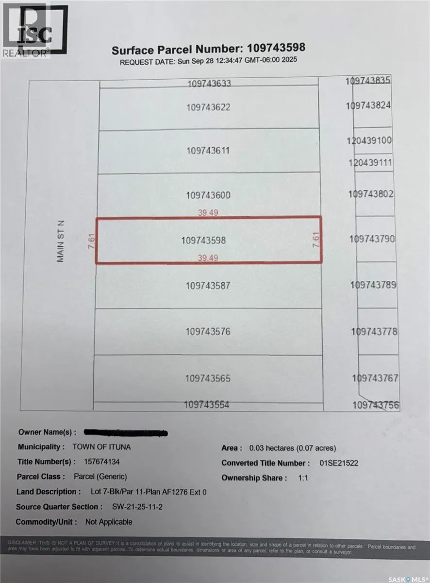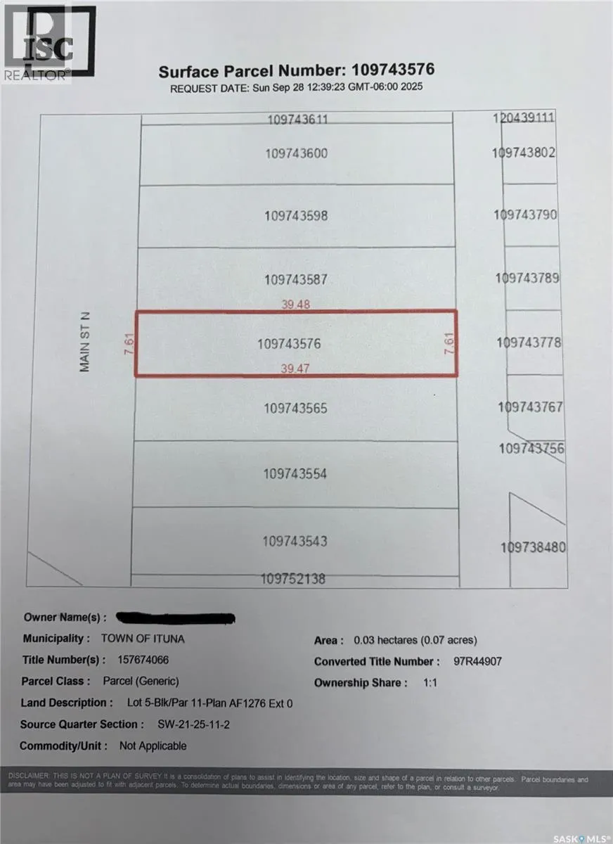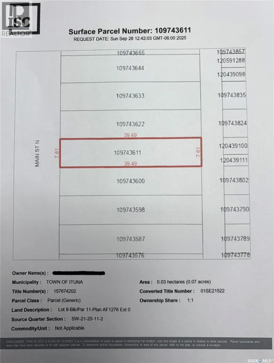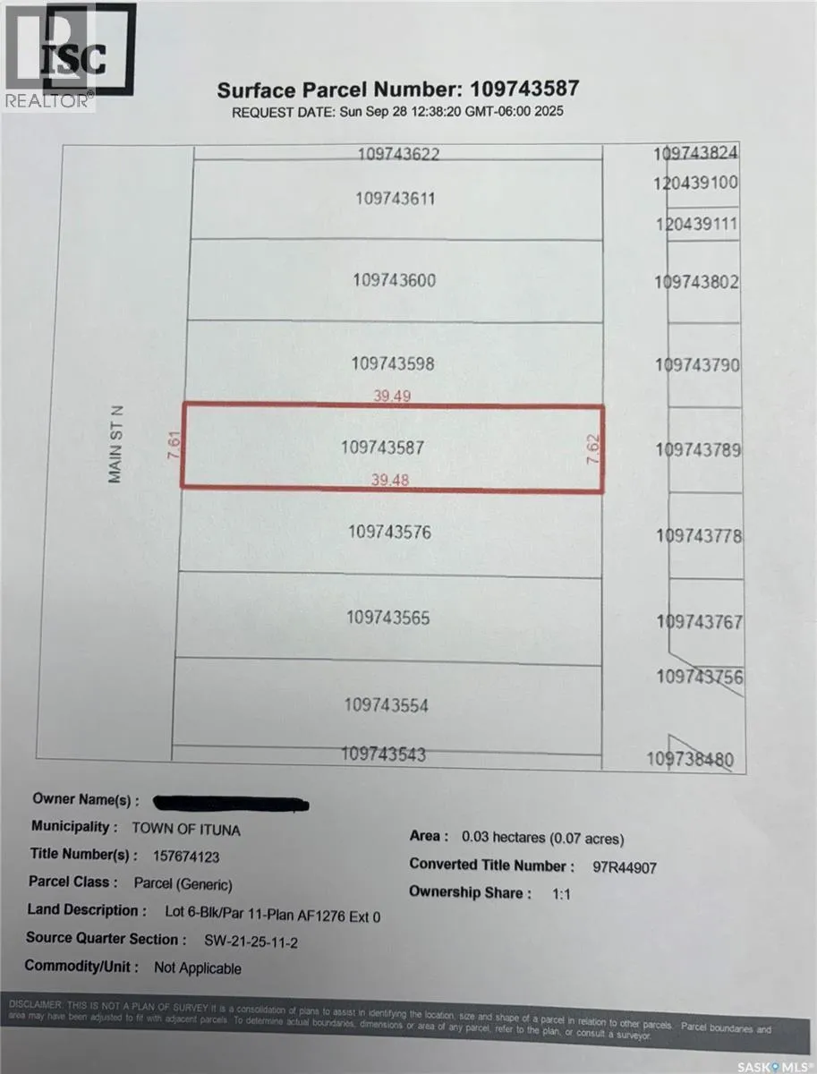 Lot 5,6,7,8,9-Blk/Par 11-Plan AF1276 Ext 0As described on Certificate of Title 97R44907. Fantastic opportunity to build your business in Ituna. High profile location on main street. 5 lots consisting of 16,250 sqft with great exposure and access. Lots 5-9 are being sold as one package deal. (id:27476)