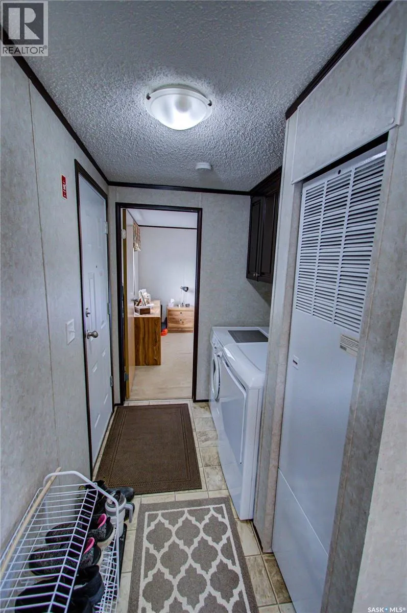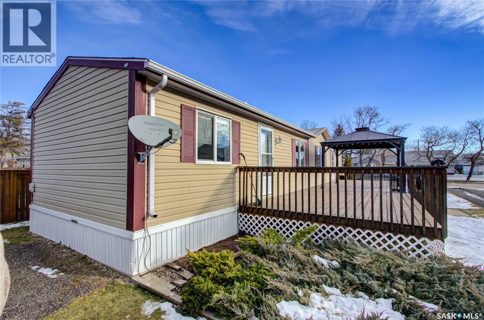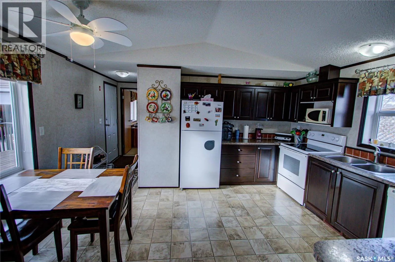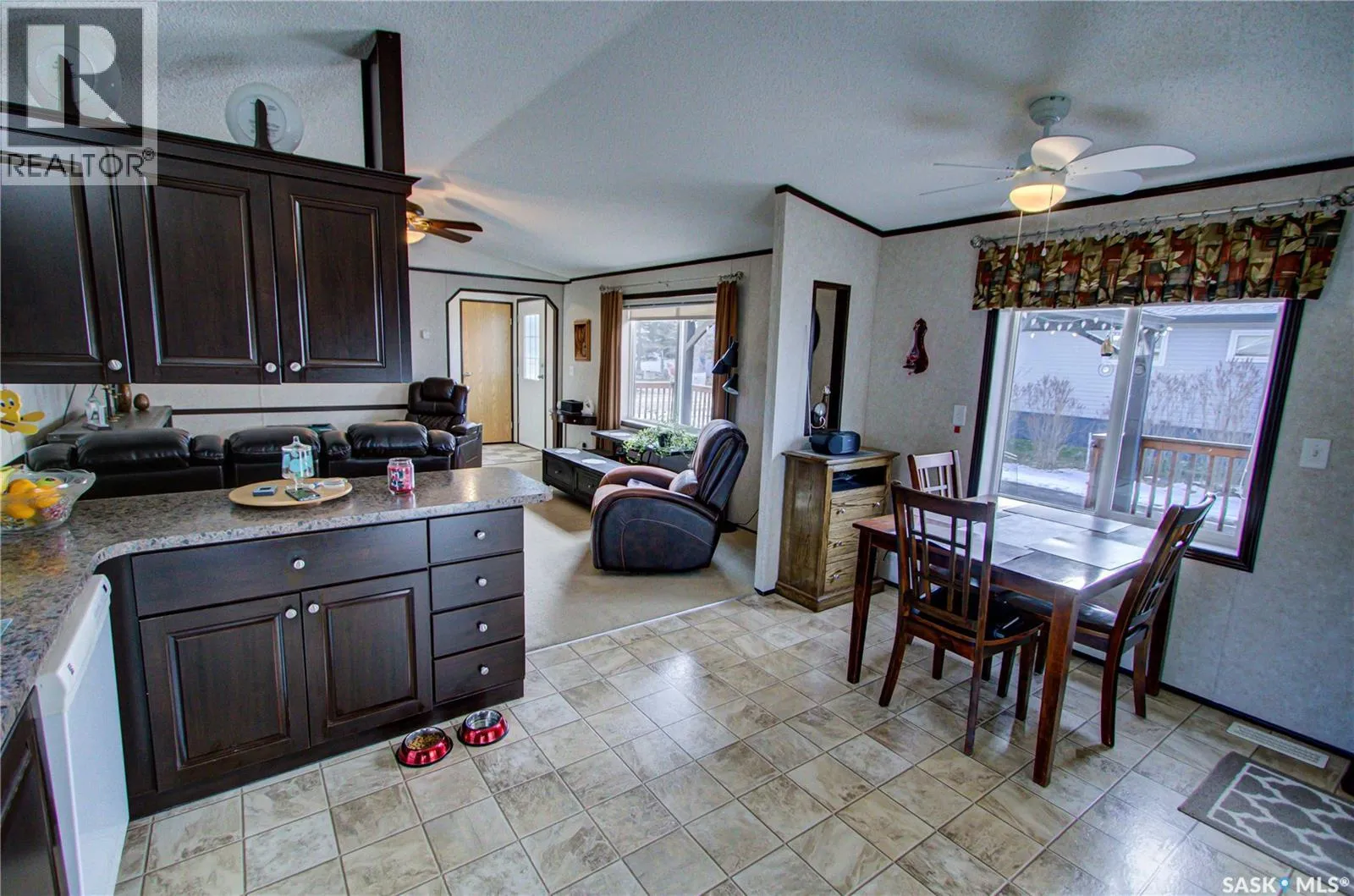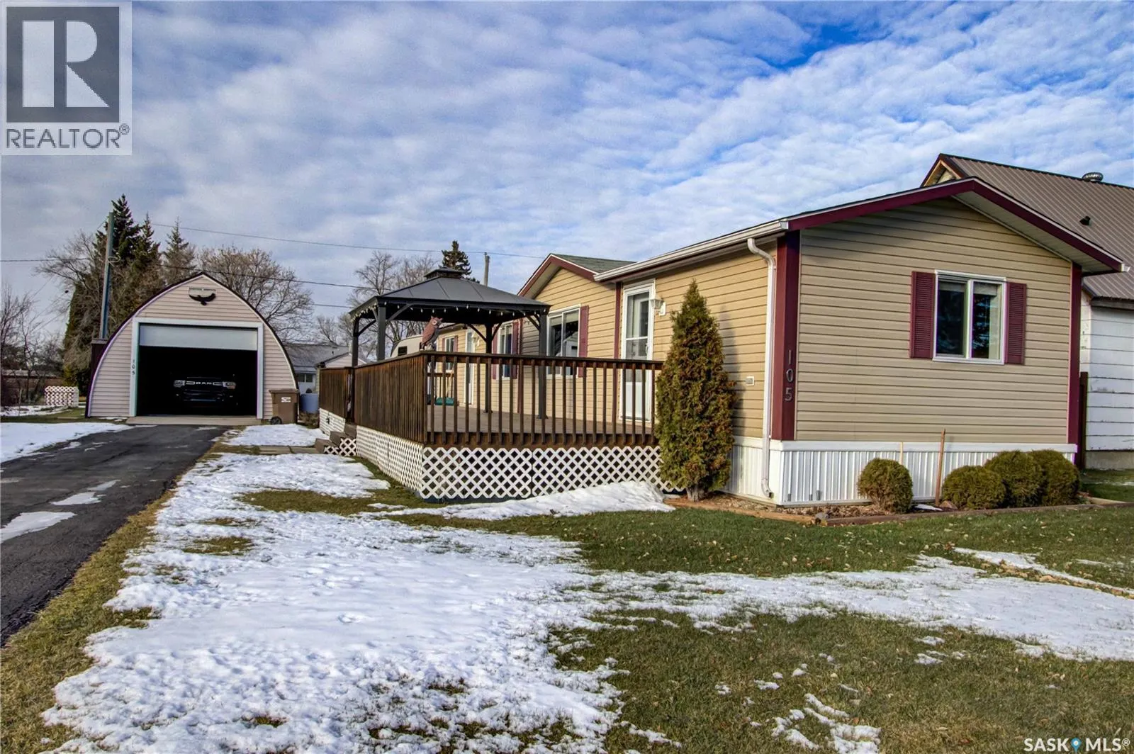 Welcome to Kinistino! This well-kept 970 sq ft modular home (built in 2010) offers affordable, comfortable living in a quiet and friendly community. With 2 bedrooms and 2 bathrooms, this home is an ideal fit for first-time buyers, retirees, or anyone seeking low-maintenance living on a peaceful dead-end street. Step inside to find a bright, clean, and meticulously maintained interior. Fridge and stove new in 2024, dishwasher and dryer in 2020. The functional layout provides great flow, ample natural light, and comfortable living spaces. Outside, enjoy summer evenings on the large west-facing 500 sq ft deck, complete with a gazeboâperfect for relaxing and entertaining. A 588 sq ft Quonset-style detached garage provides sheltered parking or a spacious workshop area. The paved driveway offers plenty of additional parking, while back alley access allows room to park an RV, boat, or other toys with ease. Located in the quiet community of Kinistino, known for its agricultural roots and home to several farm equipment dealerships, this town offers excellent local amenities including a Kâ12 school, gas station, grocery store, nursing home, health clinic, hockey rink, and more. Conveniently situated on Highway 3 between Melfort and Prince Albert, commuting is simple. If you're looking for comfort, convenience, and small-town charm, this property is ready to welcome you home. (id:27476)