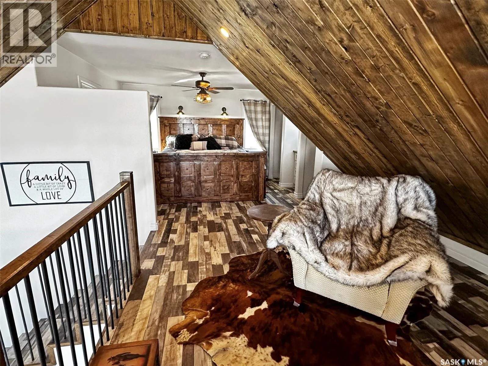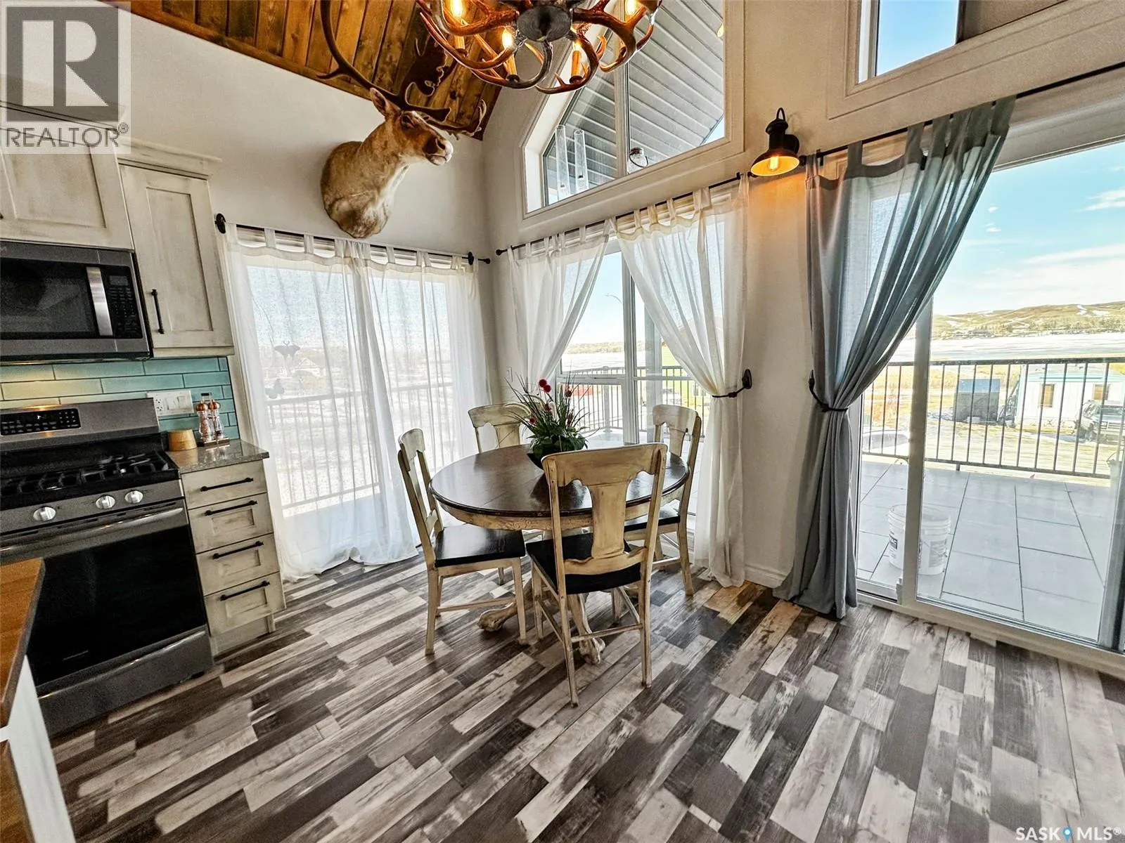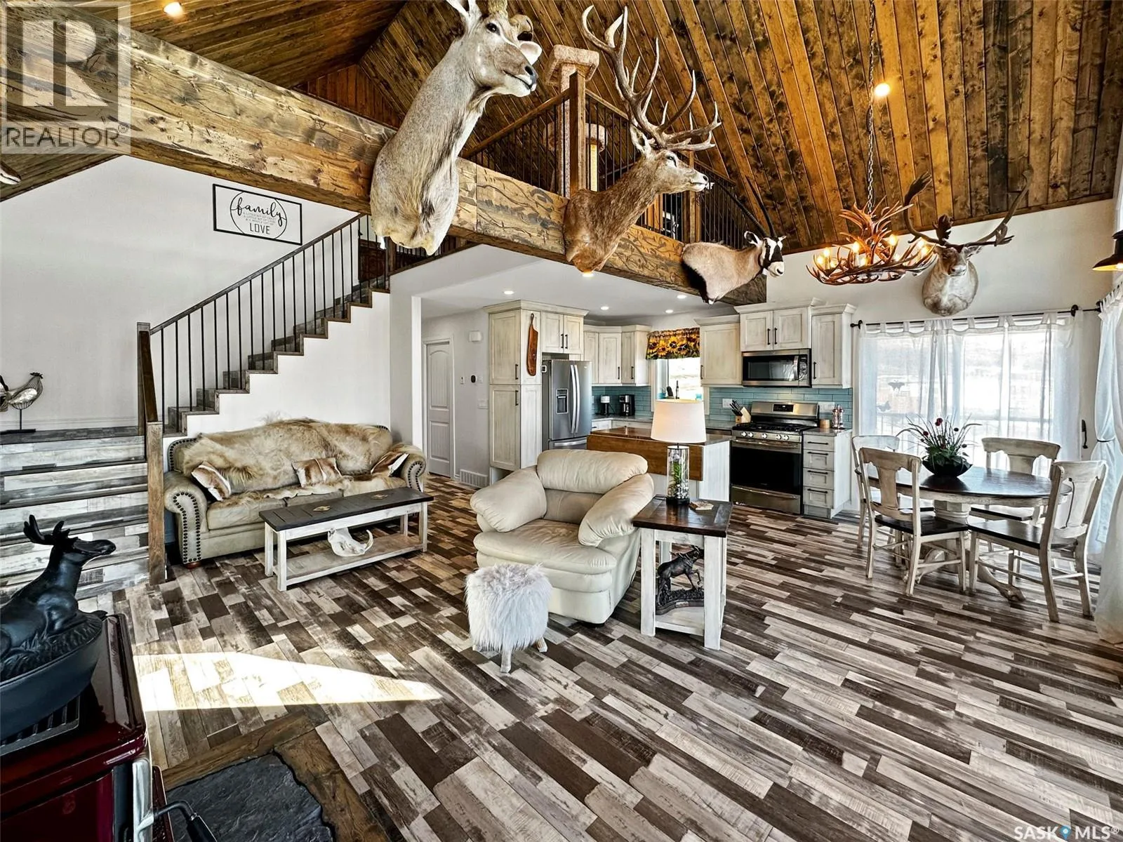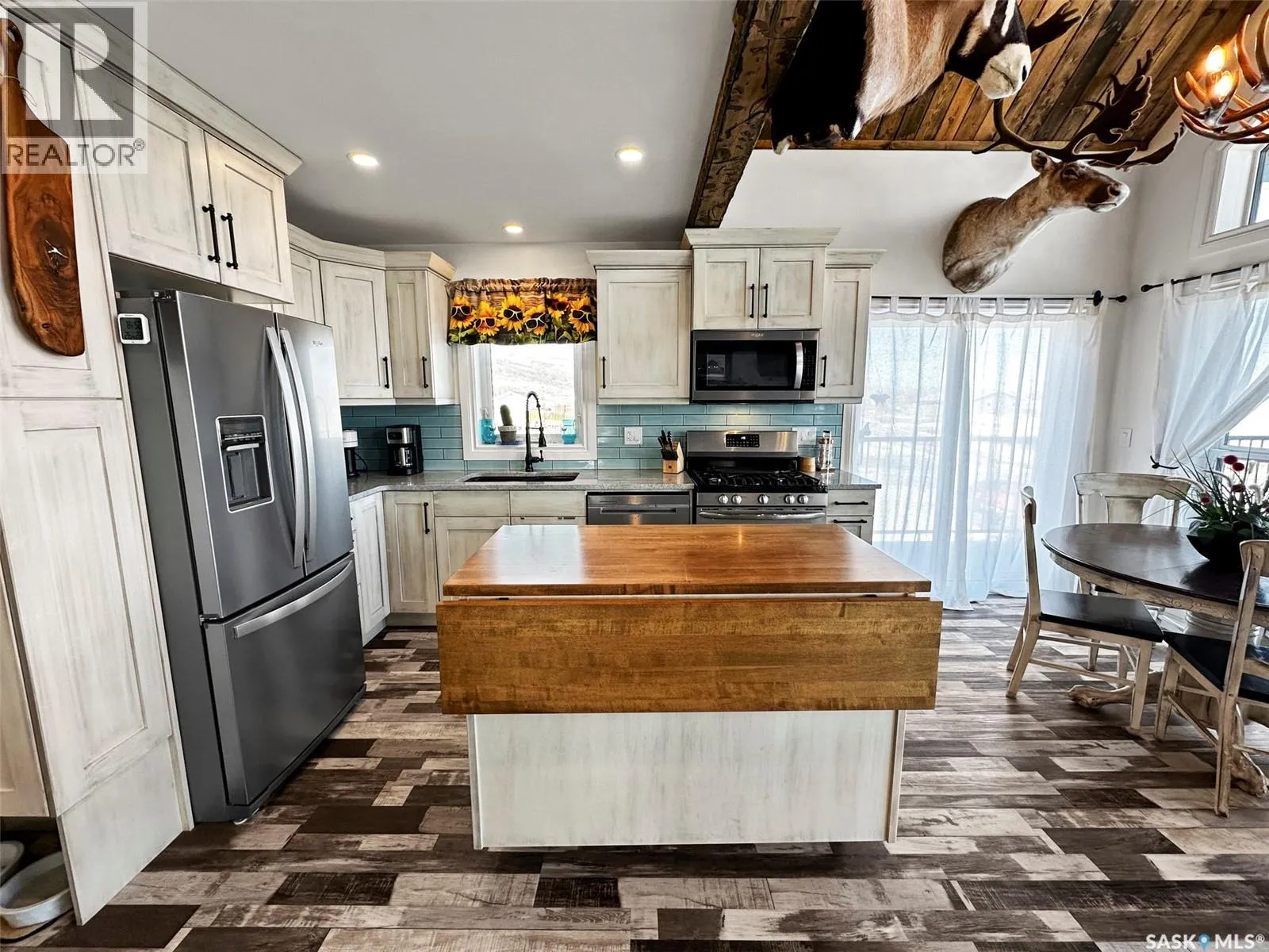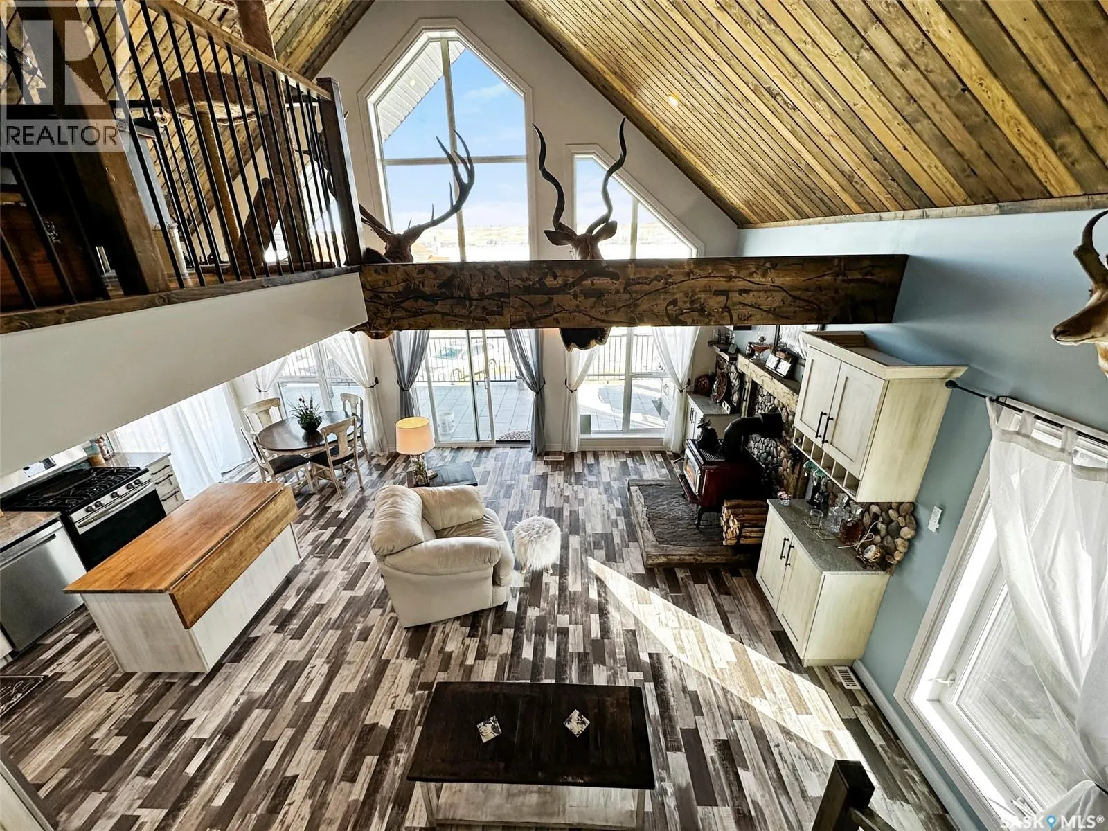 Escape to your own lakeside sanctuary at Lac Pelletier's southwest side w this 4-season ENERGY EFFICIENT A-frame home (ICE panel construction). Built in 2021, this rustic reverse walkout A-frame bungalow won't disappoint! The open concept main floor, adorned w vaulted pine ceilings, has an abundance of windows framing stunning lake views. Vinyl plank flooring throughout for durability. Enjoy the covered deck to the east for peaceful relaxation, while the deck along the north side offers an open-air experience with views of the river hills directly behind the home. Cozy up by the wood-burning fireplace w stone accents, flanked by cabinets including a bar & wine rack. The modern kitchen is a chef's dream, featuring a full stainless steel appliance package, gas range, & a convenient sit-up island. This space seamlessly flows into the loft above, creating a harmonious living environment. The main floor also includes a bedroom, a 4-piece main bath, & a welcoming porch for added convenience. Ascend the open stairwell to the loft area, offering a relaxing space that can dble as an office. The lower walkout level houses a spacious mudroom/laundry area w stacking washer/dryer, a sink, & a modern mechanical room. The dble garage is heated & features a man cave on the south side, while the home is equipped w a high-efficiency furnace, air exchanger, a 2000-gallon septic tank, & connection to the central water line. Majority of furnishings will be included. Embrace the lake life lifestyle w access to the Regional Park's amenities, including a restaurant, 9-hole golf course, licensed clubhouse, mini-golf, boating, fishing, & swimming. This deeded second row property offers a tranquil escape just south of Swift Current, Saskatchewan, at Lac Pelletier Regional Park. Located only 31 km south on Highway #4 and 12 km west on Highway #343, this is your opportunity to own a piece of lakeside paradise! (id:27476)