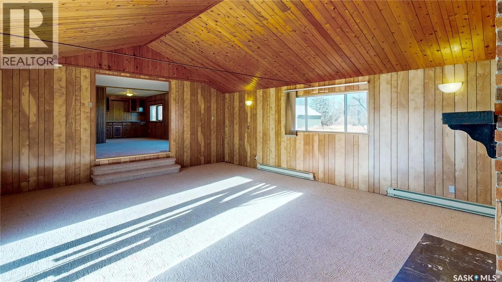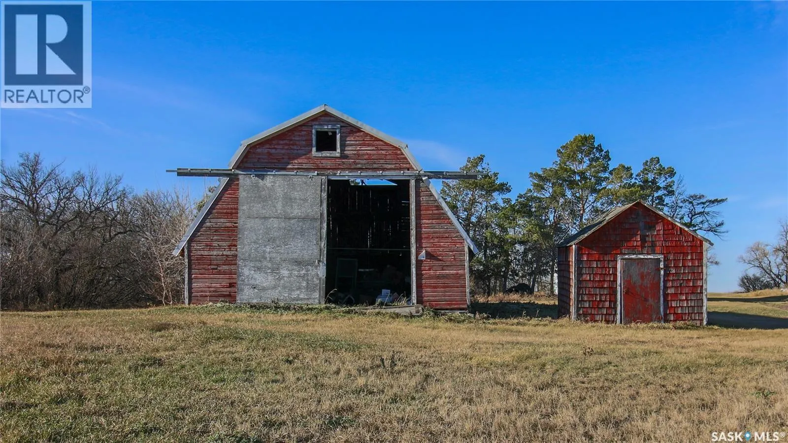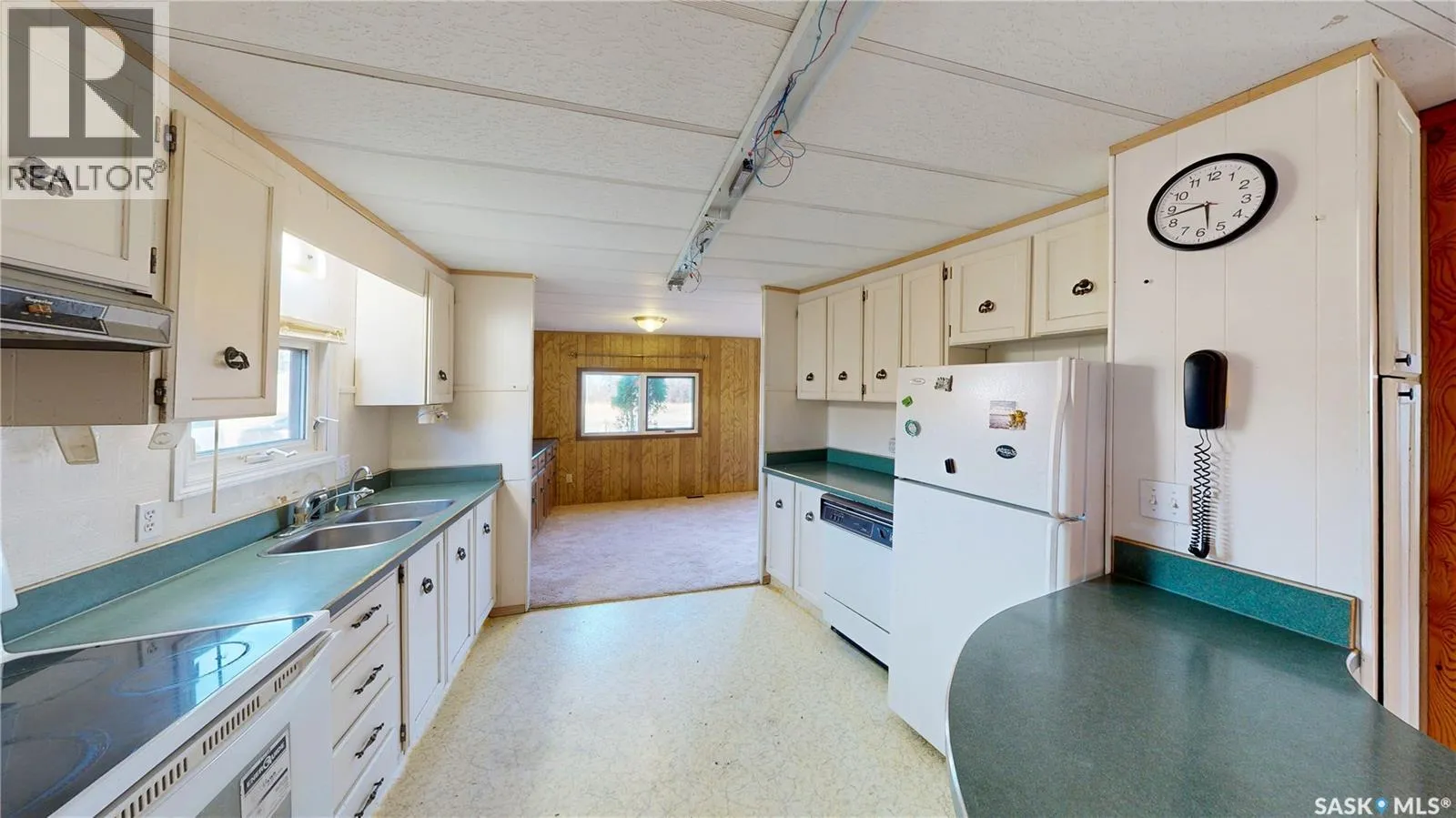 Portion of SE-18-27-22-2 - Pin location on realtor.ca is exact and correct Welcome to the Lakness Acreage nestled in the picturesque Last Mountain Valley. This 1977 built double wide mobile home has both a porch and family room addition bringing its total size to 2,160 square feet. The home has 3 bedrooms, 2 bathrooms and sits on a massive 13.97 sprawling acres of land close to the town of Govan Saskatchewan. The property is well-equipped for farming, storage, and working featuring a 26 x 36 barn, a shed, a 28 x 36 heated workshop, a double attached 24 x 26 garage and a single 14 x 26 garage! You enter the home into the huge mud room with two closets for your outdoor wear, access to the garage and handy storage cabinets. This will also be your future laundry room! Down the staircase is the partial, unfinished basement that houses the owned furnace and gas water heater. The kitchen has ample room for a smaller table and chairs, an island with bar eating and the fridge, stove and dishwasher are all included. The dining room has a built-in dry bar and has space for a table that will seat the whole family! Perfect for hosting large gatherings! The family room has a large bay window overlooking the yard that fills the space with natural light. A step down is the gorgeous additional living room with high ceilings, a wood-burning brick fireplace, and sliding glass doors that lead into the yard. Next are two bedrooms and the main 4 piece bathroom. Finishing off the home is the primary suite with a walk in closet, vanity and 4 piece en suite bathroom! This home also features central air conditioning and a 100 amp electrical panel, an updated roof as well as well water and a septic pump out. (id:27476)