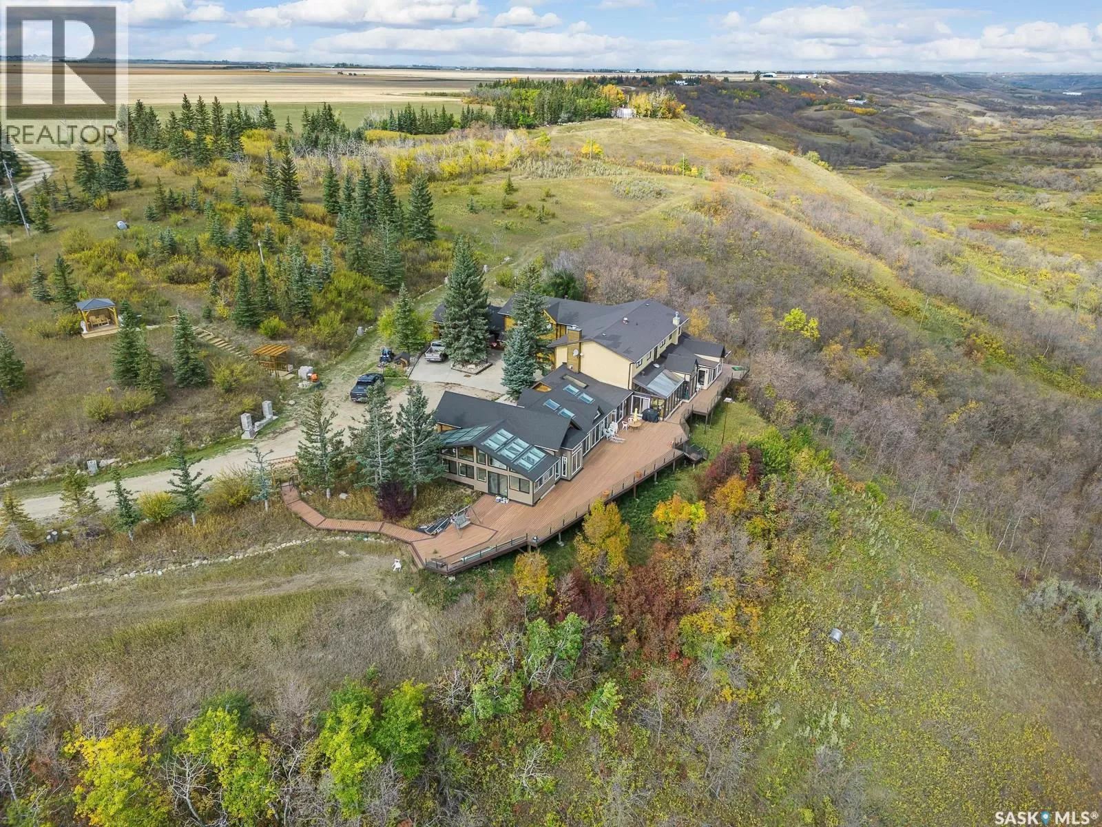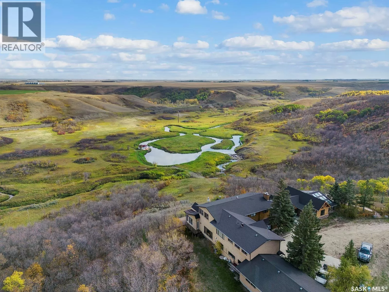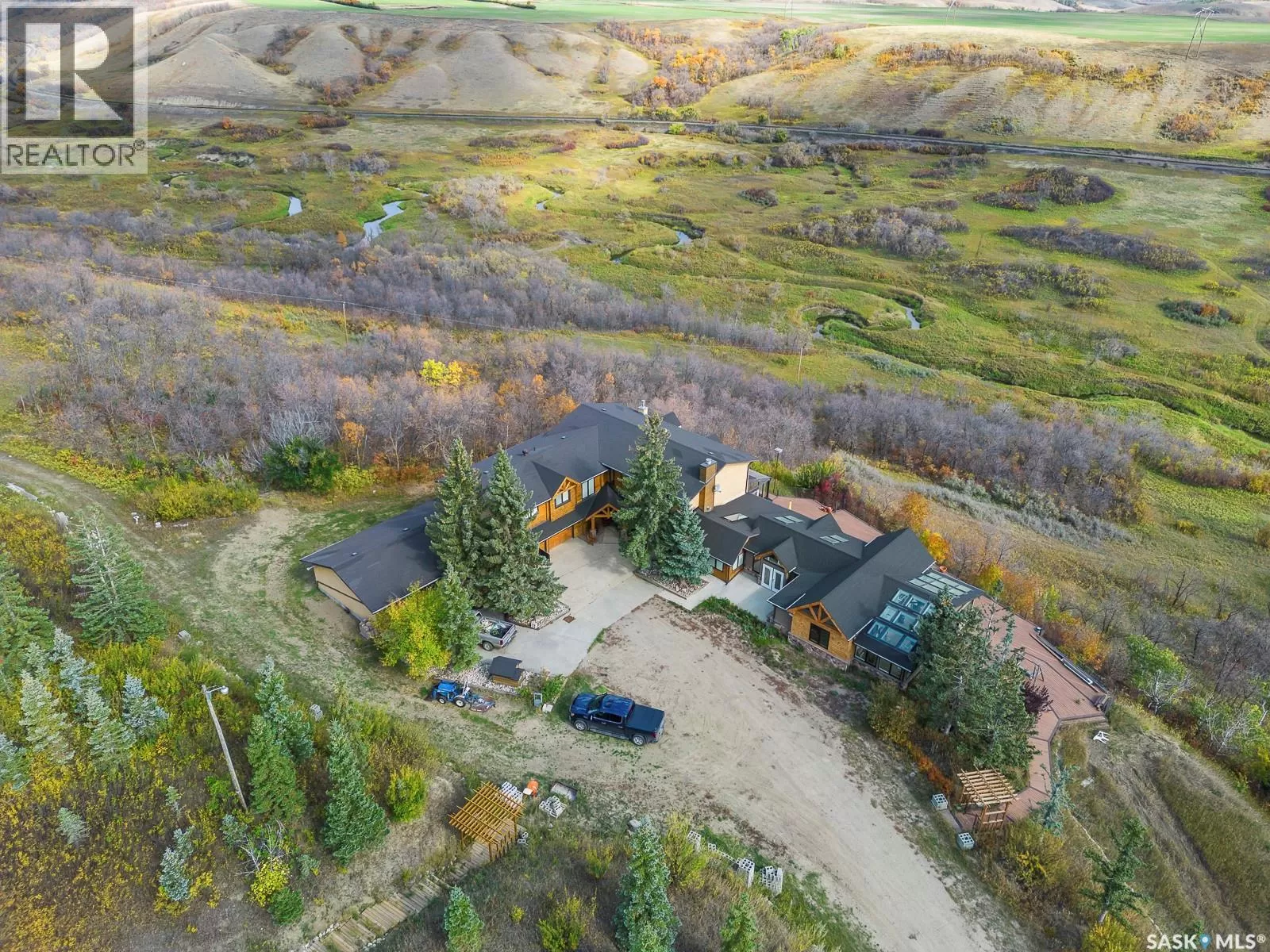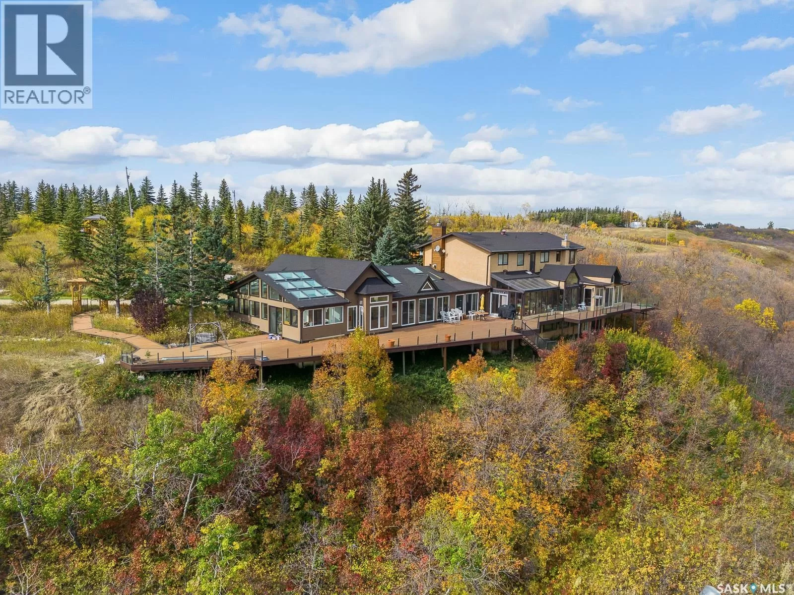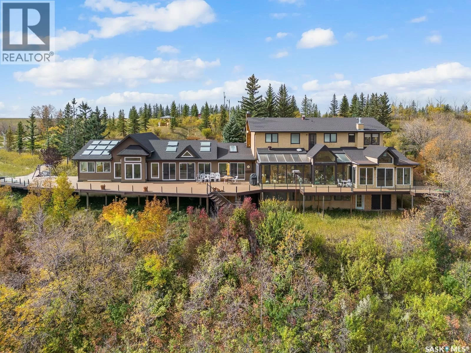 Step into a world where the beauty of nature meets the grace of home. Nestled in the embrace of the Qu'Appelle Valley, this 70-acre sanctuary whispers serenity with every breeze. Here, life moves slower, framed by the endless horizon of the valley and the gentle flow of the river below. As you approach, the grandeur of over 6,000 square feet of living space unfolds before you. The home is a masterpiece, where every detail reflects a deep connection to the land. Four spacious bedrooms and four thoughtfully designed bathrooms offer comfort and peace, while multiple sunrooms flood the space with the golden glow of daylight, inviting nature in. Step out onto the expansive wrap-around deckâa place where time stands still, and the valley stretches as far as the eye can see. From this perch, the river dances in the distance, a constant reminder of the tranquility that surrounds you. An artistâs studio awaits, ready to inspire, surrounded by the quiet beauty of the valley. And for those who cherish hospitality, the guest cottage offers a warm welcome, a retreat within a retreat. The five-car garage stands ready to house your vehicles, or perhaps, the tools for your next great adventure. And when the day is done, immerse yourself in the luxurious swim spa, watching the stars as they appear, one by one, in the vast sky above. This property is more than a homeâitâs a place where art, nature, and life come together in perfect harmony. All just 15 minutes from the heart of Regina. Adding value to this property is the 1 bedroom guest house in the valley, over looking the river. (id:27476)