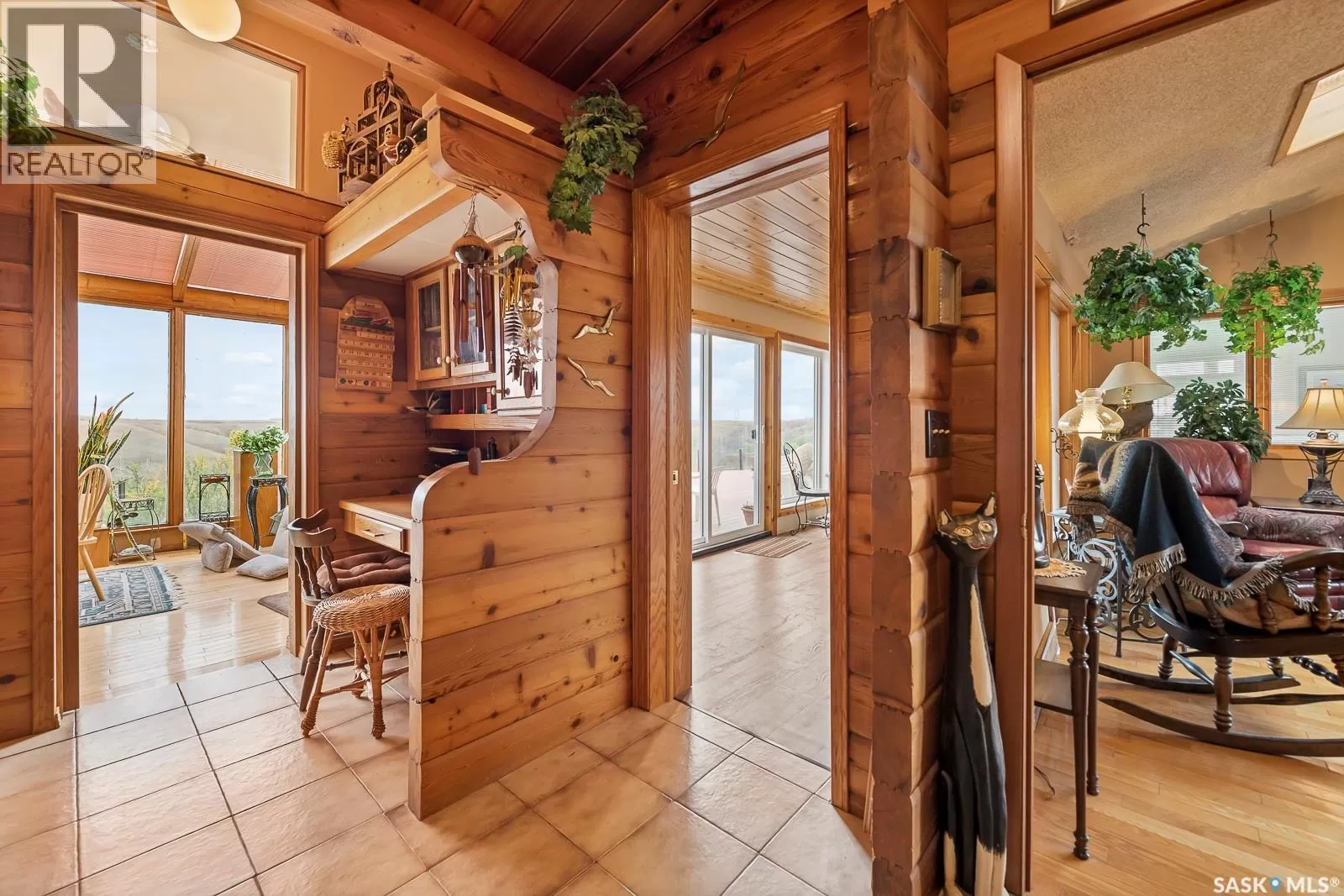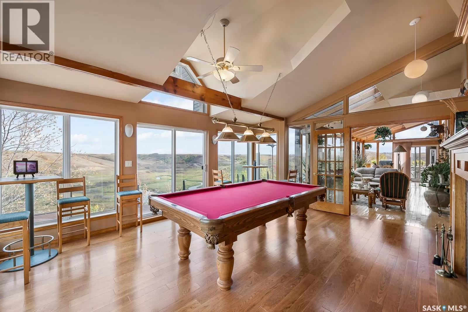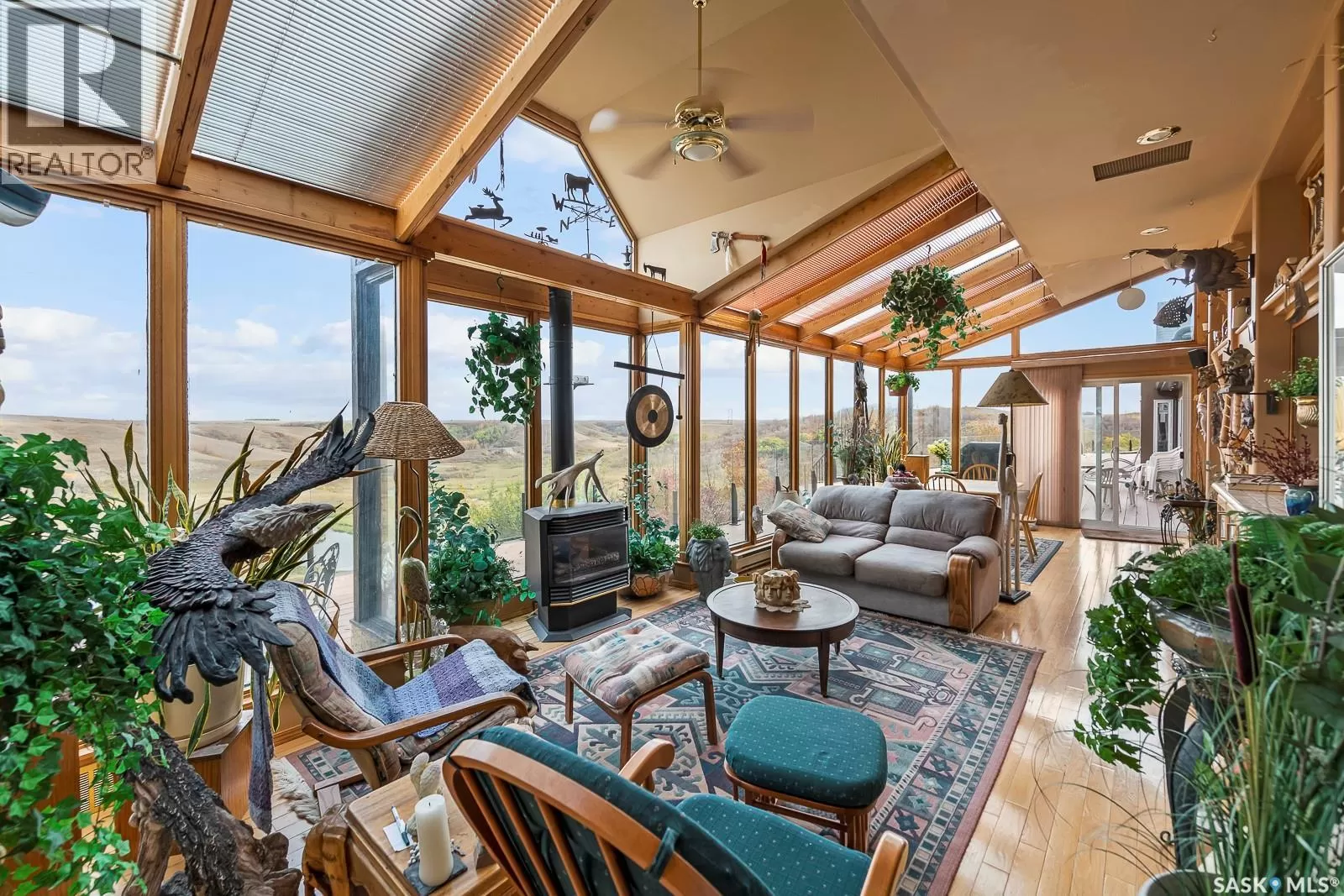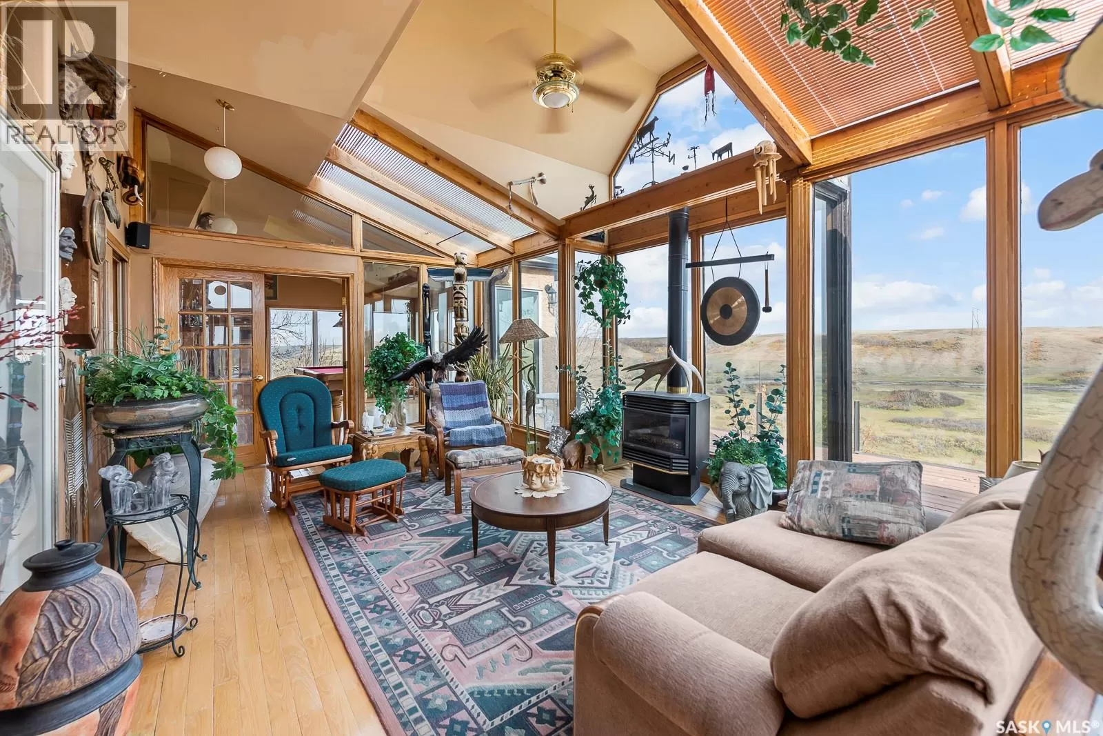 Step into a world where the beauty of nature meets the grace of home. Nestled in the embrace of the Qu'Appelle Valley, this 70-acre sanctuary whispers serenity with every breeze. Here, life moves slower, framed by the endless horizon of the valley and the gentle flow of the river below. As you approach, the grandeur of over 6,000 square feet of living space unfolds before you. The home is a masterpiece, where every detail reflects a deep connection to the land. Four spacious bedrooms and four thoughtfully designed bathrooms offer comfort and peace, while multiple sunrooms flood the space with the golden glow of daylight, inviting nature in. Step out onto the expansive wrap-around deckâa place where time stands still, and the valley stretches as far as the eye can see. From this perch, the river dances in the distance, a constant reminder of the tranquility that surrounds you. An artistâs studio awaits, ready to inspire, surrounded by the quiet beauty of the valley. And for those who cherish hospitality, the guest cottage offers a warm welcome, a retreat within a retreat. The five-car garage stands ready to house your vehicles, or perhaps, the tools for your next great adventure. And when the day is done, immerse yourself in the luxurious swim spa, watching the stars as they appear, one by one, in the vast sky above. This property is more than a homeâitâs a place where art, nature, and life come together in perfect harmony. All just 15 minutes from the heart of Regina. Adding value to this property is the 1 bedroom guest house in the valley, over looking the river. (id:27476)