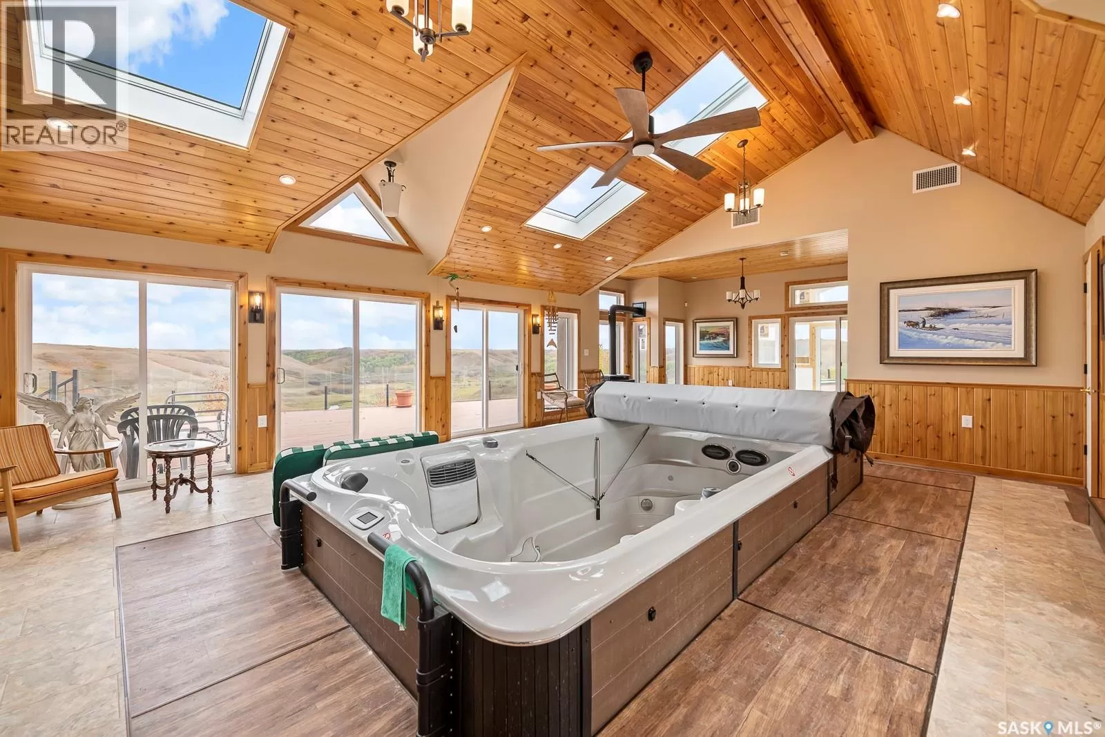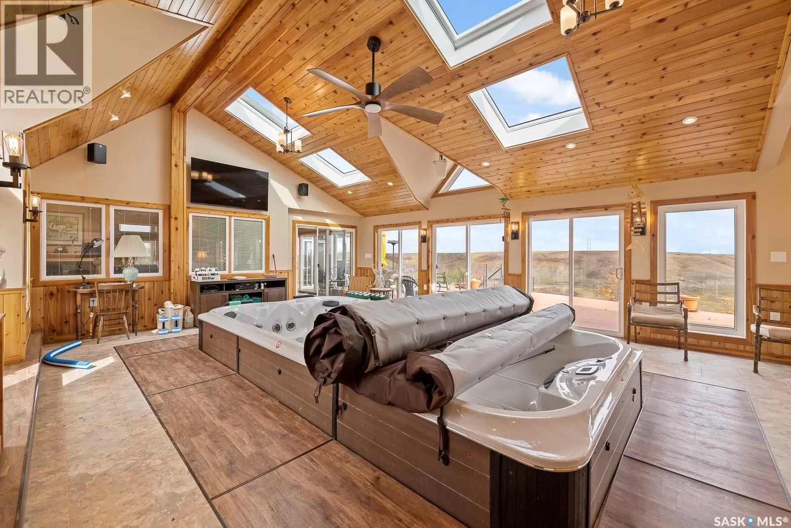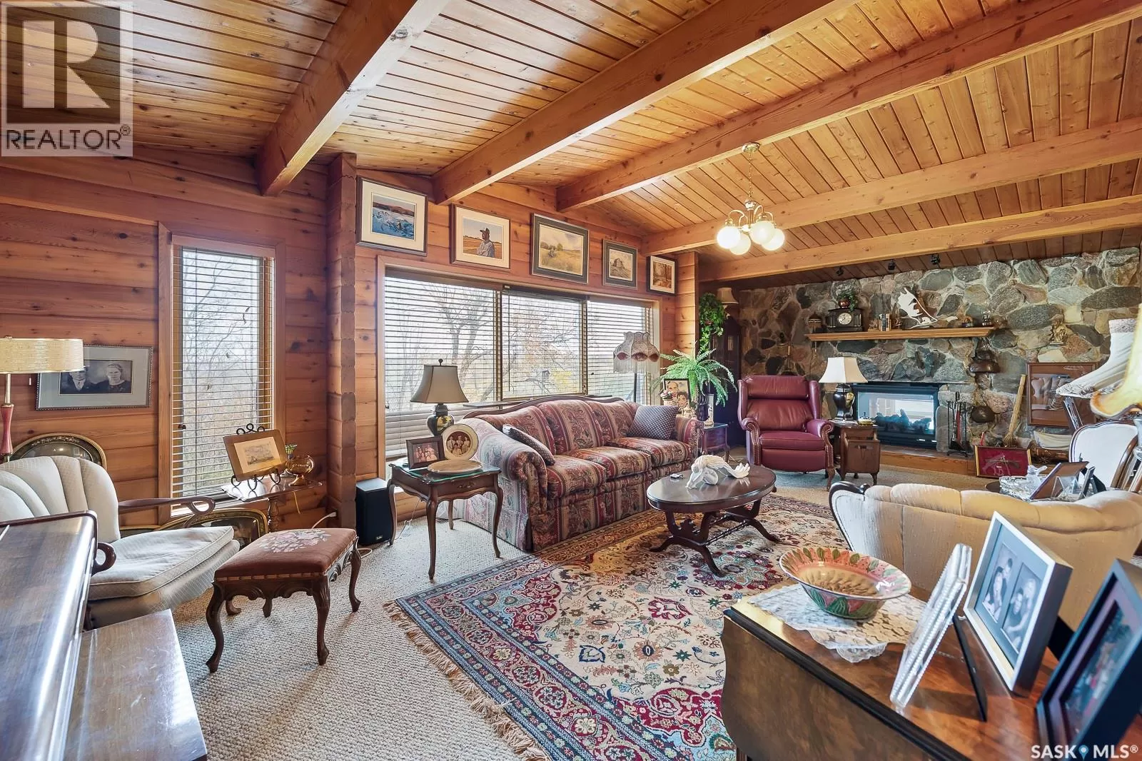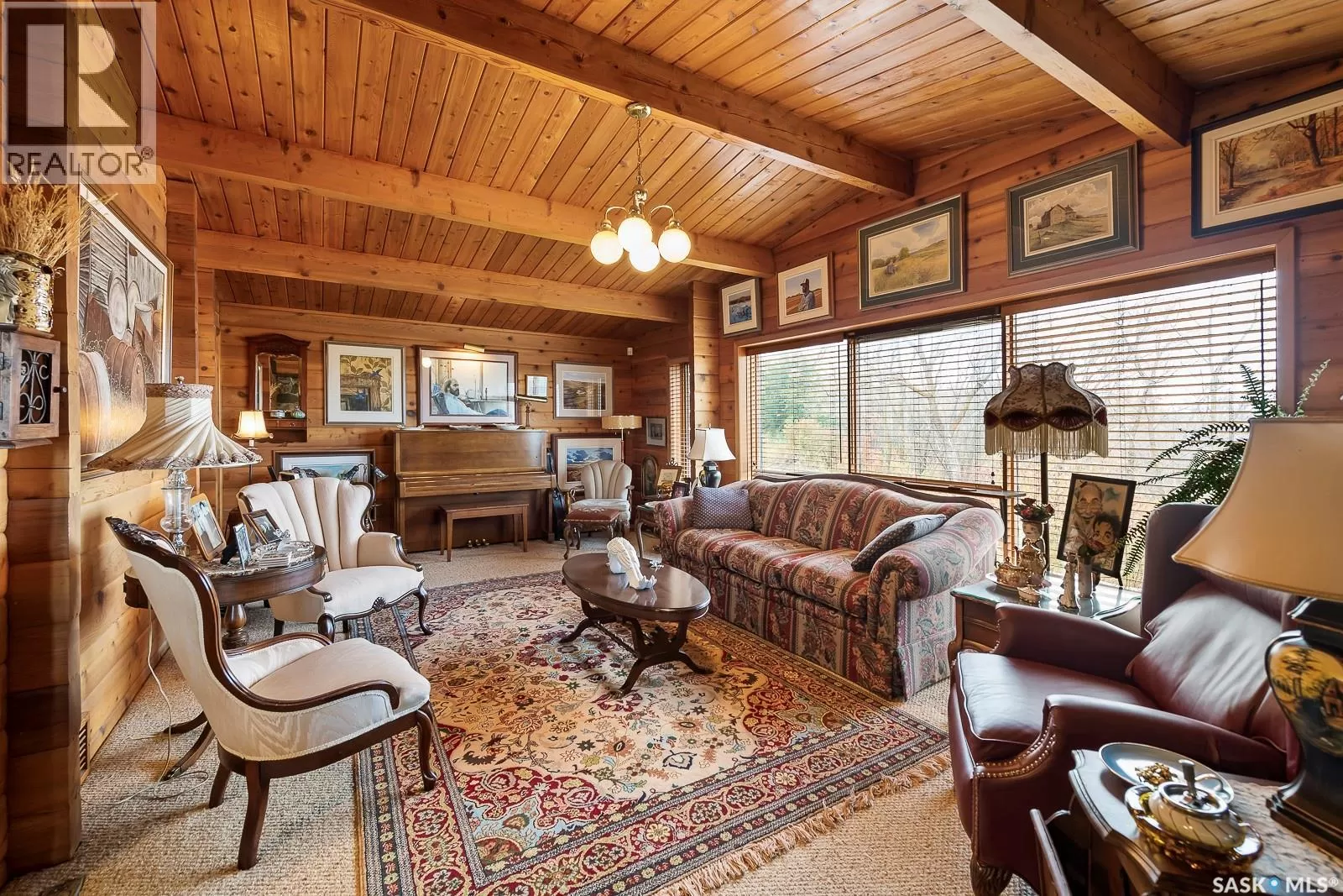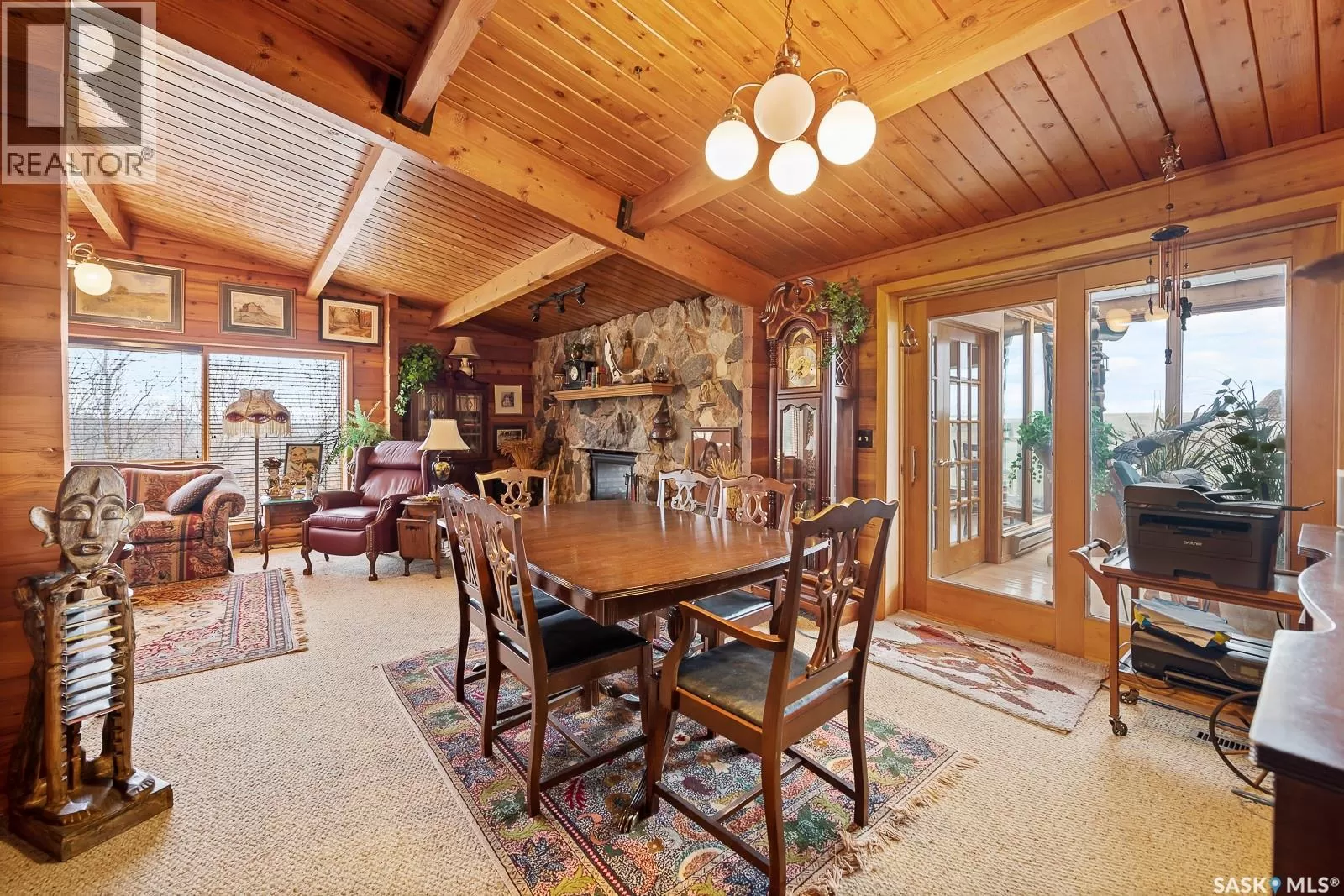 Step into a world where the beauty of nature meets the grace of home. Nestled in the embrace of the Qu'Appelle Valley, this 70-acre sanctuary whispers serenity with every breeze. Here, life moves slower, framed by the endless horizon of the valley and the gentle flow of the river below. As you approach, the grandeur of over 6,000 square feet of living space unfolds before you. The home is a masterpiece, where every detail reflects a deep connection to the land. Four spacious bedrooms and four thoughtfully designed bathrooms offer comfort and peace, while multiple sunrooms flood the space with the golden glow of daylight, inviting nature in. Step out onto the expansive wrap-around deckâa place where time stands still, and the valley stretches as far as the eye can see. From this perch, the river dances in the distance, a constant reminder of the tranquility that surrounds you. An artistâs studio awaits, ready to inspire, surrounded by the quiet beauty of the valley. And for those who cherish hospitality, the guest cottage offers a warm welcome, a retreat within a retreat. The five-car garage stands ready to house your vehicles, or perhaps, the tools for your next great adventure. And when the day is done, immerse yourself in the luxurious swim spa, watching the stars as they appear, one by one, in the vast sky above. This property is more than a homeâitâs a place where art, nature, and life come together in perfect harmony. All just 15 minutes from the heart of Regina. Adding value to this property is the 1 bedroom guest house in the valley, over looking the river. (id:27476)