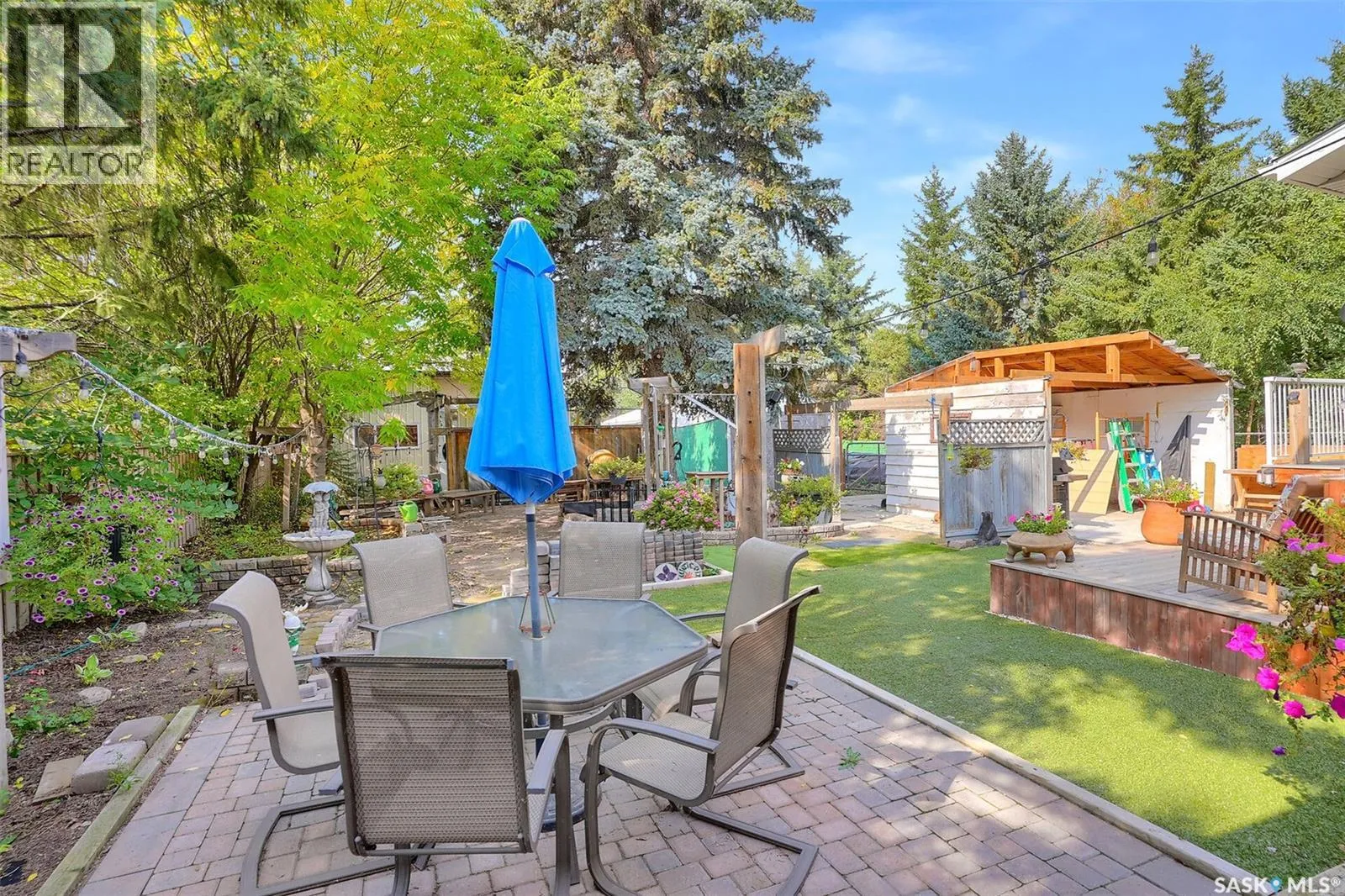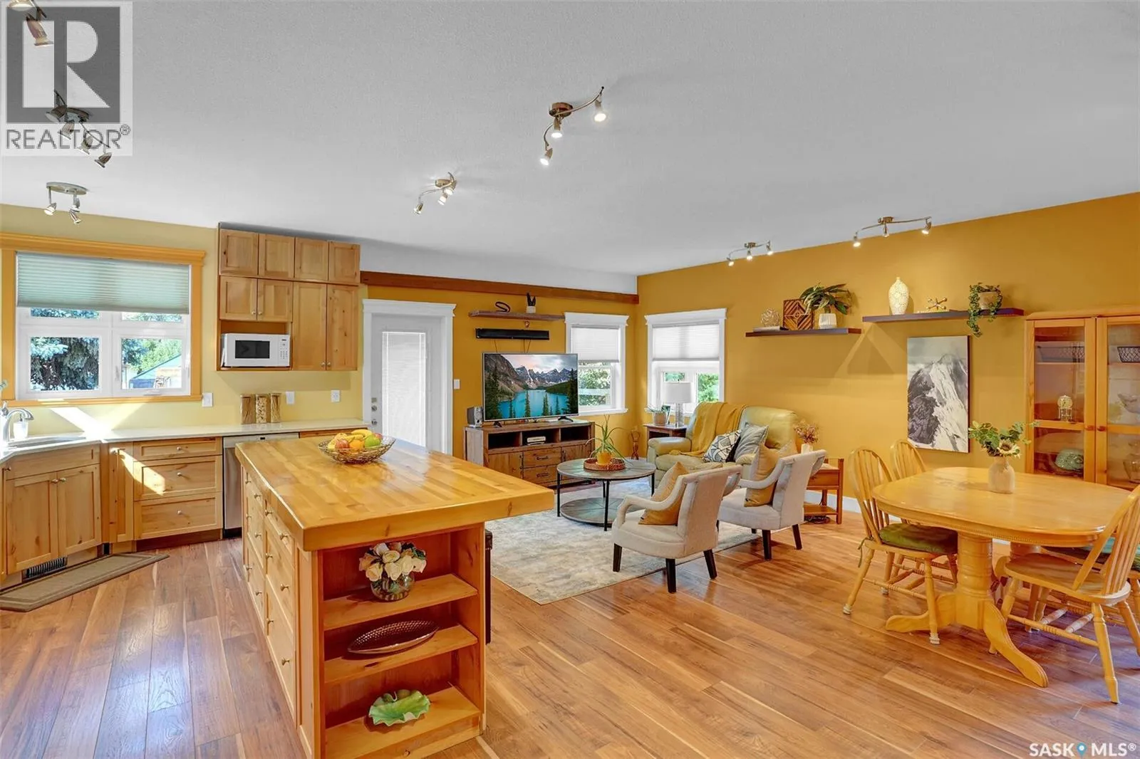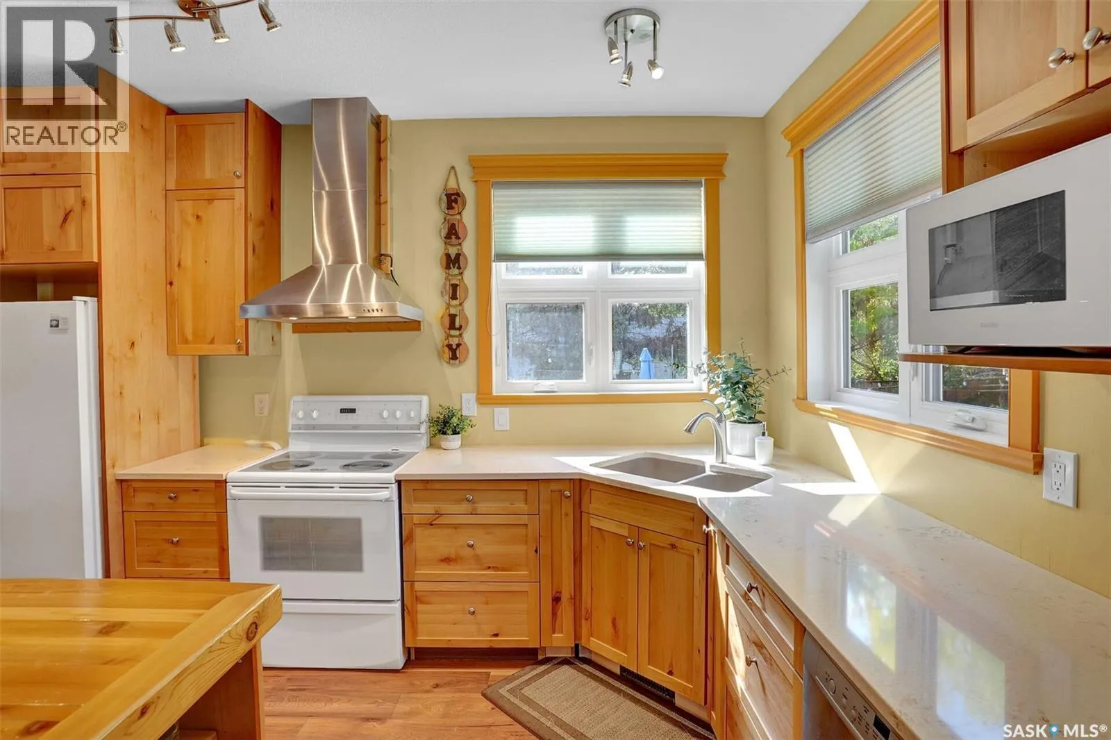 Welcome to 730 James St N! Nestled in the vibrant community of Lumsden, this home offers the charm of small-town living while being just 15 minutes from all the conveniences of the city. With over 1,800 sq ft of thoughtfully designed living space and countless updates throughout, this property is move-in ready. The heart of the home is its open-concept family, dining, and kitchen areaâperfect for entertaining or everyday living. The seller has even pre-planned for future expansion with an LVL beam already in place should you wish to extend the west wall. The kitchen is a true showpiece, featuring a stunning 300-year-old cedar wood island top, beautifully restored and serving as the focal point of the space. With abundant cabinetry, expansive counterspace, a walk-in pantry, and room for two fridges or freezers, this kitchen is a chefâs dream. Down the hall, youâll find a practical mudroom, four generously sized bedrooms with fresh flooring and paint, and two stylishly updated bathrooms. Highlights include a custom tile shower, a deep soaker tub, and modern vanities. A large laundry/storage room completes this well designed space, and direct access to the insulated single attached garage add to the convenience. The basement provides additional potential, offering a spacious unfinished area ready for your personal touch. Outdoors, the nearly 1/3-acre yard is a private retreat. Mature trees, stone patios, custom pergolas, rock gardens, and xeriscaping create a low-maintenance yet beautiful space to relax or entertain. For hobbyists or entrepreneurs, the fully insulated and heated workshop off the back alley is a standout feature, providing year-round workspace. All tools and wood supplies are negotiable. This home is truly the best of both worldsâsmall-town charm, city proximity, and a property brimming with opportunity. Value added items include: PVC windows, shingles Sept 2025, all 6 appliances, central air, garburator, 3 electrical panels, and more! (id:27476)