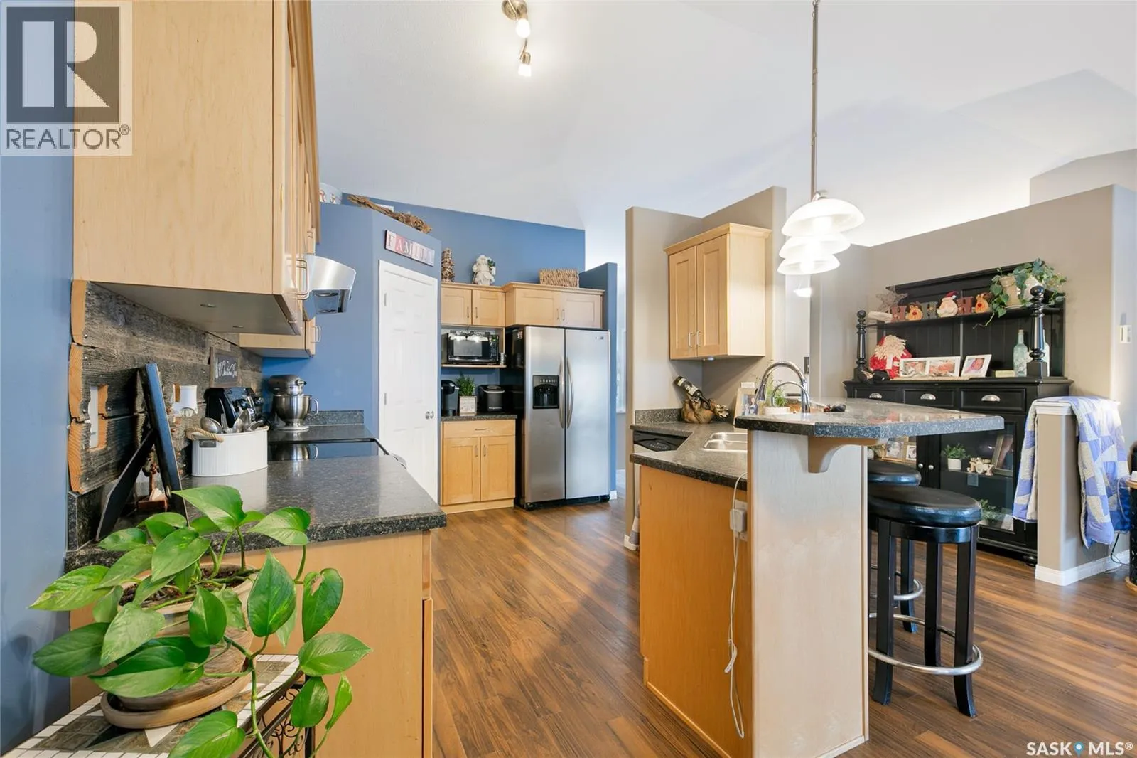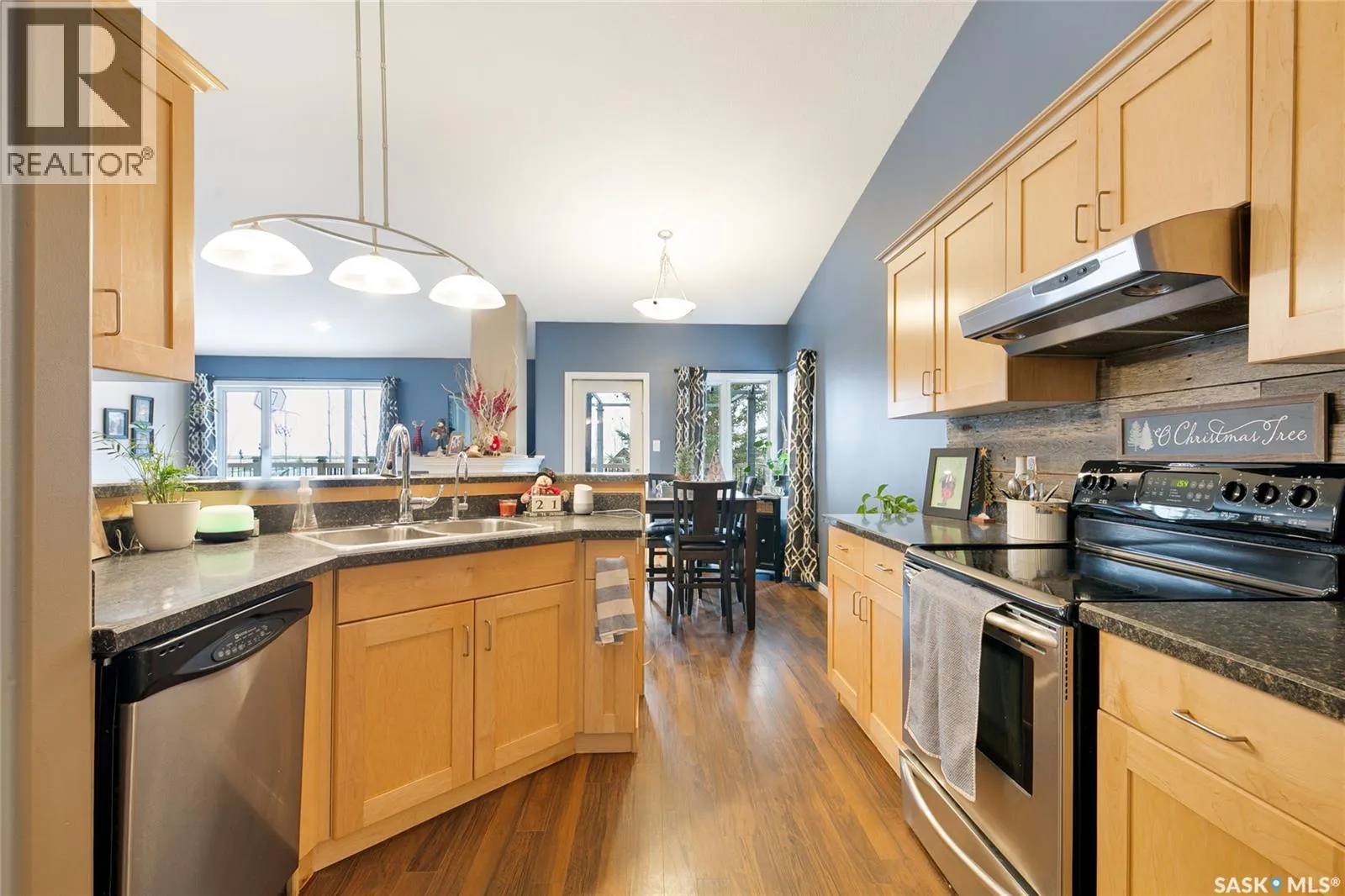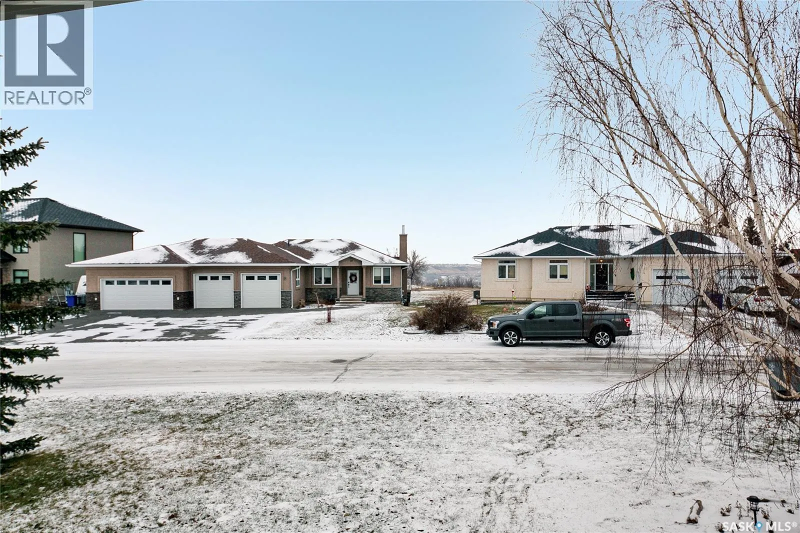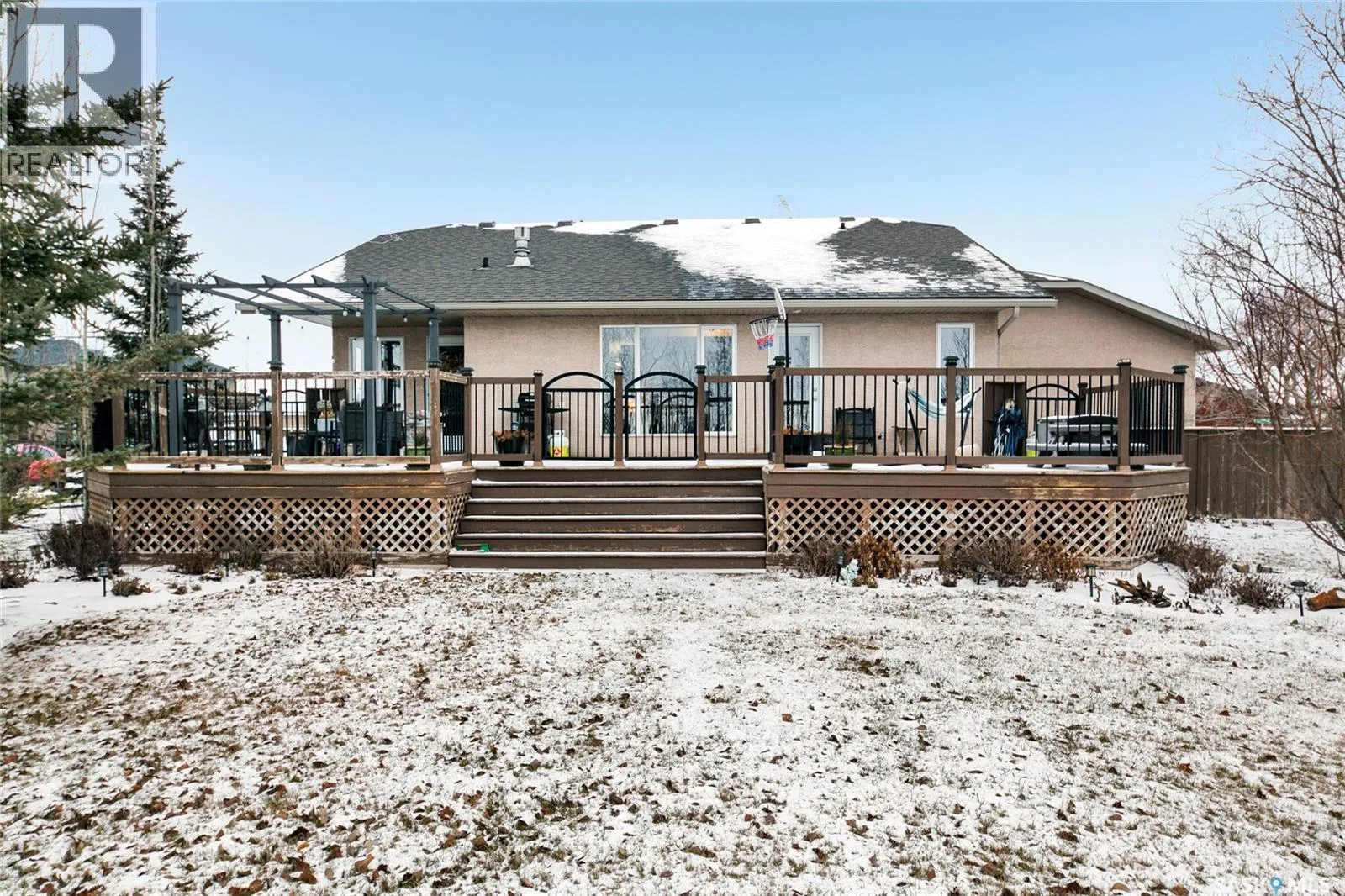 Beautiful corner lot in Lumsden's Schandre Estates. Welcome to this spacious and inviting bungalow nestled in the quaint town of Lumsden. Offering a perfect blend of valley living and modern convenience, this 3-bedroom, 2-bathroom home features 1,446 sq. ft. of well-planned living space above grade, complemented by a partially finished basement that offers incredible potential for your growing family. The main floor features a modern kitchen that serves as the heart of the home, complete with a sit-up island, durable laminate countertops, and stainless steel appliances. The layout flows well with a mix of laminate flooring through the main living areas, accented by tile and vinyl plank in key spaces. The lower level provides a fantastic canvas for your vision. Currently partially finished, it is ready for your final touches to easily add two additional bedrooms and another bathroom, significantly increasing the living space and value of the home. Outdoors, the property truly shines with a large backyard that backs onto a lane, offering added privacy and access. Pet owners will appreciate the convenient dog run attached to the attached garage. For those with toys or multiple vehicles, the property boasts impressive parking capacity for up to six vehicles. Located in a desirable neighbourhood, this home offers the best of all worlds. Lumsden features a K-12 school and a vibrant community atmosphere, all while being ideally situated just 15 minutes from the amenities of Regina and only 15 minutes from the recreation at Regina Beach and Last Mountain Lake. This bungalow perfectly blends comfort, potential, and an unbeatable location. (id:27476)