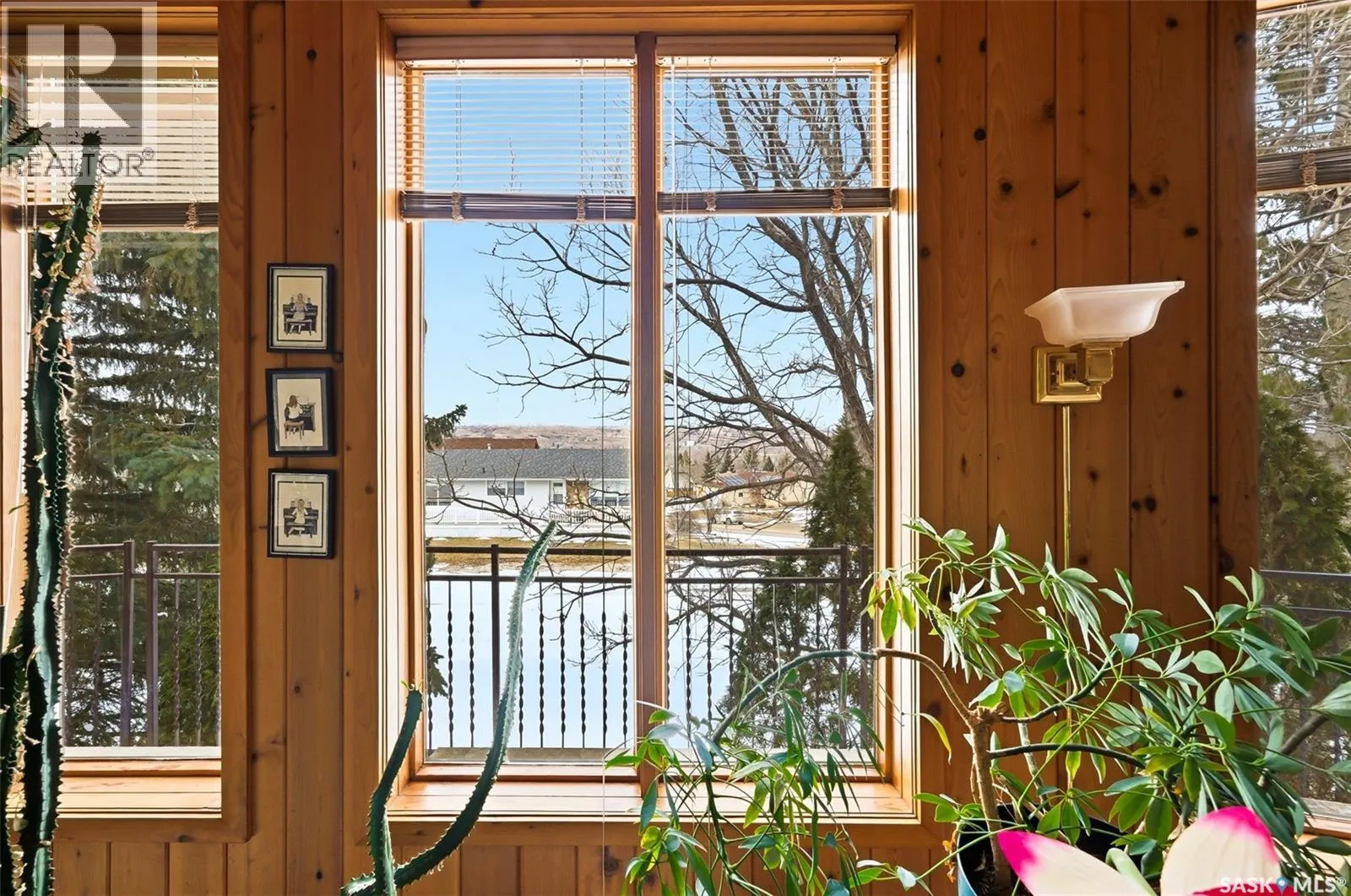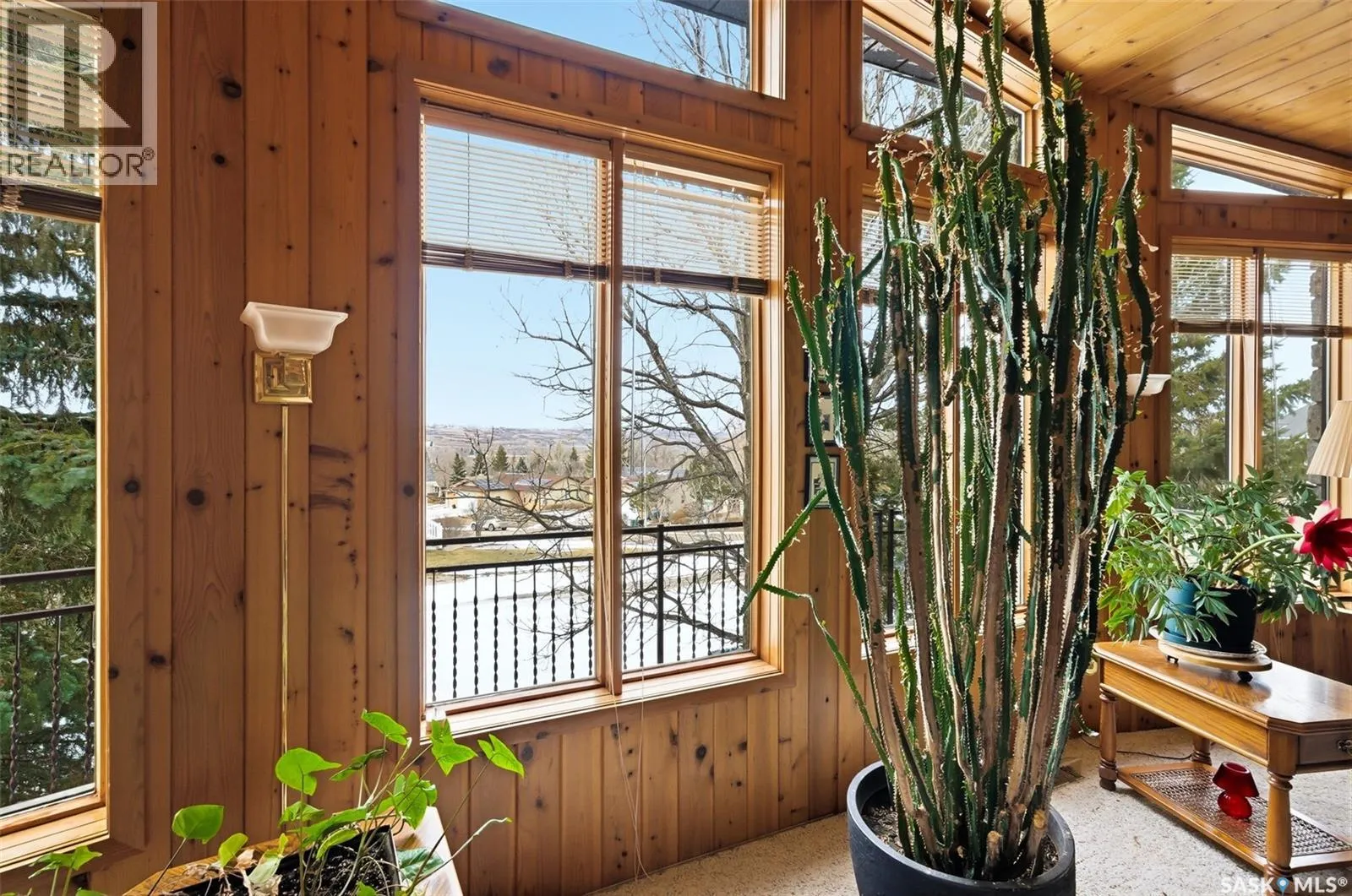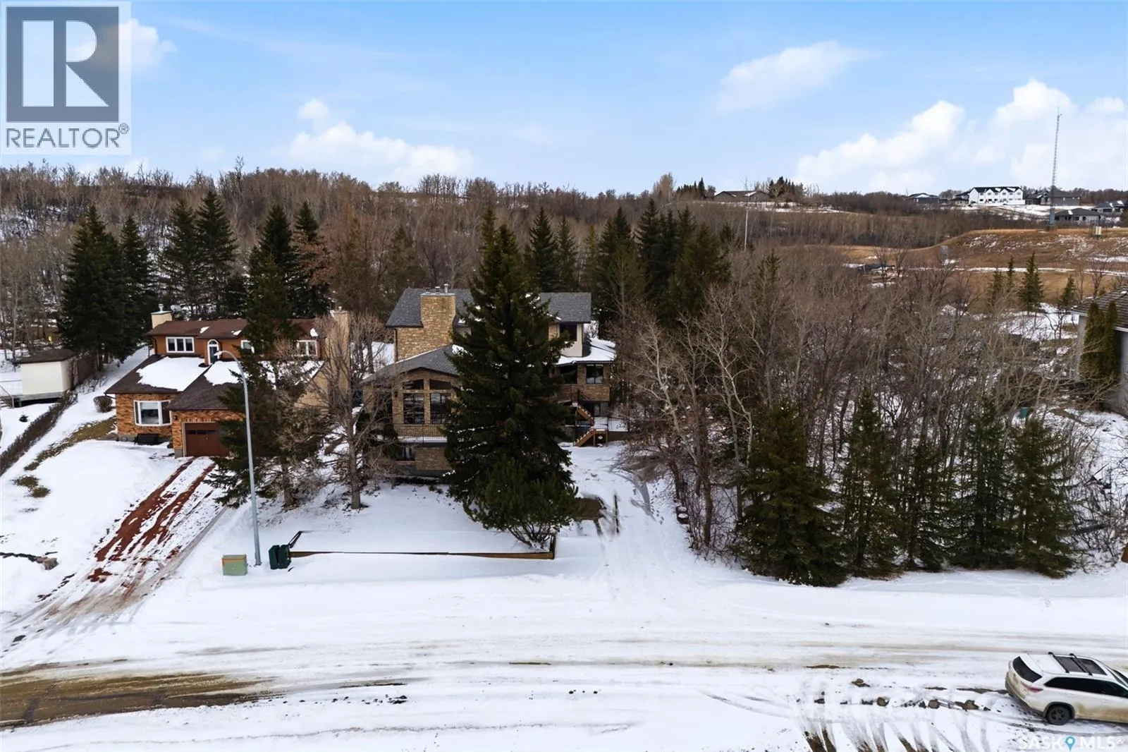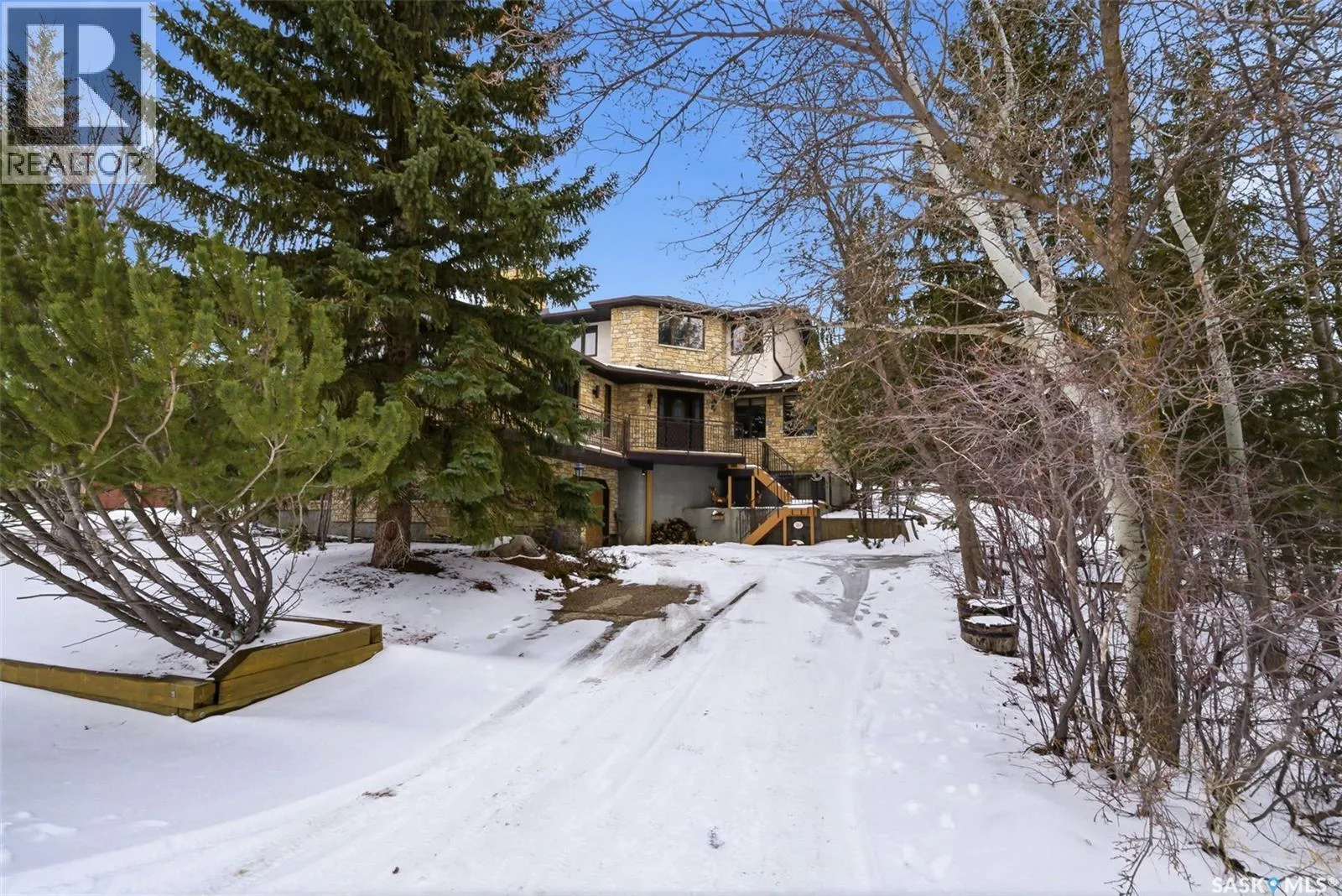 Welcome to your own private retreat just 20 minutes from Regina, nestled in the picturesque, storybook community of Lumsden. This custom-built home showcases craftsmanship and architectural detail that are increasingly rare to find. Perfectly positioned to overlook a beautiful ravine and backing a municipal reserve, this two-storey residence with its striking Tyndall Stone exterior offers an unmatched sense of peace, privacy, and natural beauty. As you arrive, the double driveway leads you through mature trees to a home that immediately impresses with its timeless design and commanding presence. Inside, the grand foyer sets the tone. To the right, an elegant formal living room flows through a charming brick archway into a spacious, sun-filled kitchen with expansive windows framing views of the forest-like backyard. A formal dining room with a gold-plated chandelier sits adjacentâan inviting space filled with character and history. To the left of the foyer, youâll discover a spectacular great room wrapped in cedar walls and ceilings, with windows capturing sweeping views of the QuâAppelle Valley. A walkout leads to a wrap-around balcony where you can take in the breathtaking scenery. This room is designed for memorable gatherings, complete with a wood-burning fireplace and a wet bar. An office/bedroom, 2-piece powder room, and laundry room complete the main level. Upstairs, two spacious bedrooms share a 4-piece bathroom, along with a peaceful reading nook. The grand primary suite is a true retreat, featuring a wood-burning fireplace, a spa-inspired 5-piece ensuite with a Jacuzzi tub, and a walk-in closet. The lower level offers more living space with a large family room, an additional bedroom, a 3-piece bathroom, a workshop, utility room, cold storage, and direct access to the insulated two-car garage with epoxy flooring. The backyard feels like a forested sanctuary, complete with a rear deck, large gazebo, greenhouse, shed, firepit area, and dog run. (id:27476)