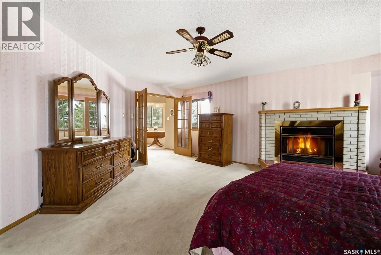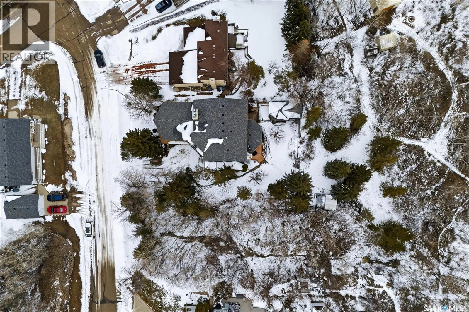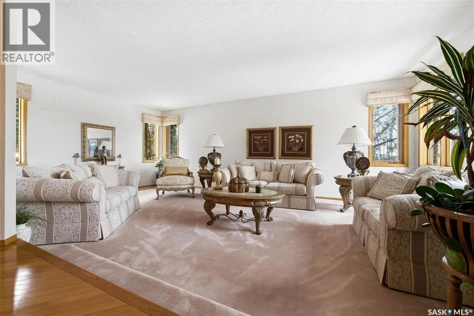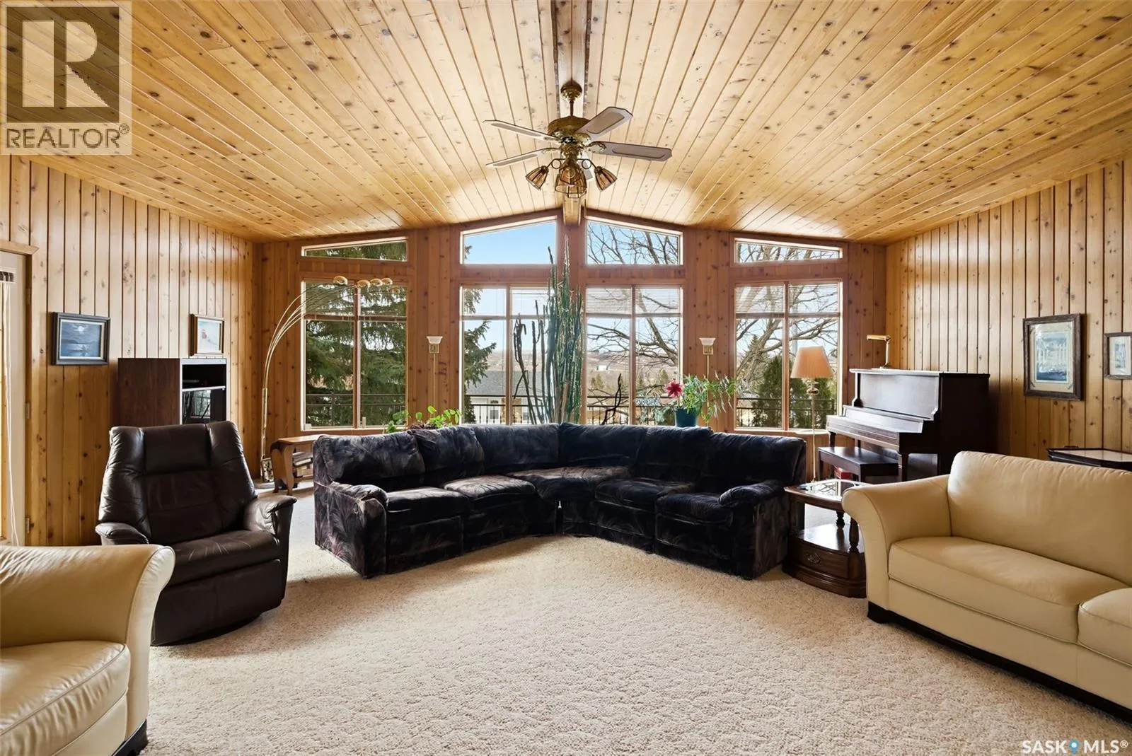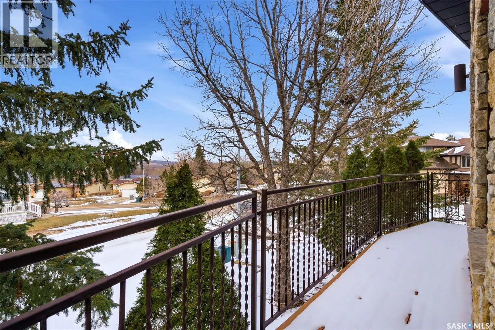 Welcome to your own private retreat just 20 minutes from Regina, nestled in the picturesque, storybook community of Lumsden. This custom-built home showcases craftsmanship and architectural detail that are increasingly rare to find. Perfectly positioned to overlook a beautiful ravine and backing a municipal reserve, this two-storey residence with its striking Tyndall Stone exterior offers an unmatched sense of peace, privacy, and natural beauty. As you arrive, the double driveway leads you through mature trees to a home that immediately impresses with its timeless design and commanding presence. Inside, the grand foyer sets the tone. To the right, an elegant formal living room flows through a charming brick archway into a spacious, sun-filled kitchen with expansive windows framing views of the forest-like backyard. A formal dining room with a gold-plated chandelier sits adjacentâan inviting space filled with character and history. To the left of the foyer, youâll discover a spectacular great room wrapped in cedar walls and ceilings, with windows capturing sweeping views of the QuâAppelle Valley. A walkout leads to a wrap-around balcony where you can take in the breathtaking scenery. This room is designed for memorable gatherings, complete with a wood-burning fireplace and a wet bar. An office/bedroom, 2-piece powder room, and laundry room complete the main level. Upstairs, two spacious bedrooms share a 4-piece bathroom, along with a peaceful reading nook. The grand primary suite is a true retreat, featuring a wood-burning fireplace, a spa-inspired 5-piece ensuite with a Jacuzzi tub, and a walk-in closet. The lower level offers more living space with a large family room, an additional bedroom, a 3-piece bathroom, a workshop, utility room, cold storage, and direct access to the insulated two-car garage with epoxy flooring. The backyard feels like a forested sanctuary, complete with a rear deck, large gazebo, greenhouse, shed, firepit area, and dog run. (id:27476)