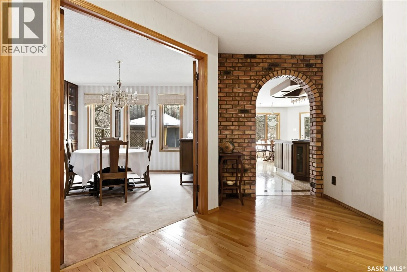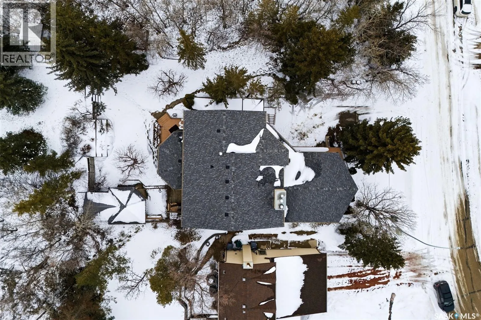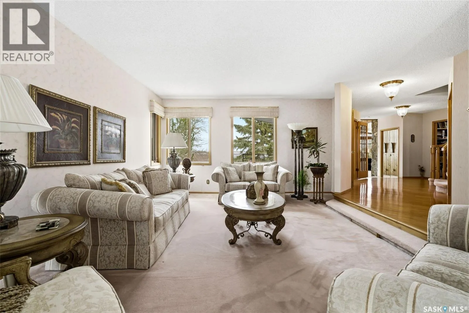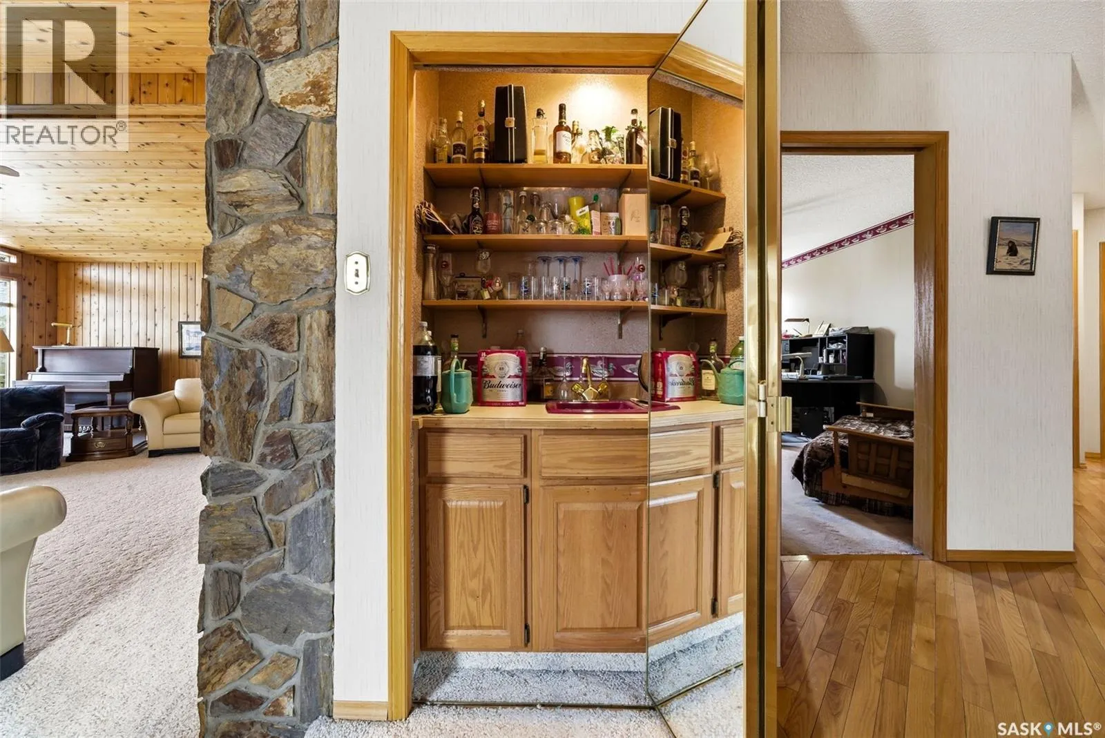 Welcome to your own private retreat just 20 minutes from Regina, nestled in the picturesque, storybook community of Lumsden. This custom-built home showcases craftsmanship and architectural detail that are increasingly rare to find. Perfectly positioned to overlook a beautiful ravine and backing a municipal reserve, this two-storey residence with its striking Tyndall Stone exterior offers an unmatched sense of peace, privacy, and natural beauty. As you arrive, the double driveway leads you through mature trees to a home that immediately impresses with its timeless design and commanding presence. Inside, the grand foyer sets the tone. To the right, an elegant formal living room flows through a charming brick archway into a spacious, sun-filled kitchen with expansive windows framing views of the forest-like backyard. A formal dining room with a gold-plated chandelier sits adjacentâan inviting space filled with character and history. To the left of the foyer, youâll discover a spectacular great room wrapped in cedar walls and ceilings, with windows capturing sweeping views of the QuâAppelle Valley. A walkout leads to a wrap-around balcony where you can take in the breathtaking scenery. This room is designed for memorable gatherings, complete with a wood-burning fireplace and a wet bar. An office/bedroom, 2-piece powder room, and laundry room complete the main level. Upstairs, two spacious bedrooms share a 4-piece bathroom, along with a peaceful reading nook. The grand primary suite is a true retreat, featuring a wood-burning fireplace, a spa-inspired 5-piece ensuite with a Jacuzzi tub, and a walk-in closet. The lower level offers more living space with a large family room, an additional bedroom, a 3-piece bathroom, a workshop, utility room, cold storage, and direct access to the insulated two-car garage with epoxy flooring. The backyard feels like a forested sanctuary, complete with a rear deck, large gazebo, greenhouse, shed, firepit area, and dog run. (id:27476)