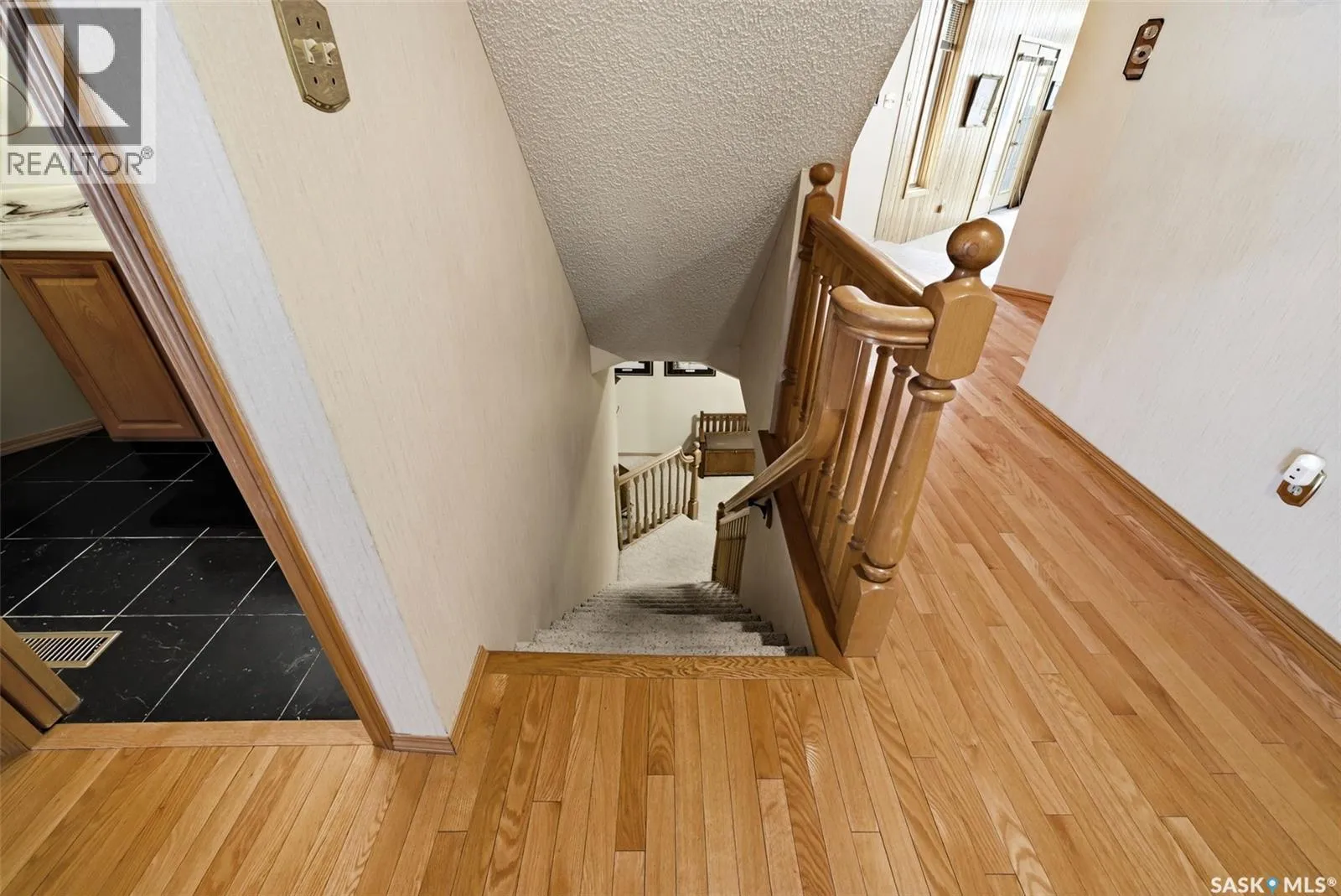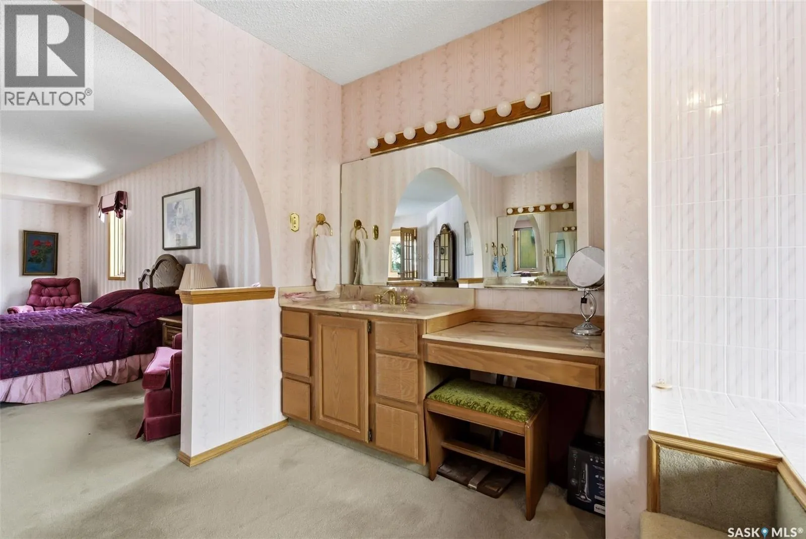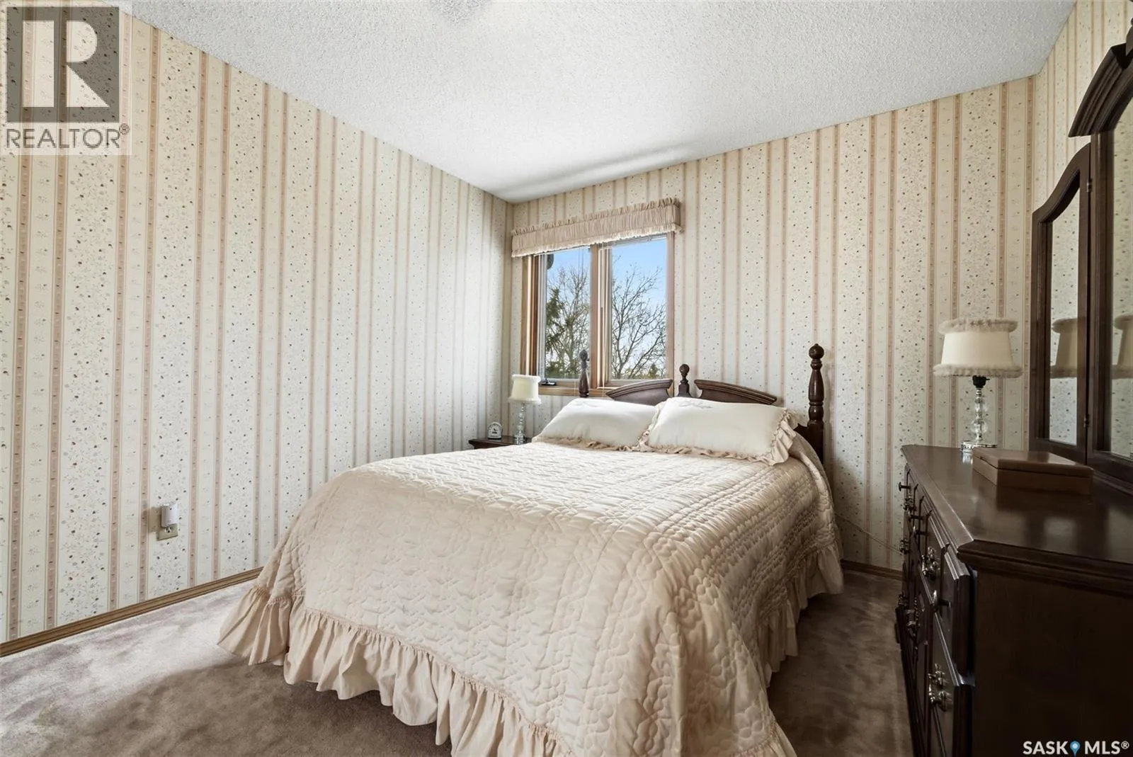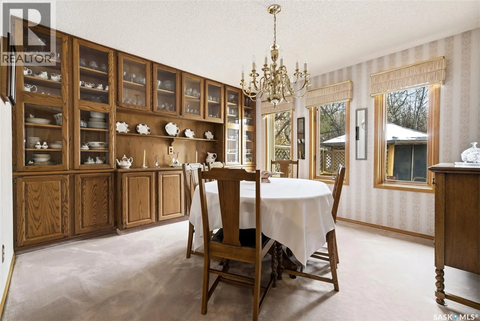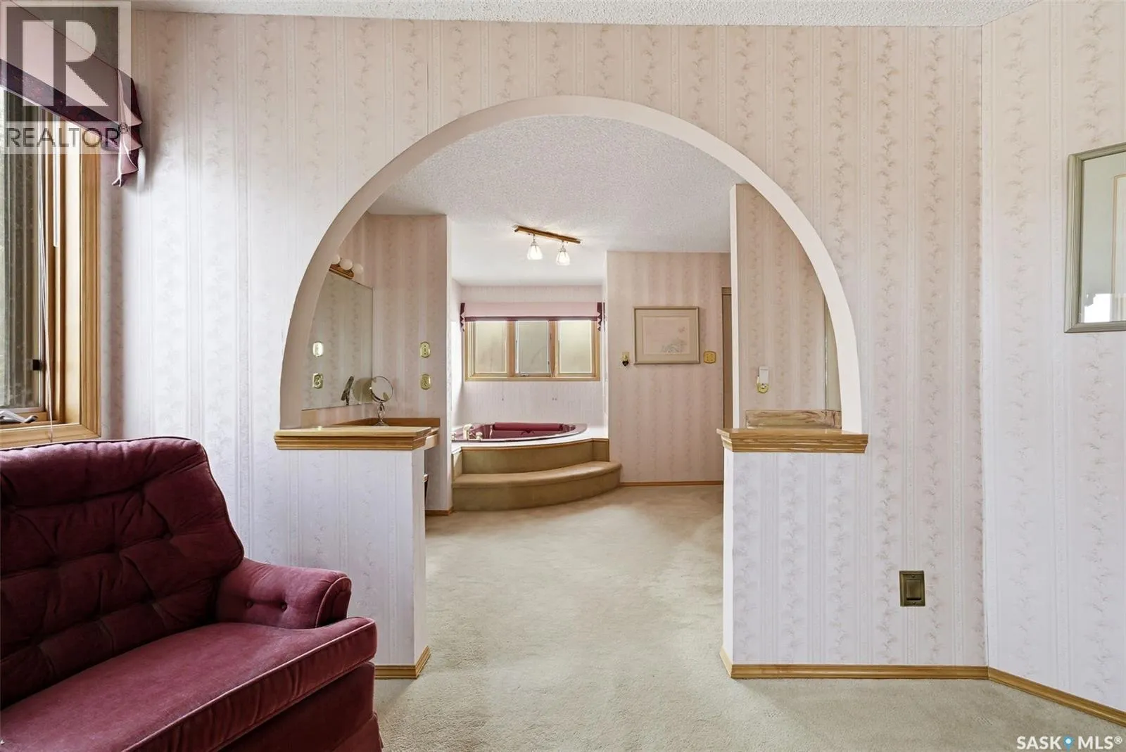 Welcome to your own private retreat just 20 minutes from Regina, nestled in the picturesque, storybook community of Lumsden. This custom-built home showcases craftsmanship and architectural detail that are increasingly rare to find. Perfectly positioned to overlook a beautiful ravine and backing a municipal reserve, this two-storey residence with its striking Tyndall Stone exterior offers an unmatched sense of peace, privacy, and natural beauty. As you arrive, the double driveway leads you through mature trees to a home that immediately impresses with its timeless design and commanding presence. Inside, the grand foyer sets the tone. To the right, an elegant formal living room flows through a charming brick archway into a spacious, sun-filled kitchen with expansive windows framing views of the forest-like backyard. A formal dining room with a gold-plated chandelier sits adjacentâan inviting space filled with character and history. To the left of the foyer, youâll discover a spectacular great room wrapped in cedar walls and ceilings, with windows capturing sweeping views of the QuâAppelle Valley. A walkout leads to a wrap-around balcony where you can take in the breathtaking scenery. This room is designed for memorable gatherings, complete with a wood-burning fireplace and a wet bar. An office/bedroom, 2-piece powder room, and laundry room complete the main level. Upstairs, two spacious bedrooms share a 4-piece bathroom, along with a peaceful reading nook. The grand primary suite is a true retreat, featuring a wood-burning fireplace, a spa-inspired 5-piece ensuite with a Jacuzzi tub, and a walk-in closet. The lower level offers more living space with a large family room, an additional bedroom, a 3-piece bathroom, a workshop, utility room, cold storage, and direct access to the insulated two-car garage with epoxy flooring. The backyard feels like a forested sanctuary, complete with a rear deck, large gazebo, greenhouse, shed, firepit area, and dog run. (id:27476)