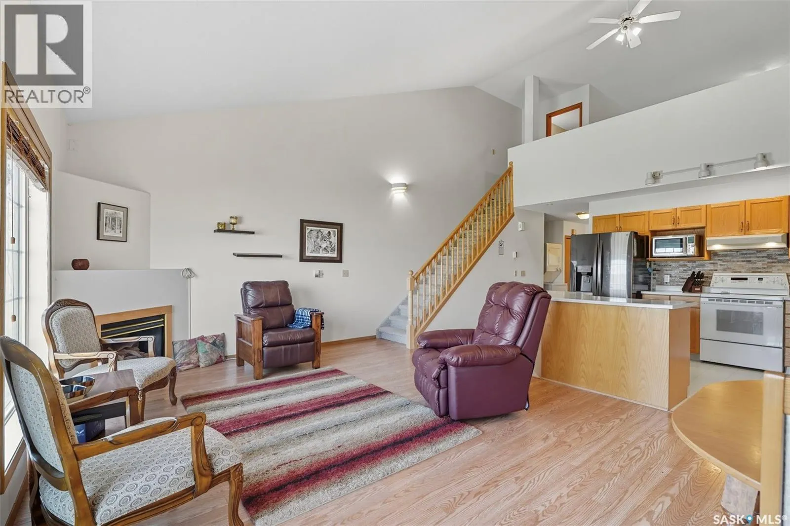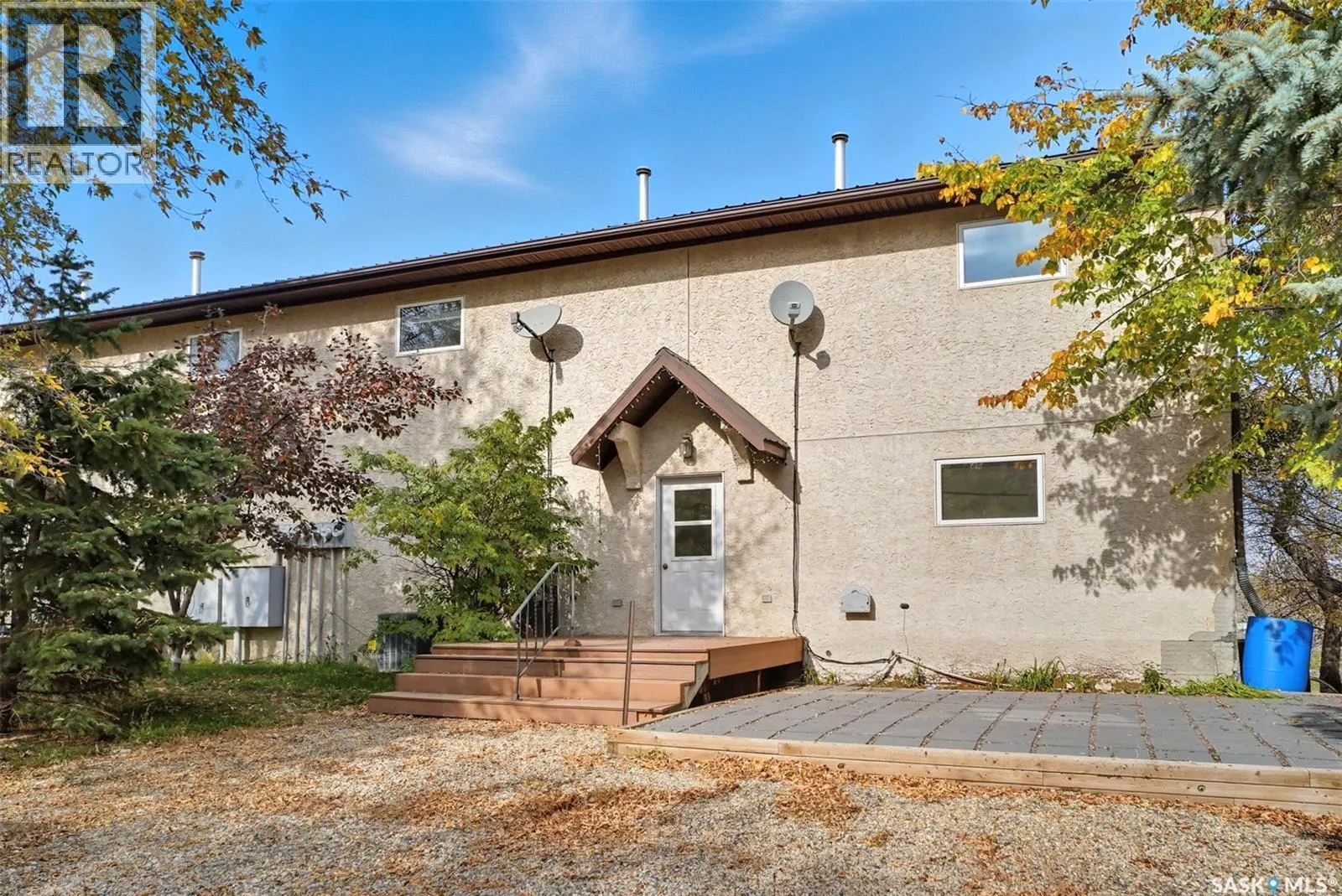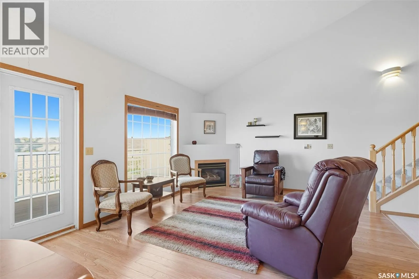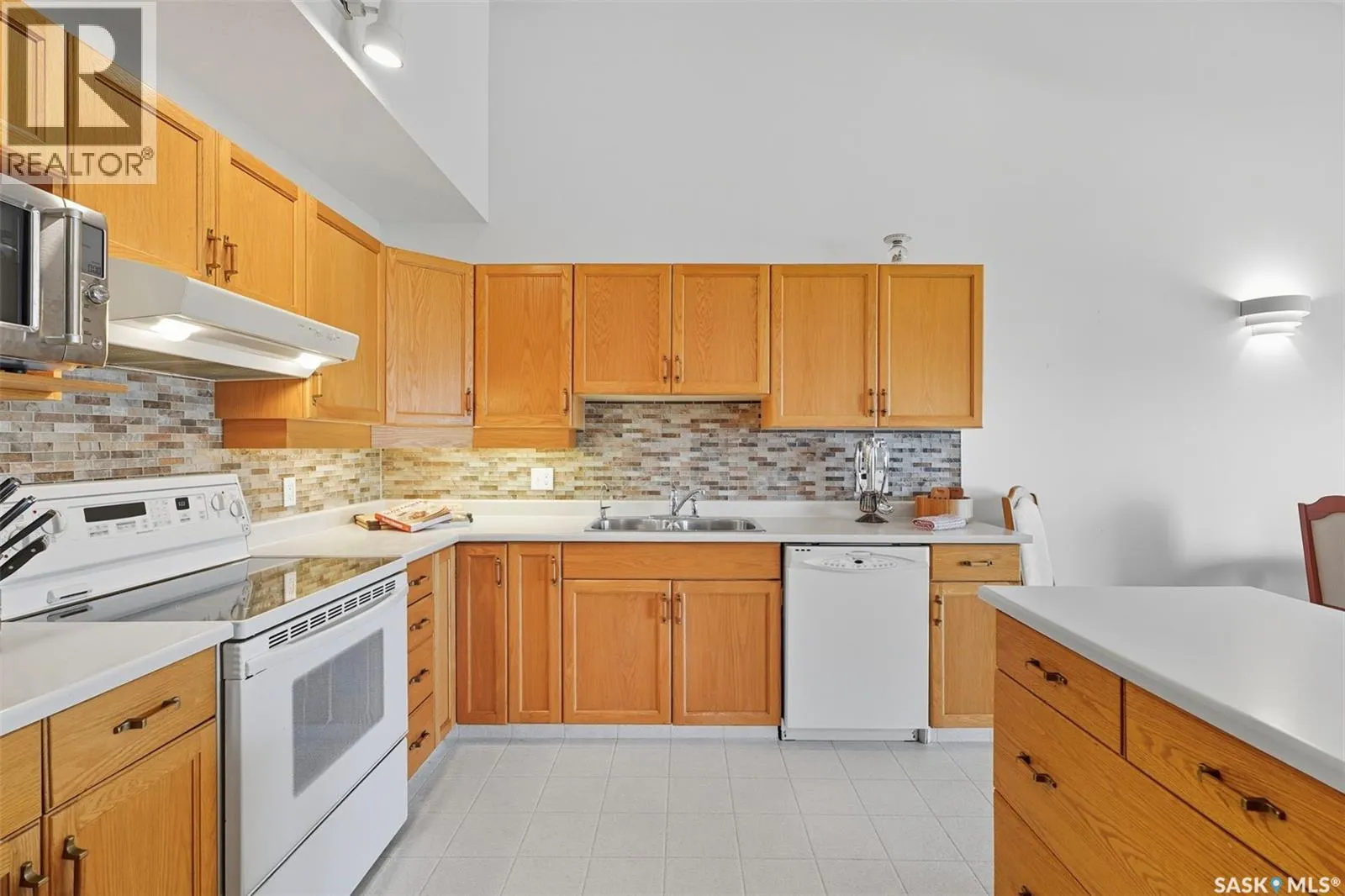 Plan:99MW03201 This cozy condo sits on the shore of Little Manitou Lake offering you an amazing view from your large raised balcony in the spring, summer and fall. Then in the winter months enjoy the serenity and beautiful sunshine in your expansive living space with vaulted ceilings and a fire to warm you in your gas fire place! The north facing exposure allows you to enjoy both sunrise and sunset over the lake year round. Unit #5 is a very well designed 2 bedroom, 2 bath condo with front and back access. The front is assessed from the lower level oversized single garage which takes you into the lower level mud room and large unfinished space which houses the utilities for the unit and can easily be developed into another living space if required with a rough in for a future washroom. Stairs then take you to the main level of the condo. Additionally there is very convenient main level access from the back of the unit with two designated parking stalls. This entrance takes you into a very spacious foyer with 2 closets, 1 hanging and 1 folded and also houses the stacking washer dryer. Off of this area is the guest bedroom and a full bath with 2 accesses, one from the bedroom and one from the hallway. Moving through this space you are welcomed into the open concept kitchen/living and dining area flooded with natural light and dramatic vaulted ceilings with the spectacular view out your front windows onto the lake. The stairway takes you to the upper level boasting a massive master suite with a large walk in closet and another full bath. If you are looking for your summer and weekend get away without the hassle of keeping a yard, or a year round care free living lifestyle this is for you! Only minutes from Watrous which offers all the amenities of the city while you live in the tranquility of the beach. Manitou is health, music and art centric and a welcoming, growing community. Come experience the healing waters of Manitou and all of the great activities the village has to offer. (id:27476)