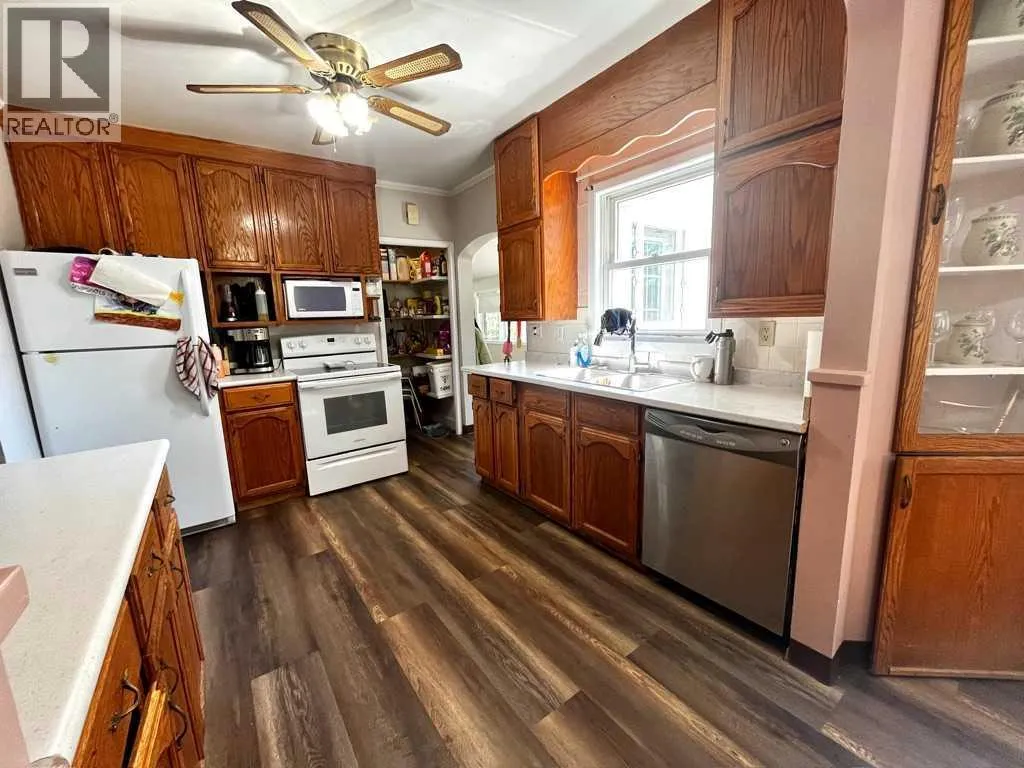 Located in a small town 40 minutes from Lloydminster, this practical two-storey house provides a comfortable living space with four bedrooms and two bathrooms. The garage has been converted into an oversized bedroom, adding to the home's versatility. Additionally, new flooring has been installed throughout most of the home. This property includes a large yard over 0.6 acres, suitable for outdoor activities and gardening. Additionally, there's a 26x28 detached garage and a 12x18 shed, offering ample space for vehicles or extra storage. With its quiet setting and convenient access to nearby amenities, this home is a solid choice for those wanting a balance between rural and urban living. (id:27476)