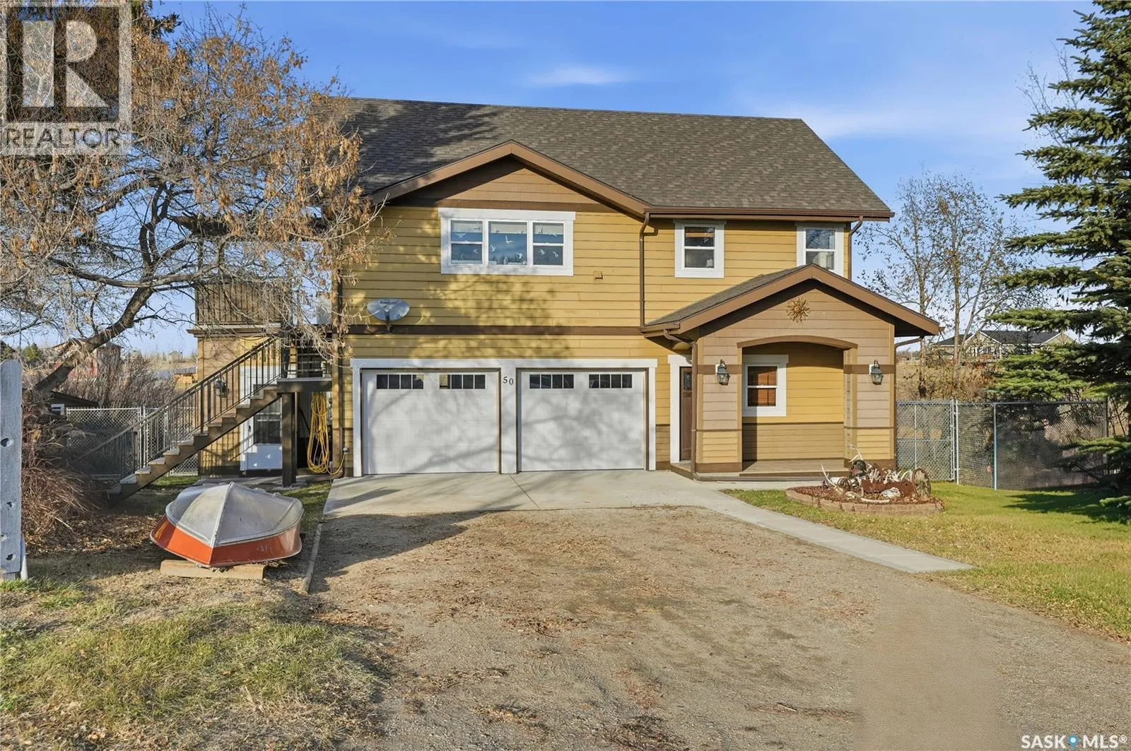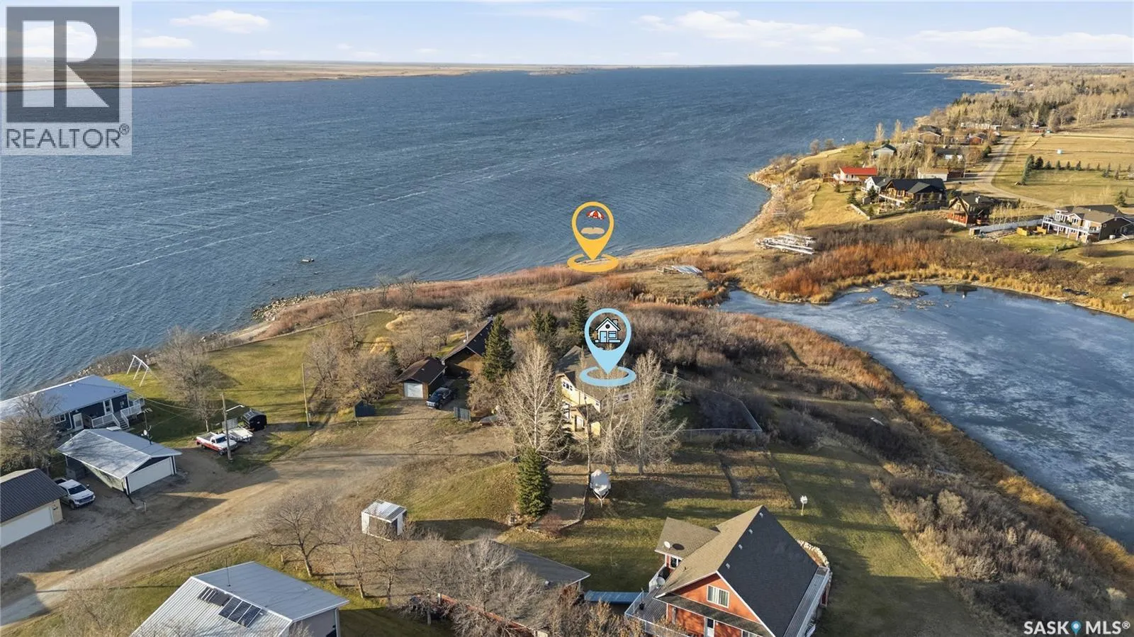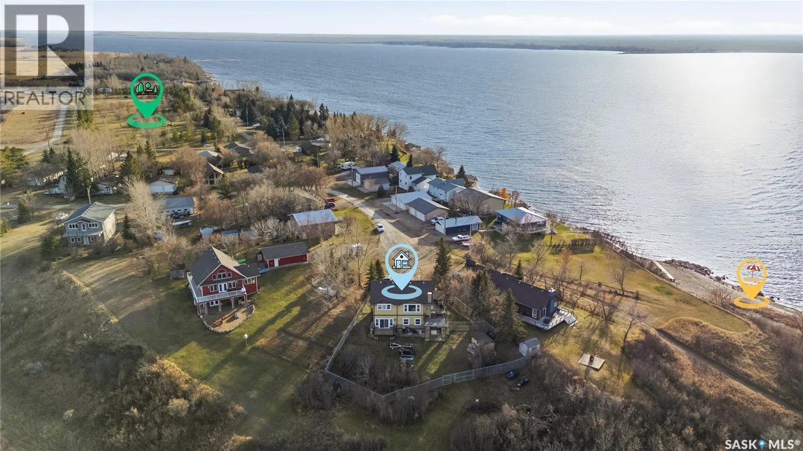 Seize your chance to claim a slice of heaven at Last Mountain Lake! Introducing this remarkable custom-built lakeside residence, offering breathtaking views from nearly every room. With impressive curb appeal, the exterior features low-maintenance composite siding, soffit, and a welcoming veranda. Upon stepping inside, you are welcomed by an open foyer that leads to a 4-piece bathroom complete with a 5-foot walk-in shower, alongside a spacious bedroom that boasts garden doors opening to its own secluded deck. The main level also provides convenient access to a 24' x 26' insulated garage, which includes a heated insulated room utilized for laundry. Additionally, the garage connects to a charming 3-season sunroom, not counted in the total square footage. An elegant open staircase ascends to the upper level, where you'll find a bright and airy layout adorned with vaulted ceilings and stunning views from nearly every corner. The chef's kitchen impresses with abundant rich cabinetry featuring soft-close doors and drawers, ample counter space, an eat-at island with a new ceramic cooktop, and all high-end stainless-steel appliances included. The living and dining areas are perfect for cozy gatherings around the natural gas stone fireplace or stepping out onto the pergola-covered deck equipped with dura decking and glass railing, offering another opportunity to soak in the picturesque surroundings. The upper level also includes a generous primary bedroom with his-and-hers closets, and another bedroom/den currently serving as a laundry/office space. The beautifully landscaped yard is a true gem, featuring a new chain link fence, with many gates for convenient access to water or yard. Noteworthy features include a year-round public water source and a 1500-gallon fiberglass septic tank. This exceptional home is built on piles, and detailed building plans are available for review. Don't miss your chance to live your best life-the lake life. (id:27476)