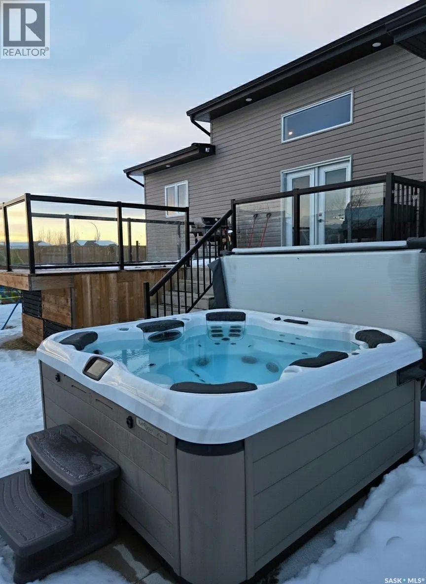 Built in 2018, this stylish 5-bedroom, 3-bathroom home offers the perfect blend of space, comfort, and modern design with an inviting atmosphere throughout. The bright, open-concept 1,323 sq ft main floor features high ceilings, large windows, and clean contemporary finishes throughout. The primary bedroom includes a walk-in closet and private ensuite for added convenience. Downstairs, the fully finished basement offers two bedrooms, a full bathroom, large laundry room, and a spacious entertaining area featuring a custom bar. Step outside to your private backyard retreat featuring an L-shaped deck with glass railings, a Bullfrog A7 hot tub, fire pit area, and a beautifully landscaped yard with a variety of trees and fruit trees. A storage shed and optional play equipment add extra value. Additional highlights include two electric fireplaces, an attached 1.5-car garage, and lots of storage space. Move-in ready conditionâperfect for modern family living! Donât hesitate to contact your preferred realtor for more information. (id:27476)