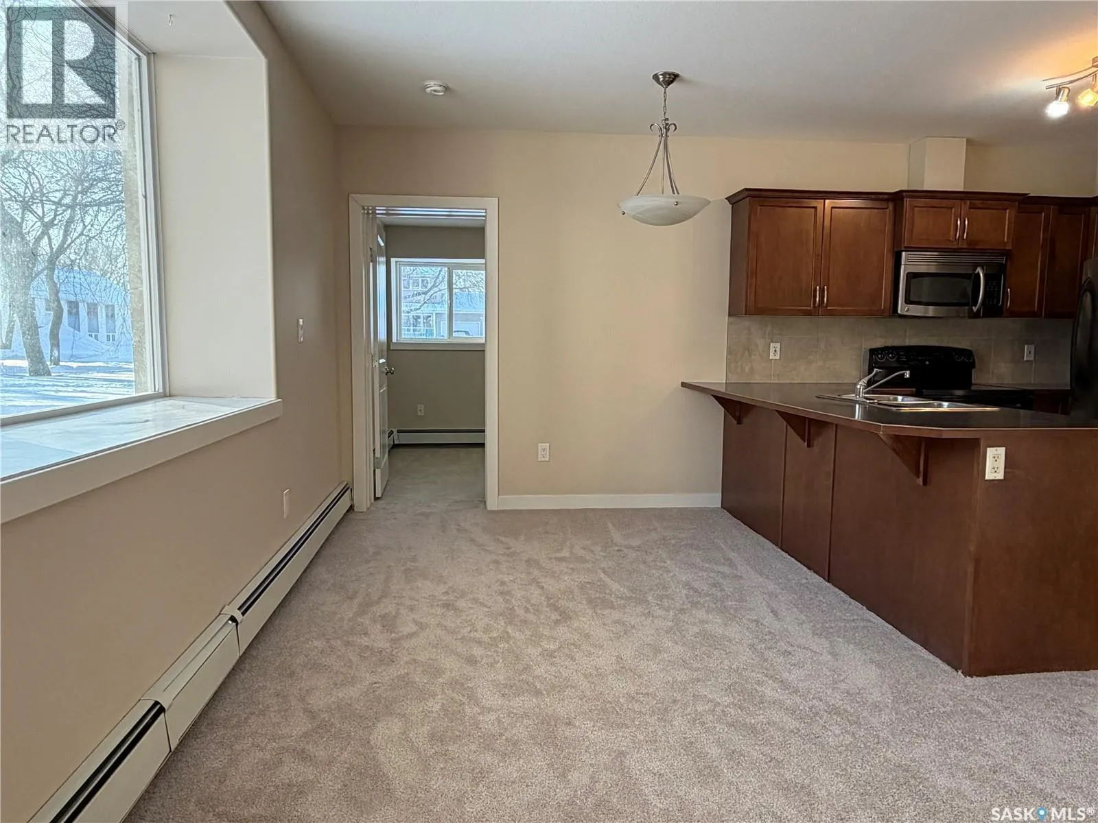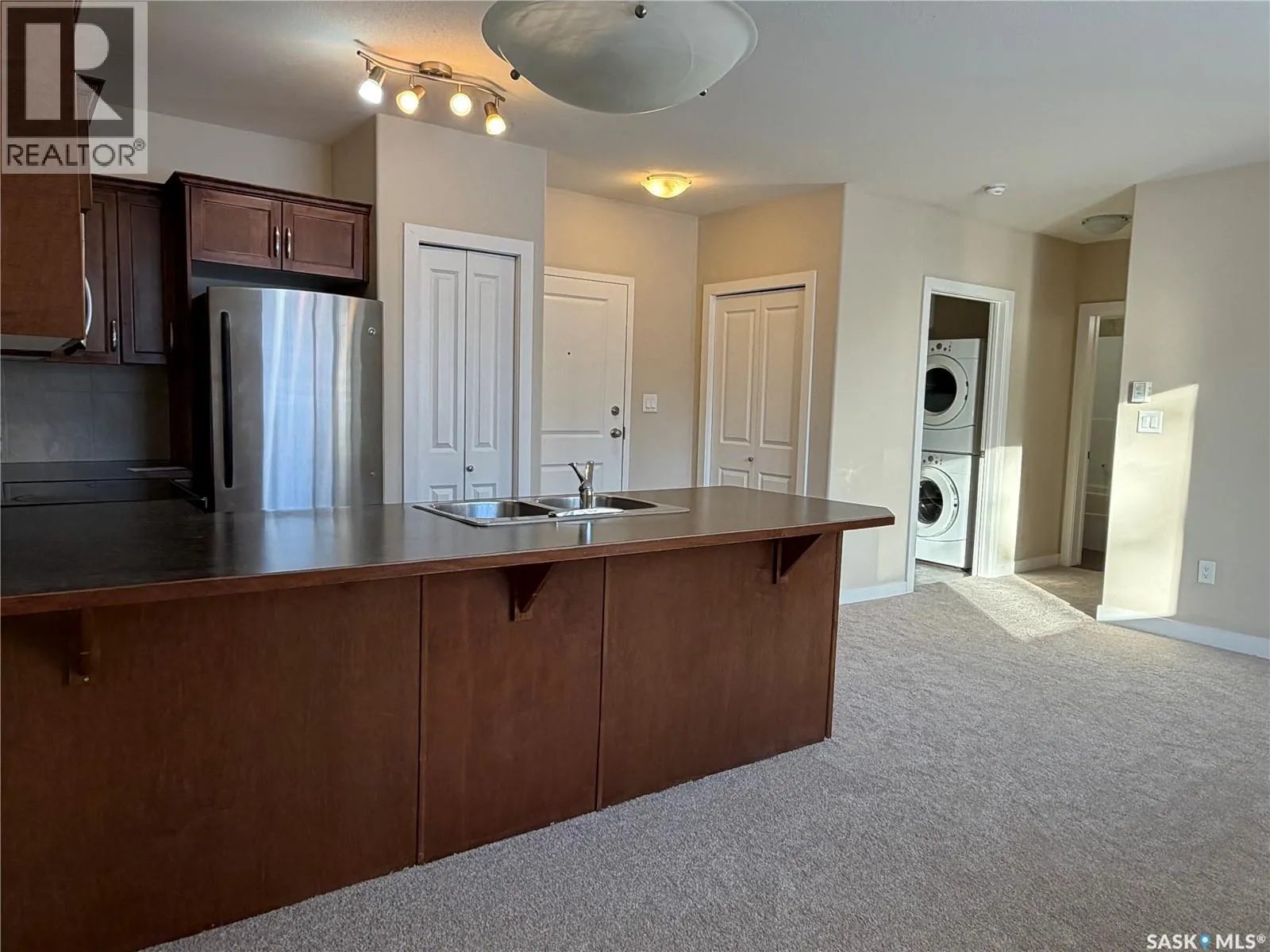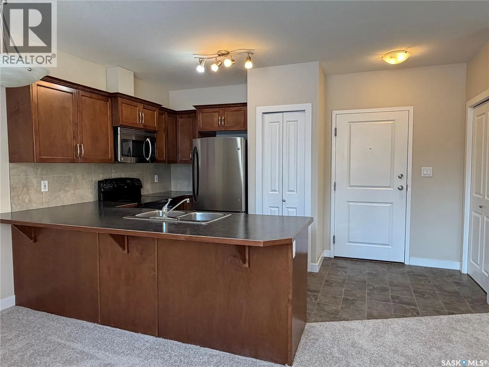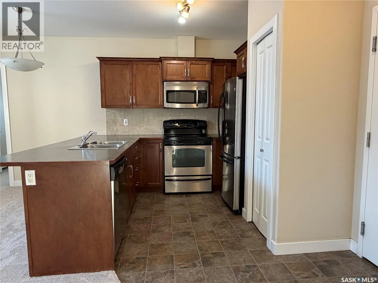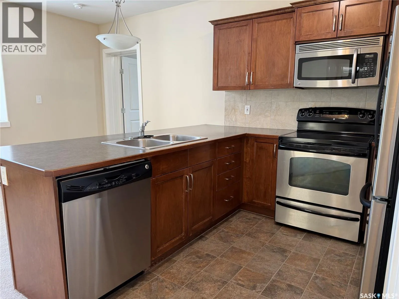 Two bedroom condo unit located in Bemister Place Condos on the East side of Melfort, located close to schools, parks & Parkland Place! This unit faces East, viewing the greenspace that has a covered patio with benches and tables for socials. Shaker style, maple, cabinets provides an abundance of counter space with overhang for stools, if desired. Includes fridge, stove, dishwasher & microwave. Laundry room includes washer & dryer. Main bedroom of the two, offers double closets. Full bath. This unit is located closest to the South West exterior access. The condo building is two levels, with an elevator. Parking stall #101. (id:27476)