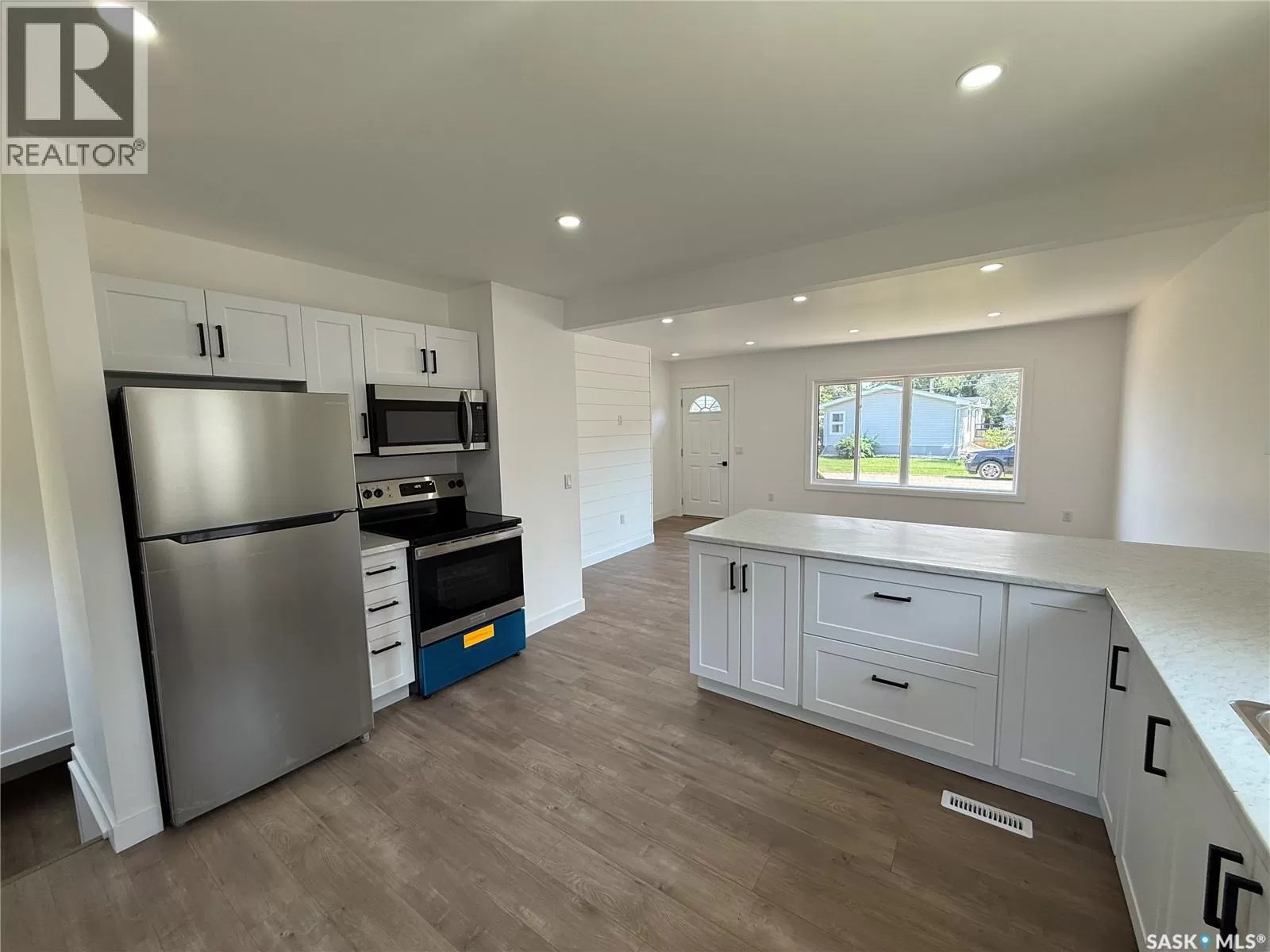 Welcome Home to Midale! This bright and affordable renovated home is move-in ready and full of charm. Featuring 3 bedrooms and 2 bathrooms, the home offers modern updates throughout, including a new kitchen with ample cupboards, counters, and appliances, refreshed flooring, and many updated windows. The finished basement includes a cozy family room, an additional bedroom, a half bath with laundry hookups, and plenty of extra living space. Mechanical upgrades include a high-efficiency furnace, water heater, and central air conditioning, ensuring comfort and peace of mind. Outside, enjoy a large yard with a firepit area, perfect for entertaining and ready for your personal touch. The single detached garage offers excellent storage options. With low-maintenance vinyl siding and thoughtful renovations, this property is as practical as it is inviting. Donât miss this move-in ready gem in the welcoming community of Midale! (id:27476)
