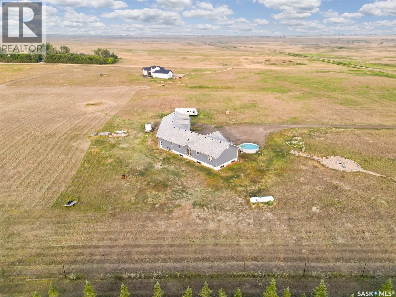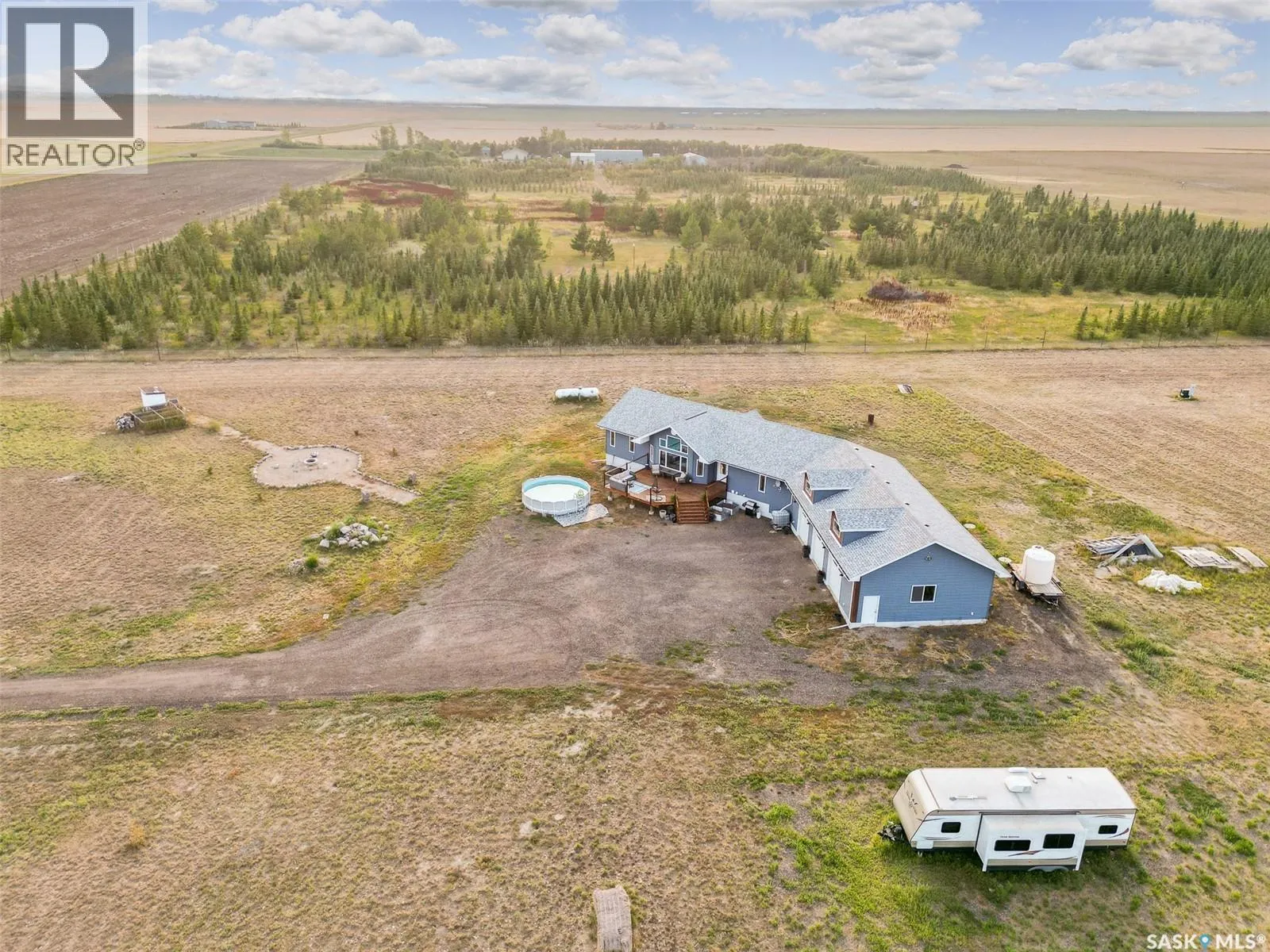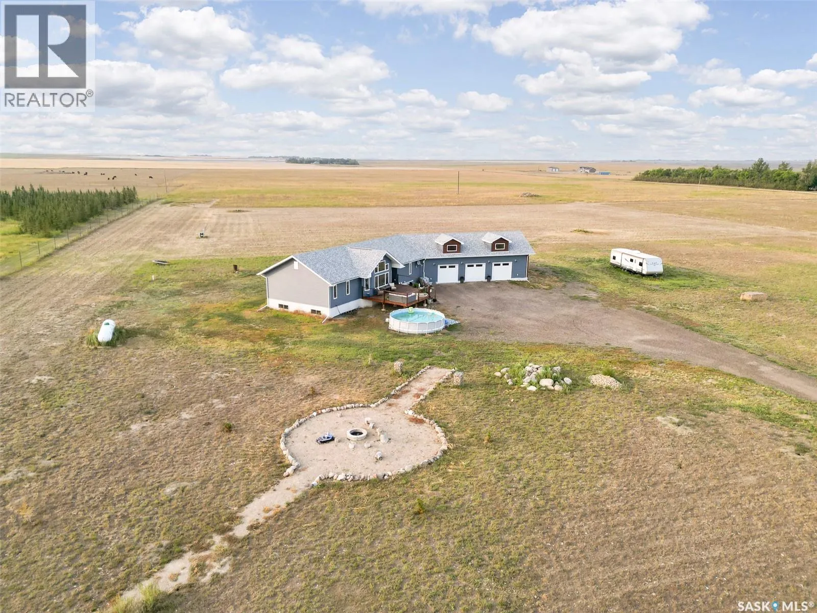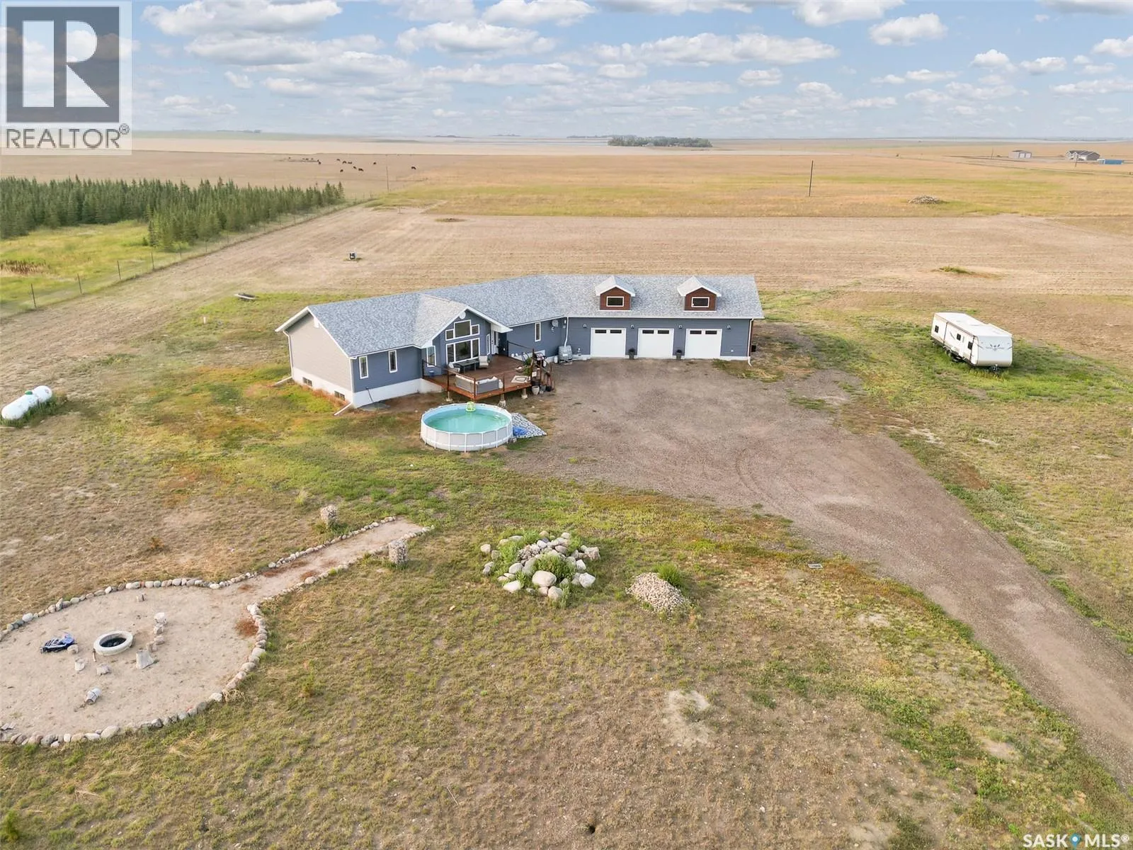 Dreaming of life in the country just minutes from the city?? Stargazing on your deck away from the city lights? Dreams do come true! This 10 acre parcel boasts a 1,600+ square foot home that is built with the best view in mind & the front deck will be your favourite place to soak up the sunrise! Inside, this home feels warm & welcoming with a modern farmhouse vibe! The view from the Living Room is stunning with huge south facing windows taking full advantage or the vaulted ceiling & is set off with a sleek Fireplace flanked by rustic built-ins. The open concept main floor is perfect for gathering with family & friends with the Kitchen boasting custom concrete countertops, deep farmhouse sink, corner pantry, stylish lighting & island with the Dining Room finished with feature wall & patio doors opening on to a new back deck. To one side of the home, you will find 2 spacious Bedrooms & full Bath with the Primary Suite (walk-in closet & 4pc Ensuite) on the opposite side of the house allowing for privacy. MAIN FLOOR LAUNDRY is adjacent to the MASSIVE HEATED GARAGE with soaring ceilings & dormers (future mezzanine??). The lower level is ready for your ideas with r/in plumbing for additional Bath & framing is set to begin to develop a Family Room, Bath & 2 Bedrooms (state of completion will depend on purchase timeline & is negotiable). Start planning your move to the country now & enjoy the peace & tranquility this change of address will bring! Directions: From MJ - Highway 1 East to Weyburn turn off. North on 301 to Twp Rd 172. East approximately 3kms to sign. (id:27476)