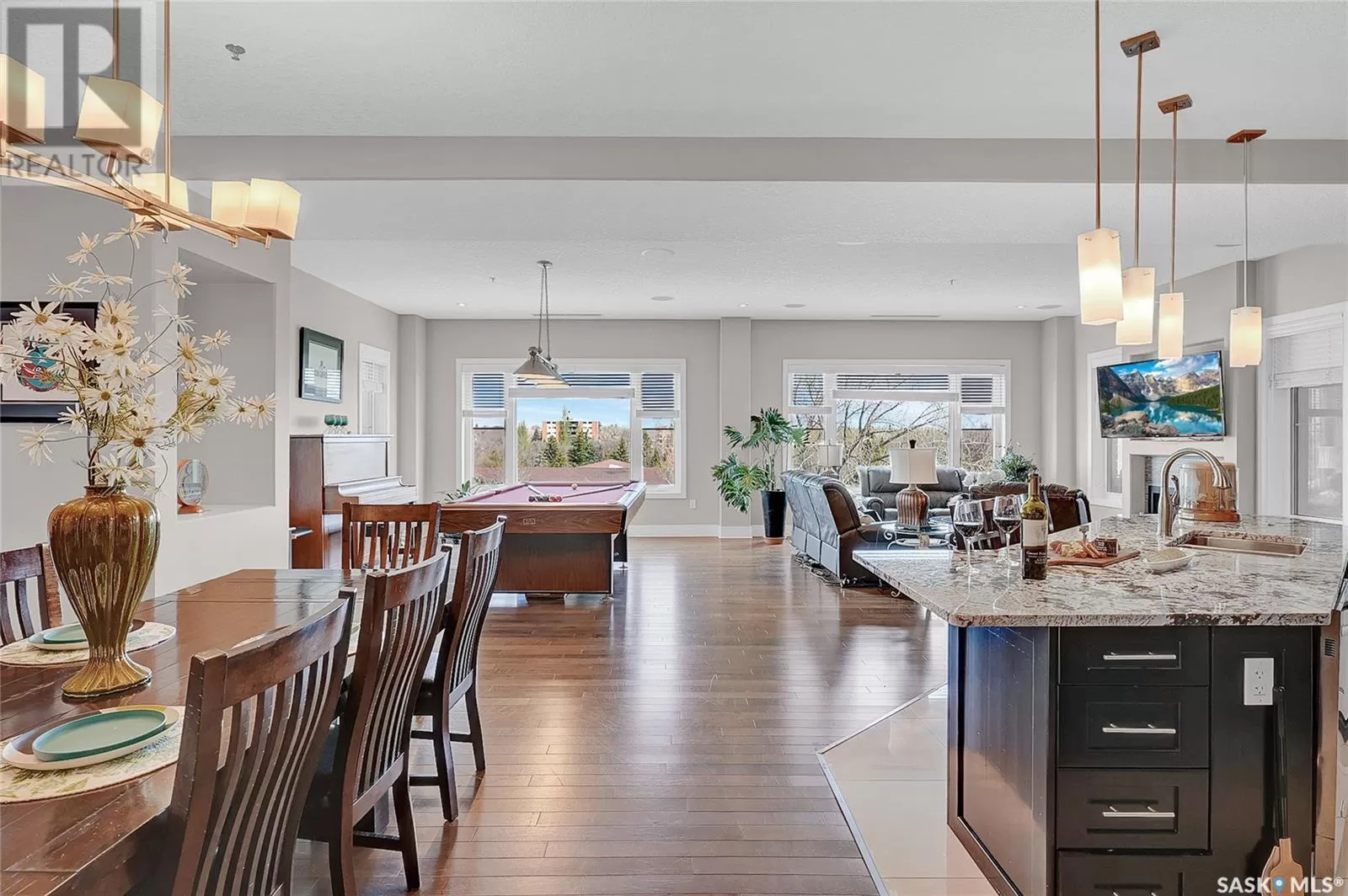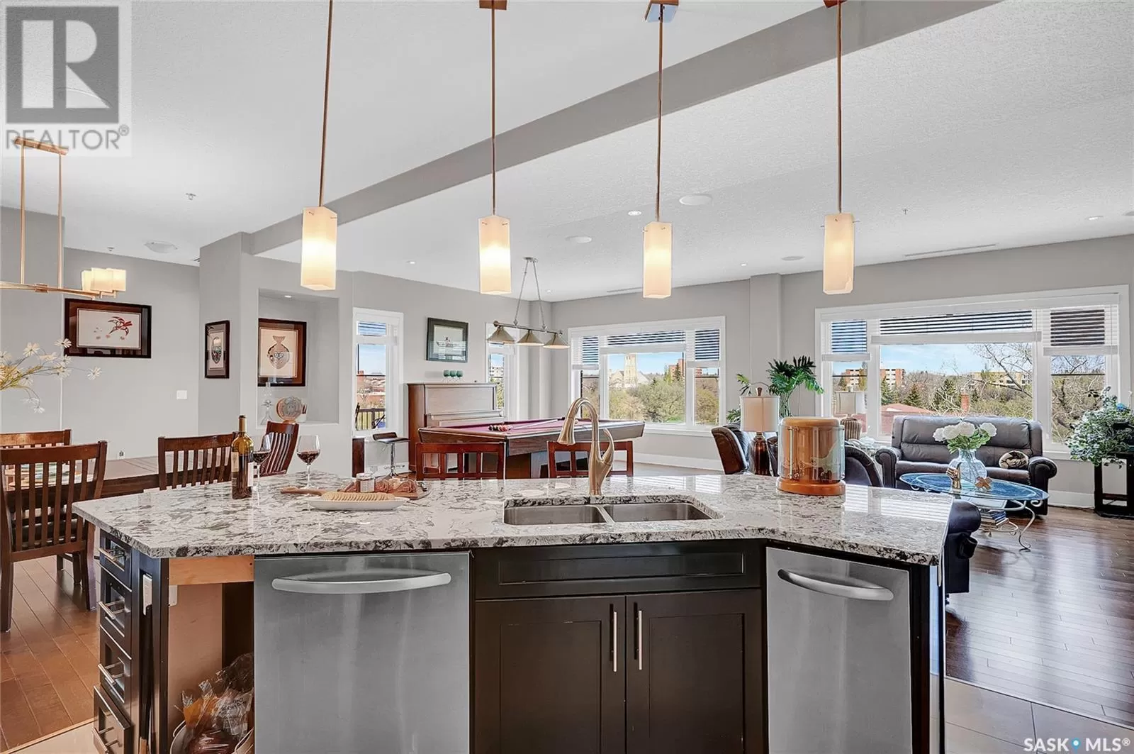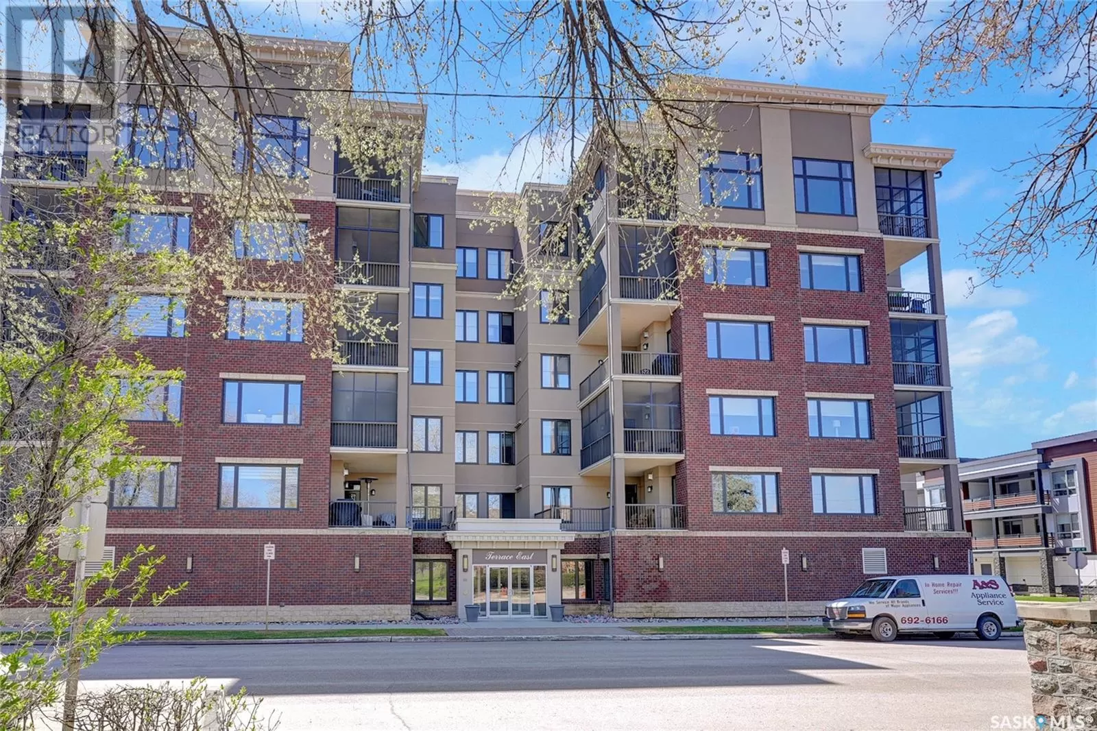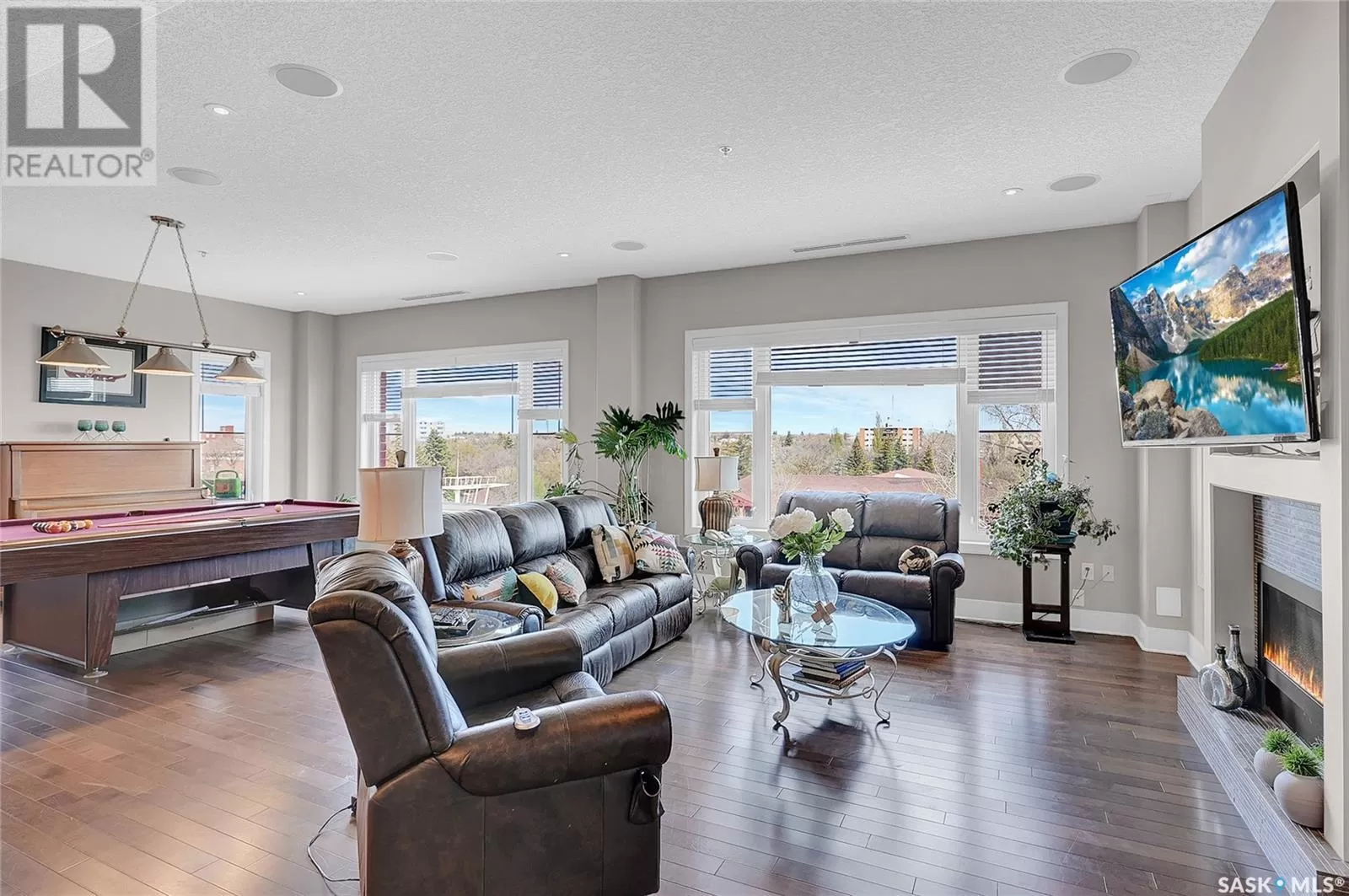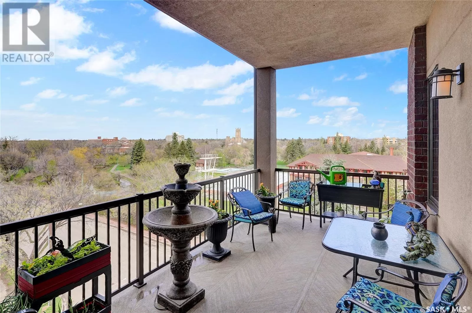 Unparalleled elegance & sophistication at Terrace East, a residence that epitomizes luxury living w/views of Crescent Park. This extraordinary condo is a sanctuary of style. Boasting granite, beautiful NEW hardwood flooring in the main living area & tile floors, that set a standard for upscale living. The grandeur of the 12-foot ceilings w/8ft solid core doors, add to the expansive open-concept living, magnified by floor to ceiling windows inviting an abundance of natural light w/access to 2 Balconies w/1 being screened in. Living Room adorn by sheer space, hosts a Gas Fireplace w/A/V h/u, in addition to the b/i Sound System set thru out. Dining area hosts a table fit for a king. Kitchen is a masterpiece w/island, ceiling-height cabinetry, pantry, top-of-the-line appliances including trash compactor, promises to inspire culinary exploration. This living space isnât finished yet, there is room for a gaming area, currently w/pool table & room for a bar & Patio Door leading to the NW Balcony to enjoy the summer sun overlooking the city skyline. Both balconies have natural Gas h/u & structured to support a hot tub if desired. There are 3 Bedrooms & Den that can used as 4th bedroom. Primary in the âEast Wingâ is a private retreat, complete w/Ensuite w/2 sinks, tile & glassed shower & a dream walk in closet. This wing is complete w/Den opening to the NE private screened in Balcony, welcoming the morning sun. The âWest Wingâ enjoys 2 bedrooms & Jack & Jill access to the 4pc. bath w/soaker tub & beautiful tile work & even a 2pc Bath. Terrace East is a secure luxury complex, offering 2 underground parking stalls, guest room, gym, mail & library Rms. 2 blocks of downtown w/a prestigious address across Crescent Park & steps to shopping, restaurants, & spas, ensuring a lifestyle of convenience & luxury. Click on the multimedia link to take a virtual tour of this Penthouse style condo & embrace the opportunity to live in one of the finest condominium buildings in the province. (id:27476)