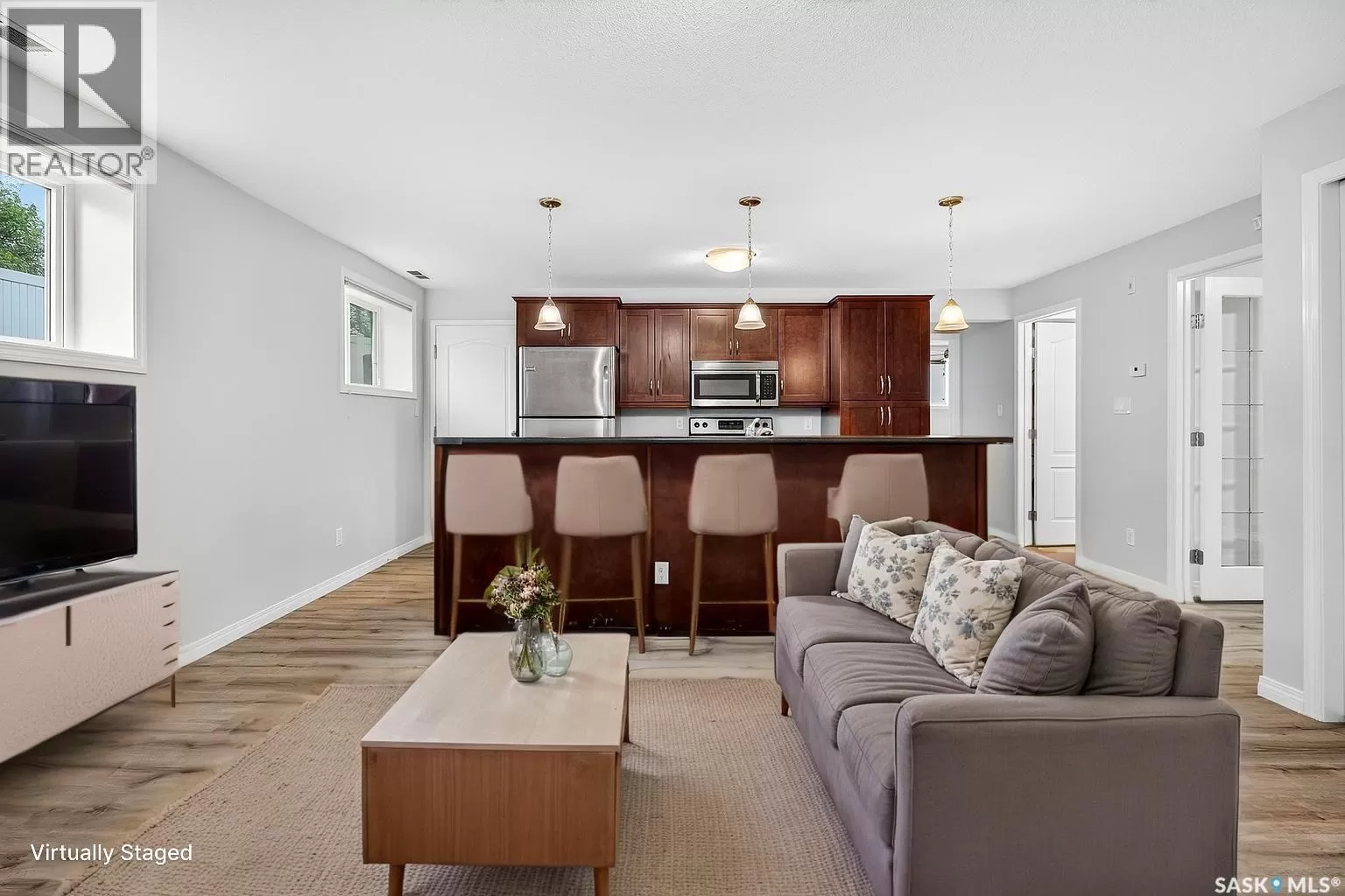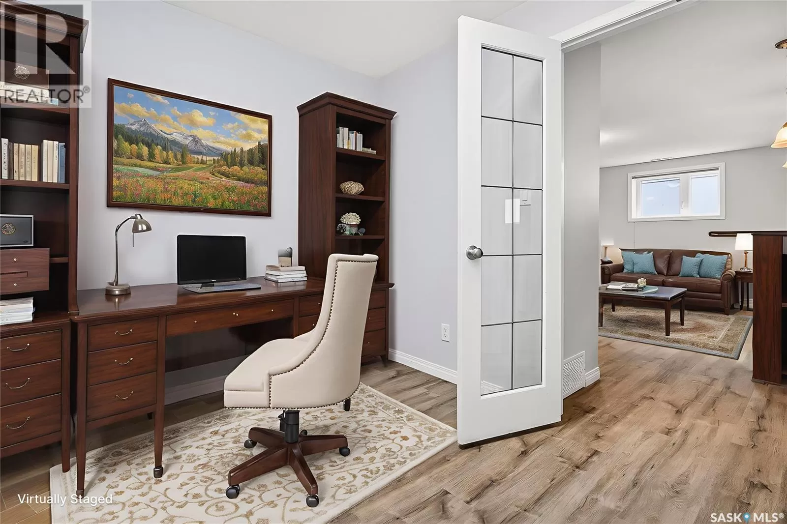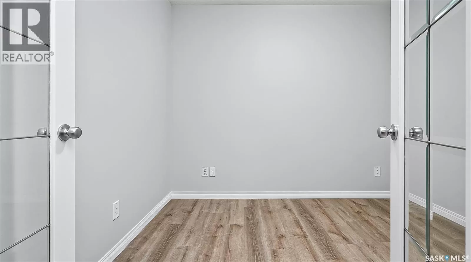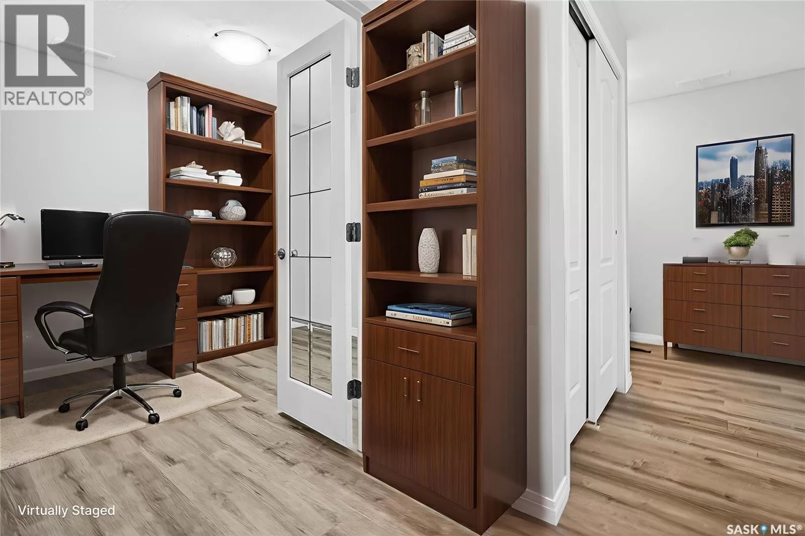 Are you looking for easy living? This beautifully updated main floor condo sits in the South West corner and boasts no stairs - which is sure to be a hit. Heading inside we find a large open concept living area! A spacious living room opens to a large eat-up island with stunning wood cabinetry. The spacious galley style kitchen boasts lots of storage and counter space as well as a stainless steel appliance package! Down the hall we find stunning french doors leading to an office. Next we find a spacious 4 piece bathroom with in unit laundry! At the end of the hall we find two good sized bedrooms! Brand new vinyl plank flooring and baseboards just installed, new hot water tank in '22 and a new AC in '18. This condo has been beautifully cared for - pride of ownership shows throughout! Centrally located within walking distance to downtown and Wakamow park. Low condo fees and a quick possession available! Reach out today to book your showing! (id:27476)