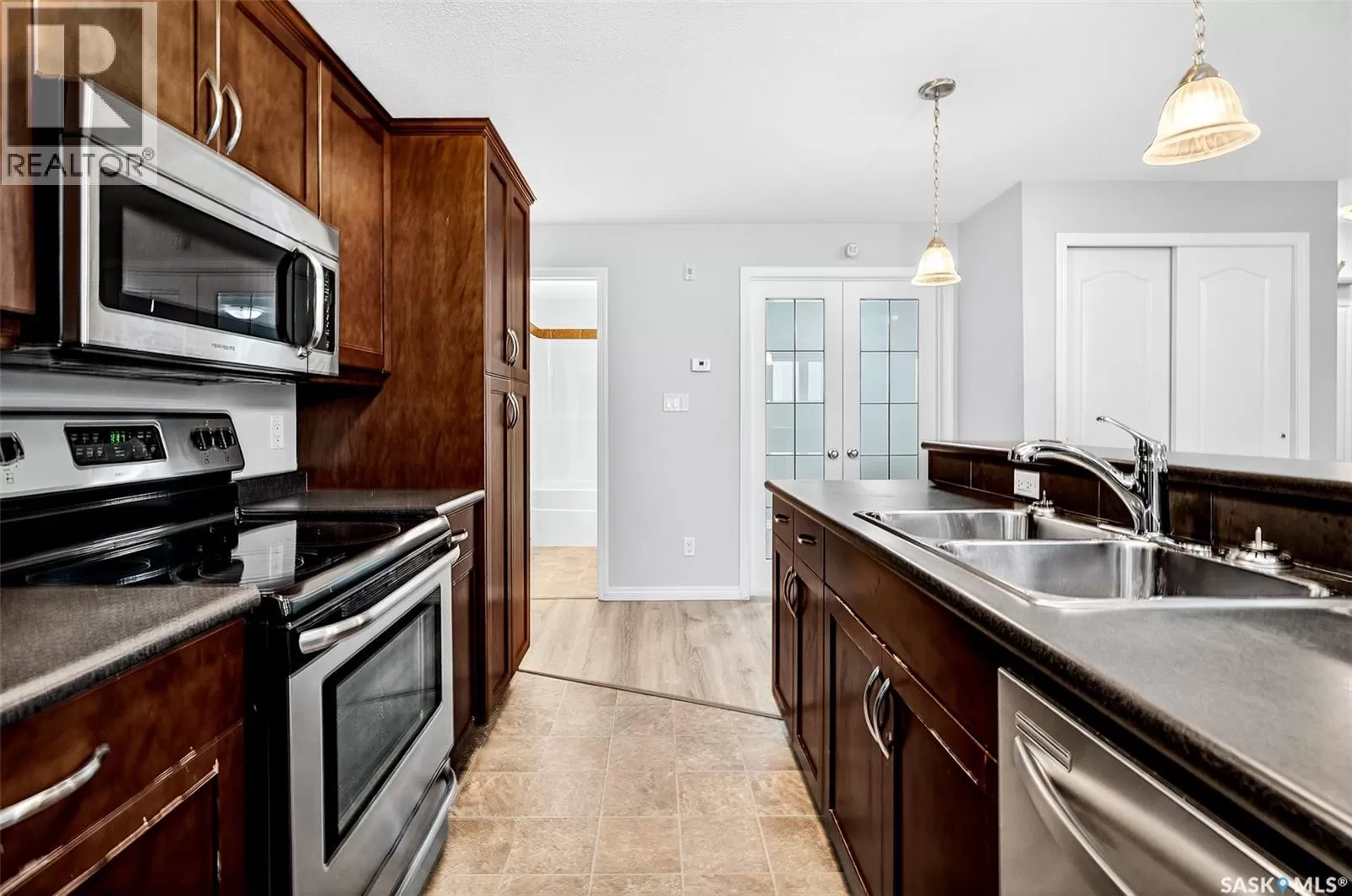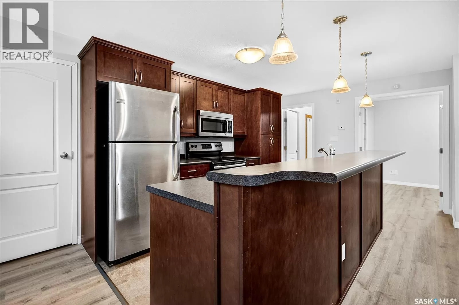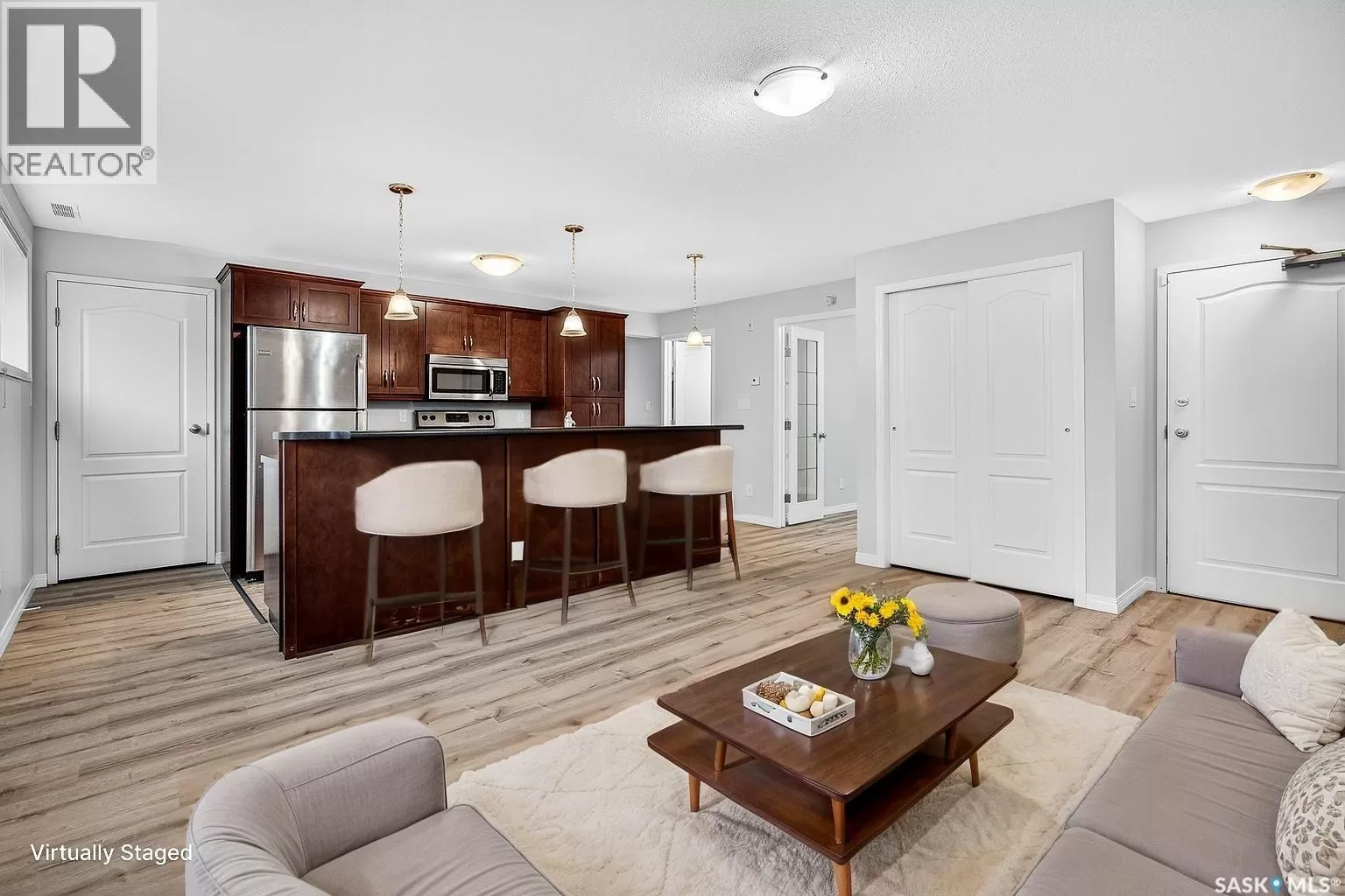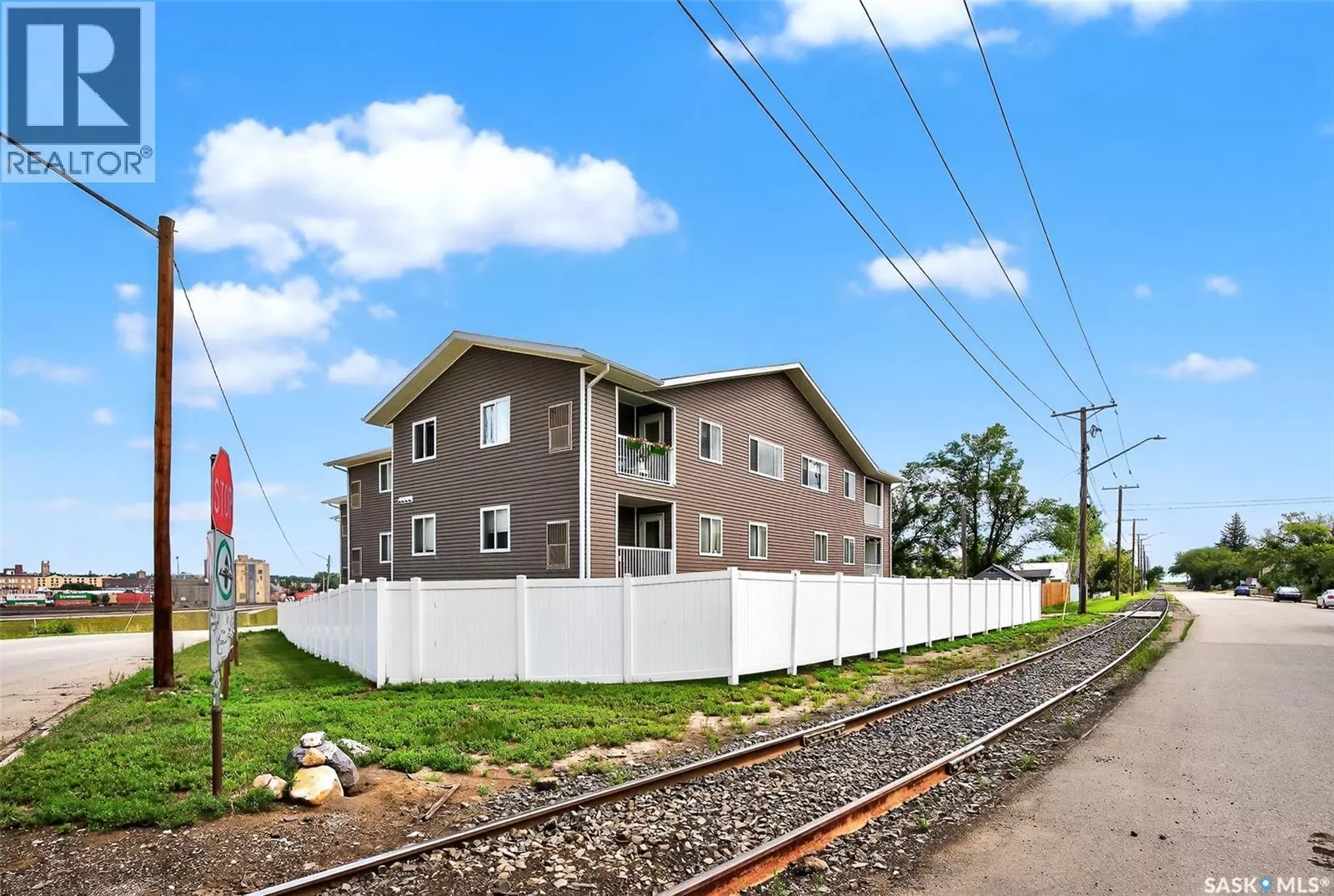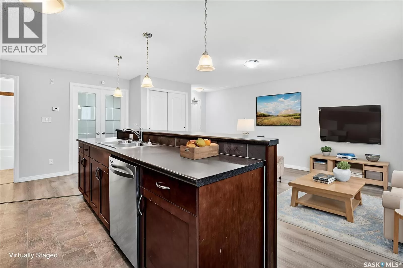 Are you looking for easy living? This beautifully updated main floor condo sits in the South West corner and boasts no stairs - which is sure to be a hit. Heading inside we find a large open concept living area! A spacious living room opens to a large eat-up island with stunning wood cabinetry. The spacious galley style kitchen boasts lots of storage and counter space as well as a stainless steel appliance package! Down the hall we find stunning french doors leading to an office. Next we find a spacious 4 piece bathroom with in unit laundry! At the end of the hall we find two good sized bedrooms! Brand new vinyl plank flooring and baseboards just installed, new hot water tank in '22 and a new AC in '18. This condo has been beautifully cared for - pride of ownership shows throughout! Centrally located within walking distance to downtown and Wakamow park. Low condo fees and a quick possession available! Reach out today to book your showing! (id:27476)