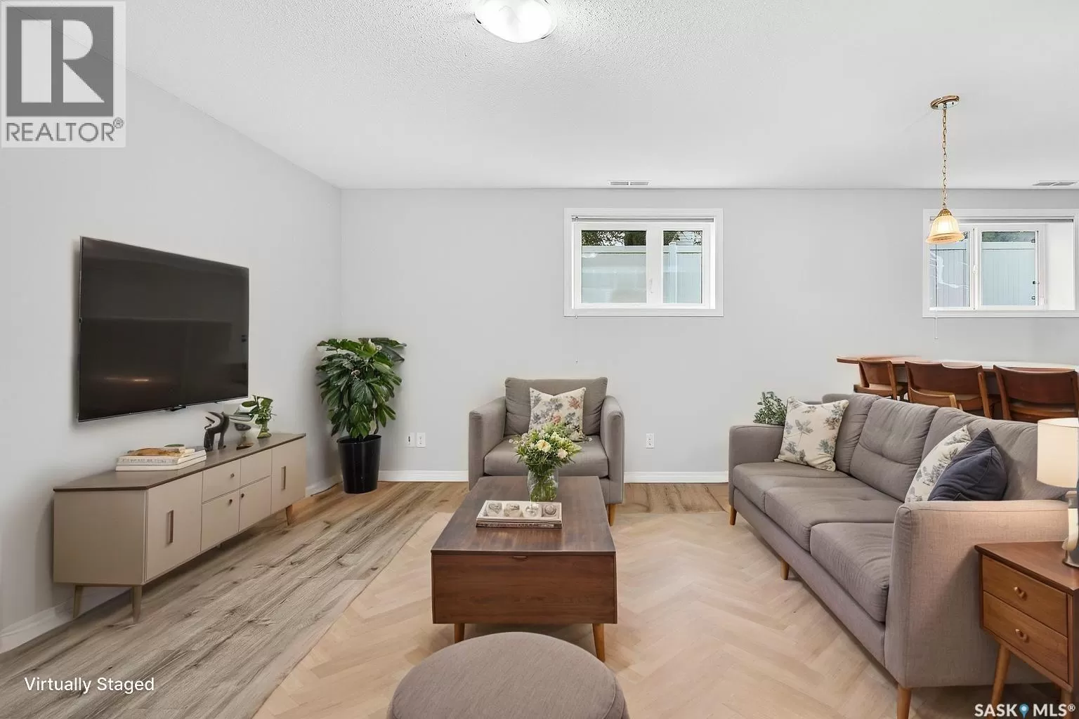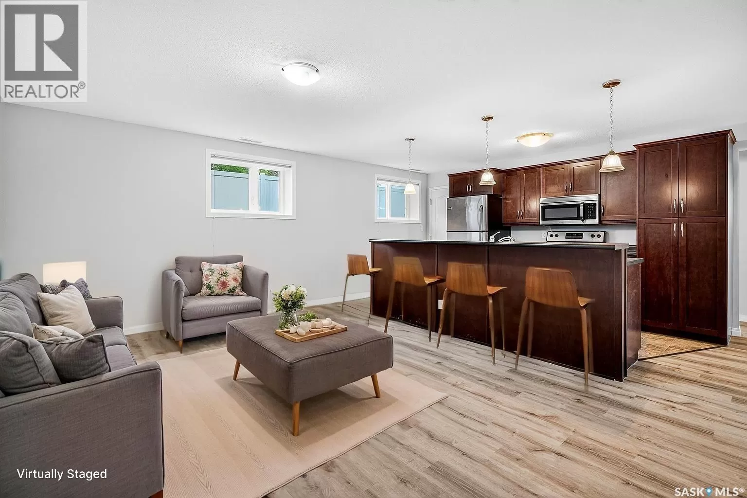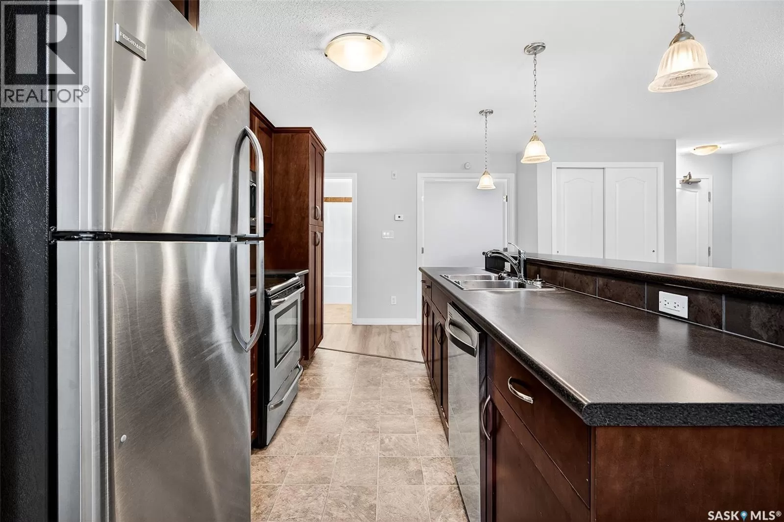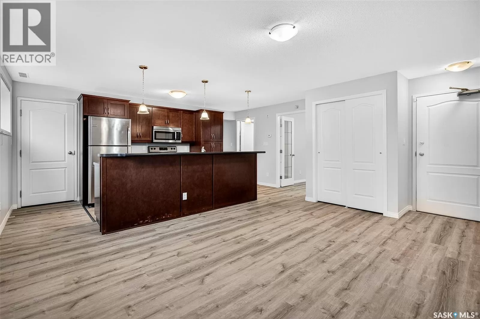 Are you looking for easy living? This beautifully updated main floor condo sits in the South West corner and boasts no stairs - which is sure to be a hit. Heading inside we find a large open concept living area! A spacious living room opens to a large eat-up island with stunning wood cabinetry. The spacious galley style kitchen boasts lots of storage and counter space as well as a stainless steel appliance package! Down the hall we find stunning french doors leading to an office. Next we find a spacious 4 piece bathroom with in unit laundry! At the end of the hall we find two good sized bedrooms! Brand new vinyl plank flooring and baseboards just installed, new hot water tank in '22 and a new AC in '18. This condo has been beautifully cared for - pride of ownership shows throughout! Centrally located within walking distance to downtown and Wakamow park. Low condo fees and a quick possession available! Reach out today to book your showing! (id:27476)