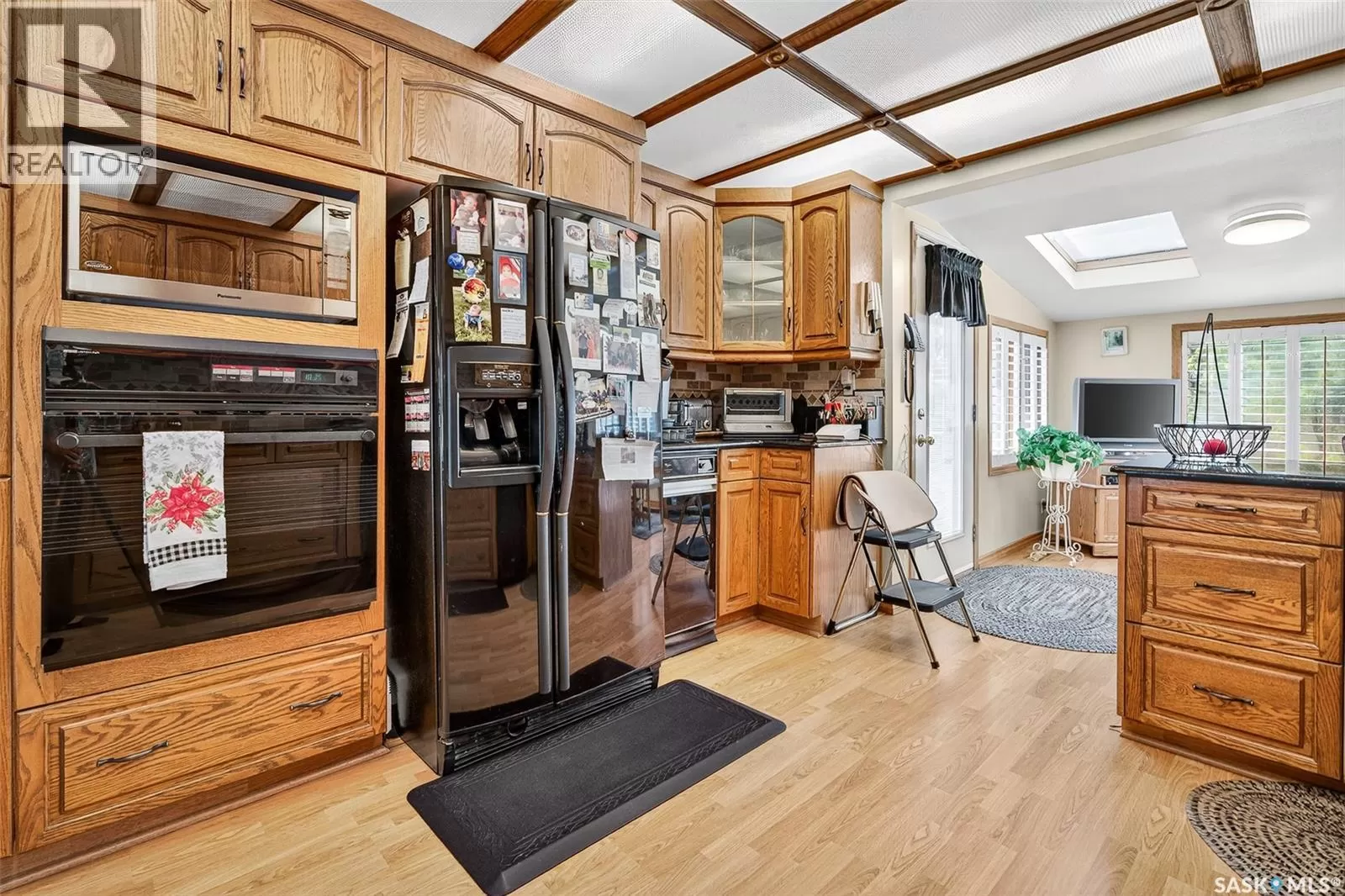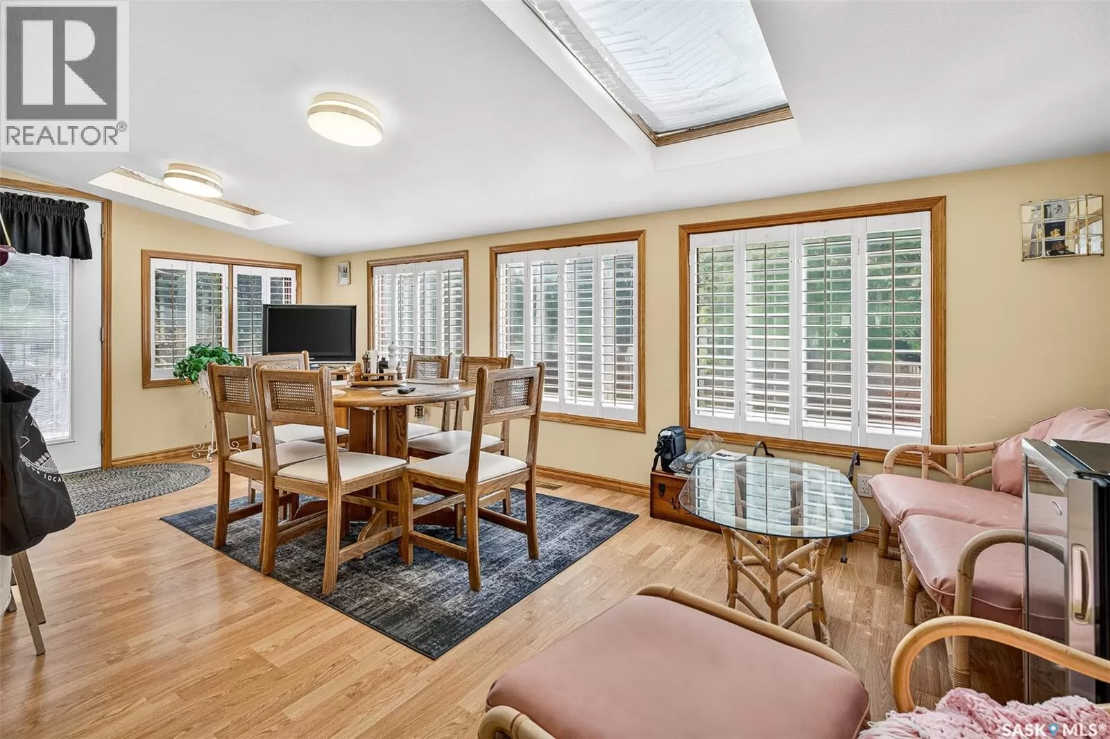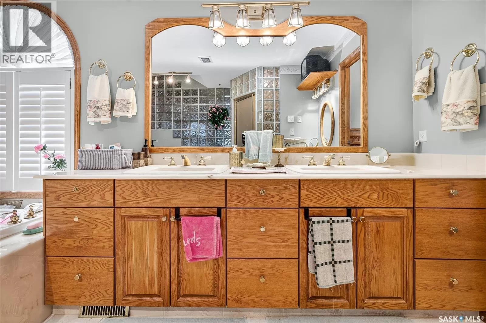 Custom...Comfort...Space!! Perfectly designed space in this modified bi-level home on popular NW crescent. Welcoming immense foyer leads to 3 levels of over 2400 sq feet of elegance. Large living room with bow window flows into a formal dining area with pillars and a bay window. The "chef" kitchen has an abundance of darker cabinetry, pantry, appliances and adjoins a bright southern facing sun room with skylights and overlooks a park-like yard. 2 bedrooms and a full bath complete this level. A few steps up to a custom designed primary bedroom that boasts a fireplace, window seat and mirrored french doors that lead to a 22x9 walk-in closet with built-in dressers, providing a quiet retreat. There's a 5pc ensuite that would make anyone envious with in-floor heat, jetted tub and make-up counters and table. Enjoy the finished basement! Family room has a wet bar, a bedroom/den with a gas fireplace, full bath and utility room. The large laundry/mud room has access to the double heated garage and the back yard oasis. You can access the manicured, fenced back yard from either level. Enjoy the large comfortable deck and patio for relaxing or the brick fireplace/BBQ on those special days!! (id:27476)