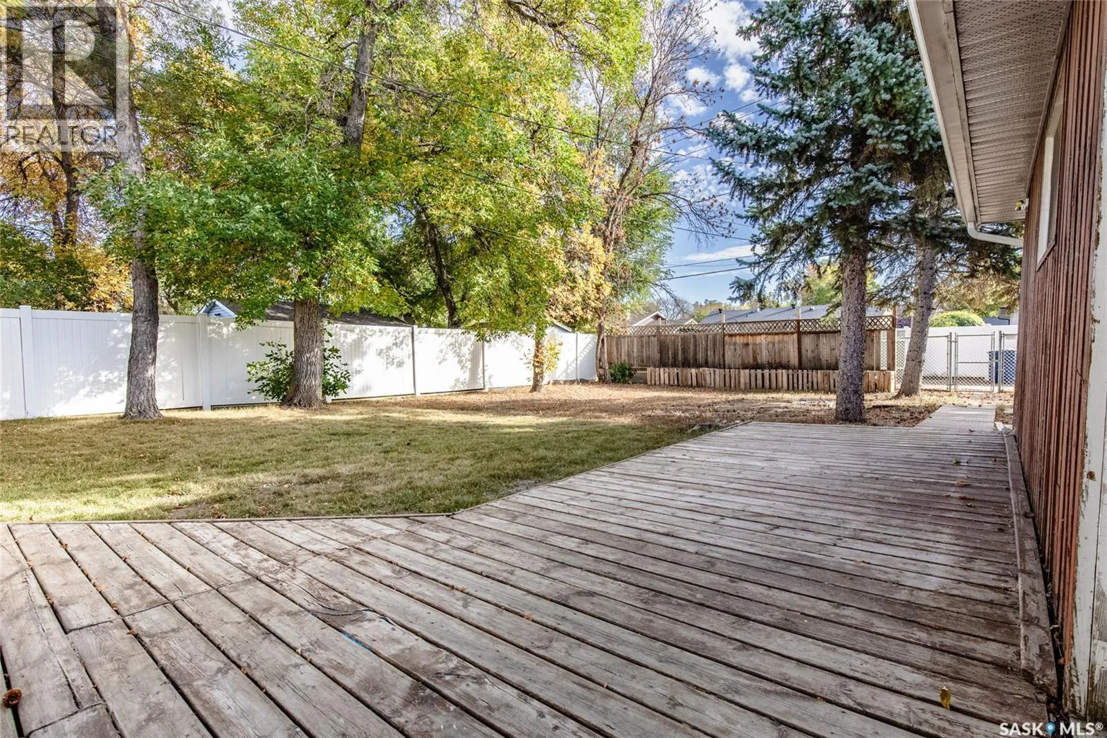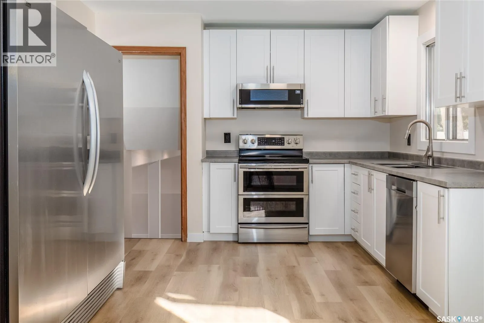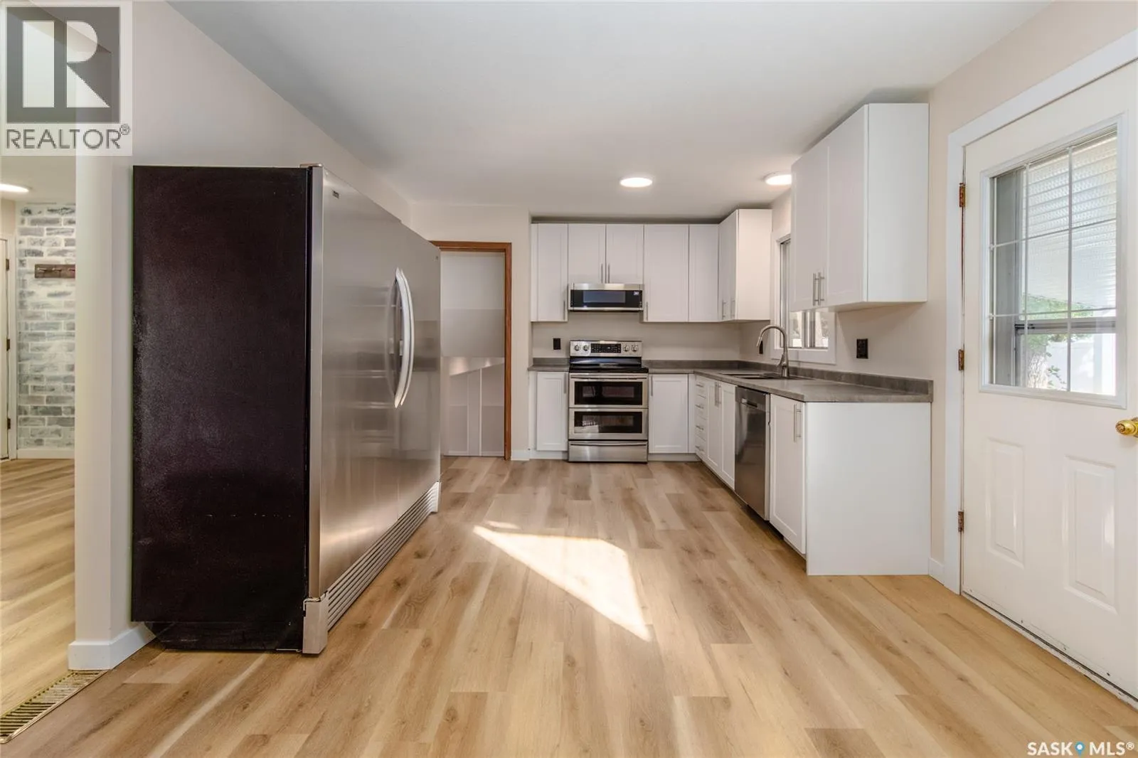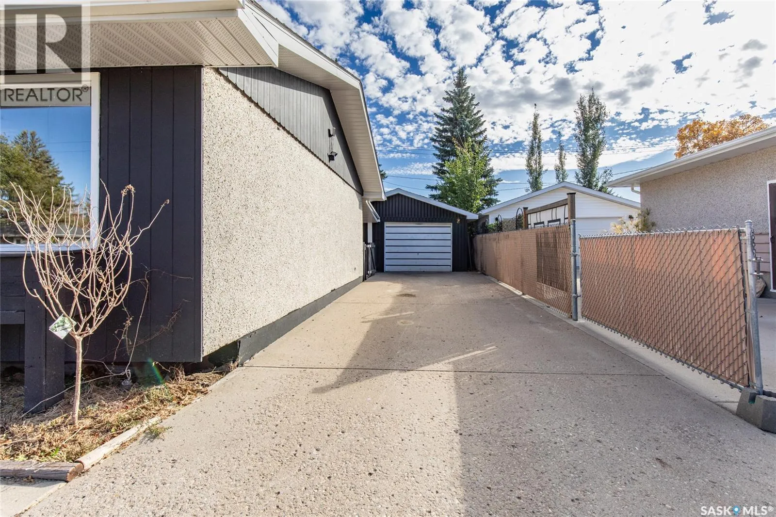 Welcome to this inviting 3-level split home in the highly desirable Palliser area, offering a thoughtful layout, modern updates, and excellent proximity to schools, recreation, and amenities. Step inside to find an eat-in kitchen that has been refreshed with brand new white cabinetry, new countertops, and new dishwasher and microwave hood fan. Also included are the side-by-side SS fridge/freezer, SS double oven, washer and dryer (all appliances included âas isâ). Fresh paint on the main floor, paired with new vinyl plank flooring throughout the entire home, gives the interior a clean and modern feel. The spacious living room has a large picture window. Upstairs, youâll find three comfortable bedrooms (freshly painted) and a 4-pc bathroom with tiled tub surround, while the finished basement provides extra living area perfect for a family room, playroom, or office, plus plenty of additional storage. Central air conditioning ensures seasonal comfort. The property sits on a large, fully fenced lot with alley access and a swing gate wide enough for vehicle entry. A garden area is ready for your green thumb, and the south-facing covered deck is ideal for relaxing or entertaining in every season. Parking is never an issue with an oversized single-car garage, off-street parking, and RV parking. Location is a standout feature â this home is just minutes away from the Kinsmen Sportsplex, SASKPOLY Tech, skateboard park, ball diamonds, walking paths, churches, and elementary schools and a high school. This property truly blends practicality with lifestyle, offering move-in ready updates, flexible living spaces, and an unbeatable Palliser location. Some photos have been stagged. (id:27476)