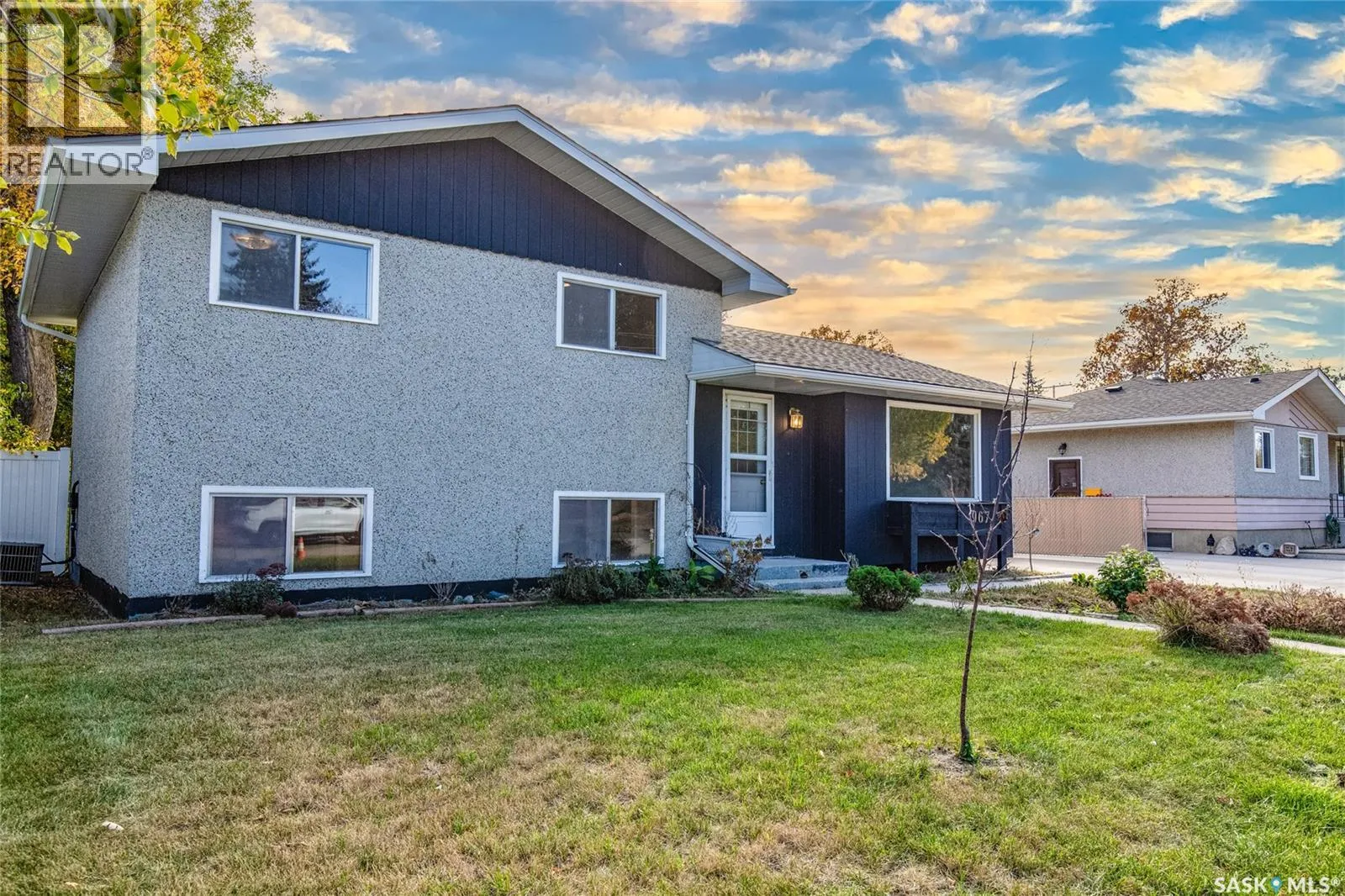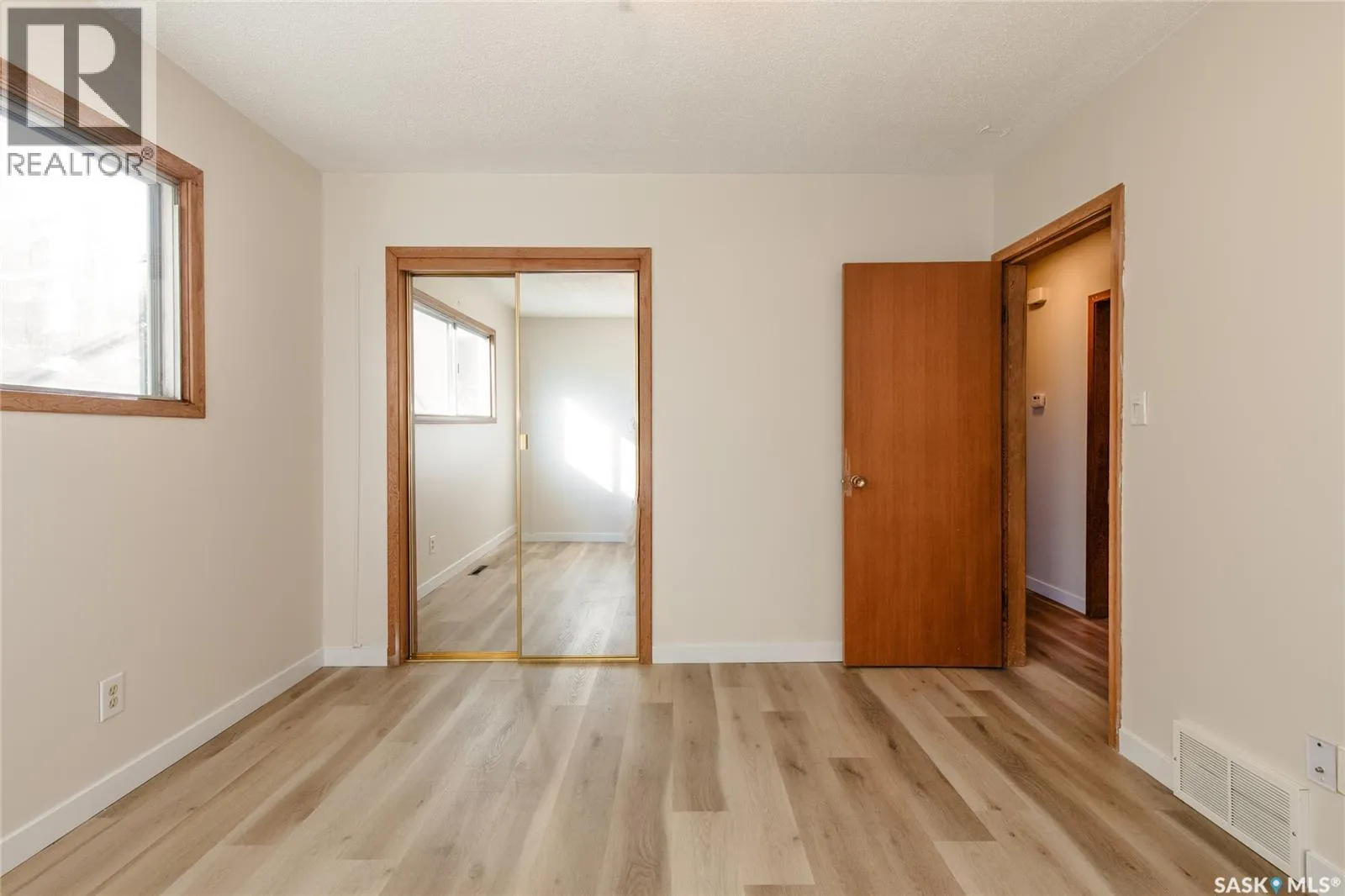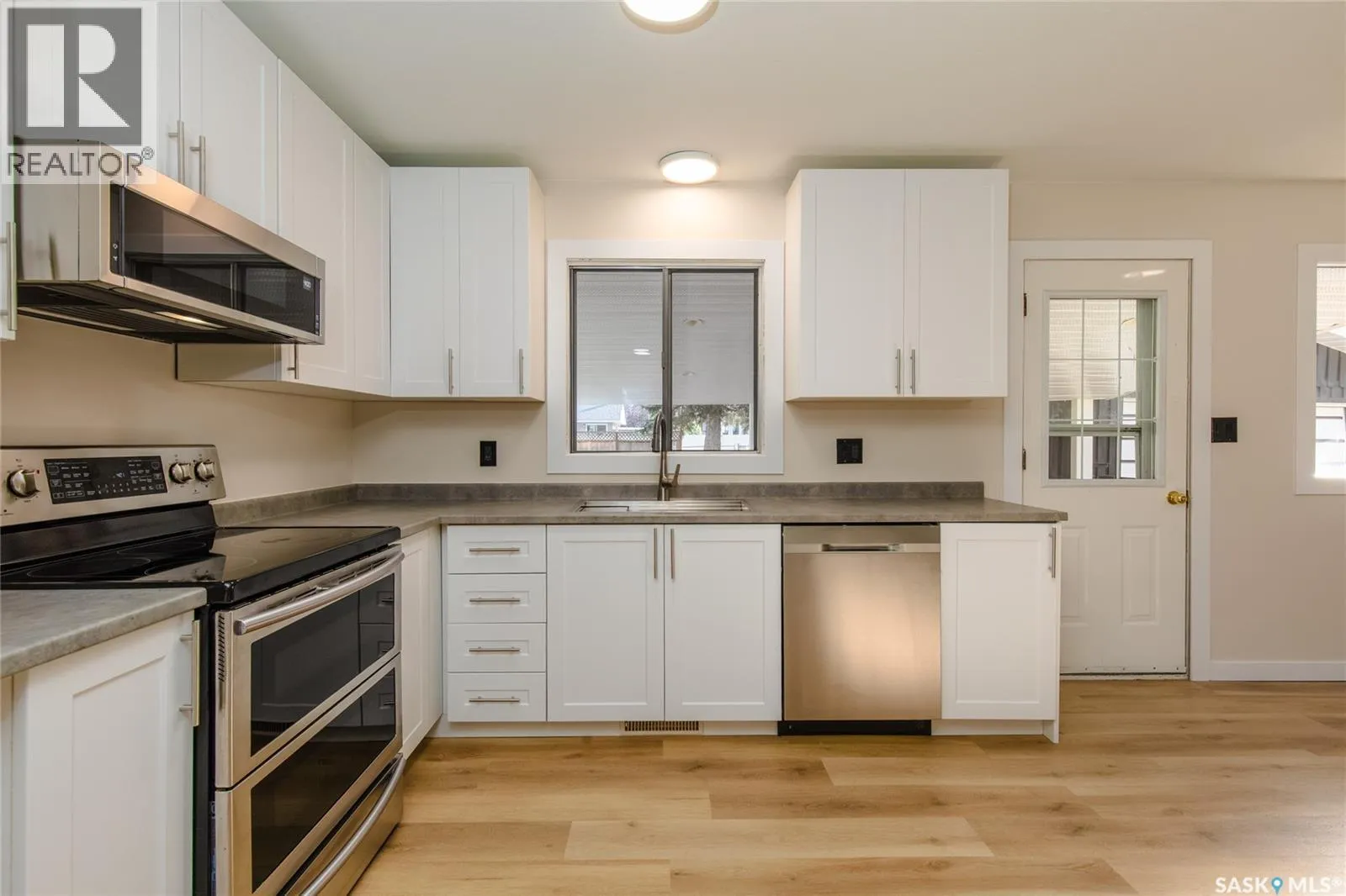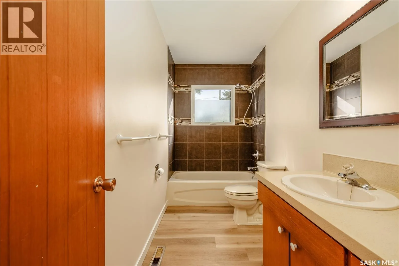 Welcome to this inviting 3-level split home in the highly desirable Palliser area, offering a thoughtful layout, modern updates, and excellent proximity to schools, recreation, and amenities. Step inside to find an eat-in kitchen that has been refreshed with brand new white cabinetry, new countertops, and new dishwasher and microwave hood fan. Also included are the side-by-side SS fridge/freezer, SS double oven, washer and dryer (all appliances included âas isâ). Fresh paint on the main floor, paired with new vinyl plank flooring throughout the entire home, gives the interior a clean and modern feel. The spacious living room has a large picture window. Upstairs, youâll find three comfortable bedrooms (freshly painted) and a 4-pc bathroom with tiled tub surround, while the finished basement provides extra living area perfect for a family room, playroom, or office, plus plenty of additional storage. Central air conditioning ensures seasonal comfort. The property sits on a large, fully fenced lot with alley access and a swing gate wide enough for vehicle entry. A garden area is ready for your green thumb, and the south-facing covered deck is ideal for relaxing or entertaining in every season. Parking is never an issue with an oversized single-car garage, off-street parking, and RV parking. Location is a standout feature â this home is just minutes away from the Kinsmen Sportsplex, SASKPOLY Tech, skateboard park, ball diamonds, walking paths, churches, and elementary schools and a high school. This property truly blends practicality with lifestyle, offering move-in ready updates, flexible living spaces, and an unbeatable Palliser location. Some photos have been stagged. (id:27476)