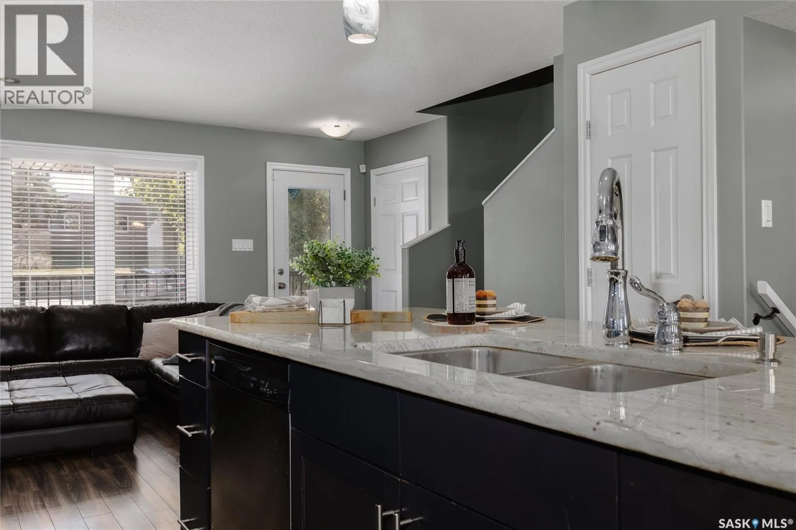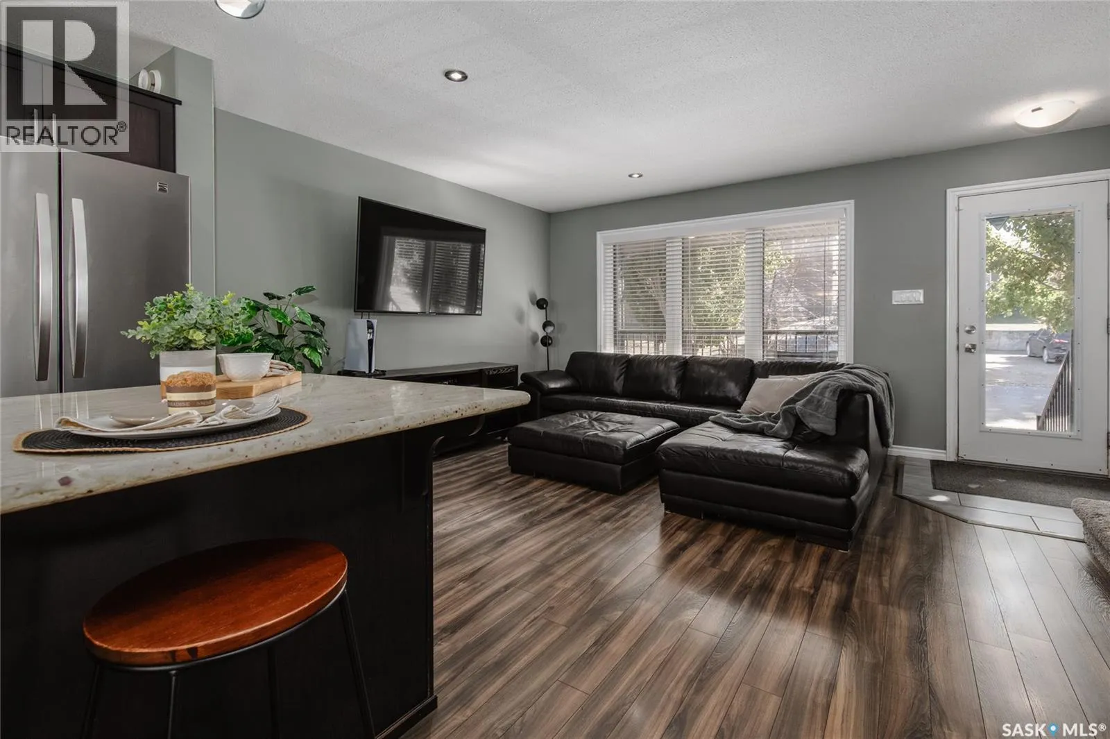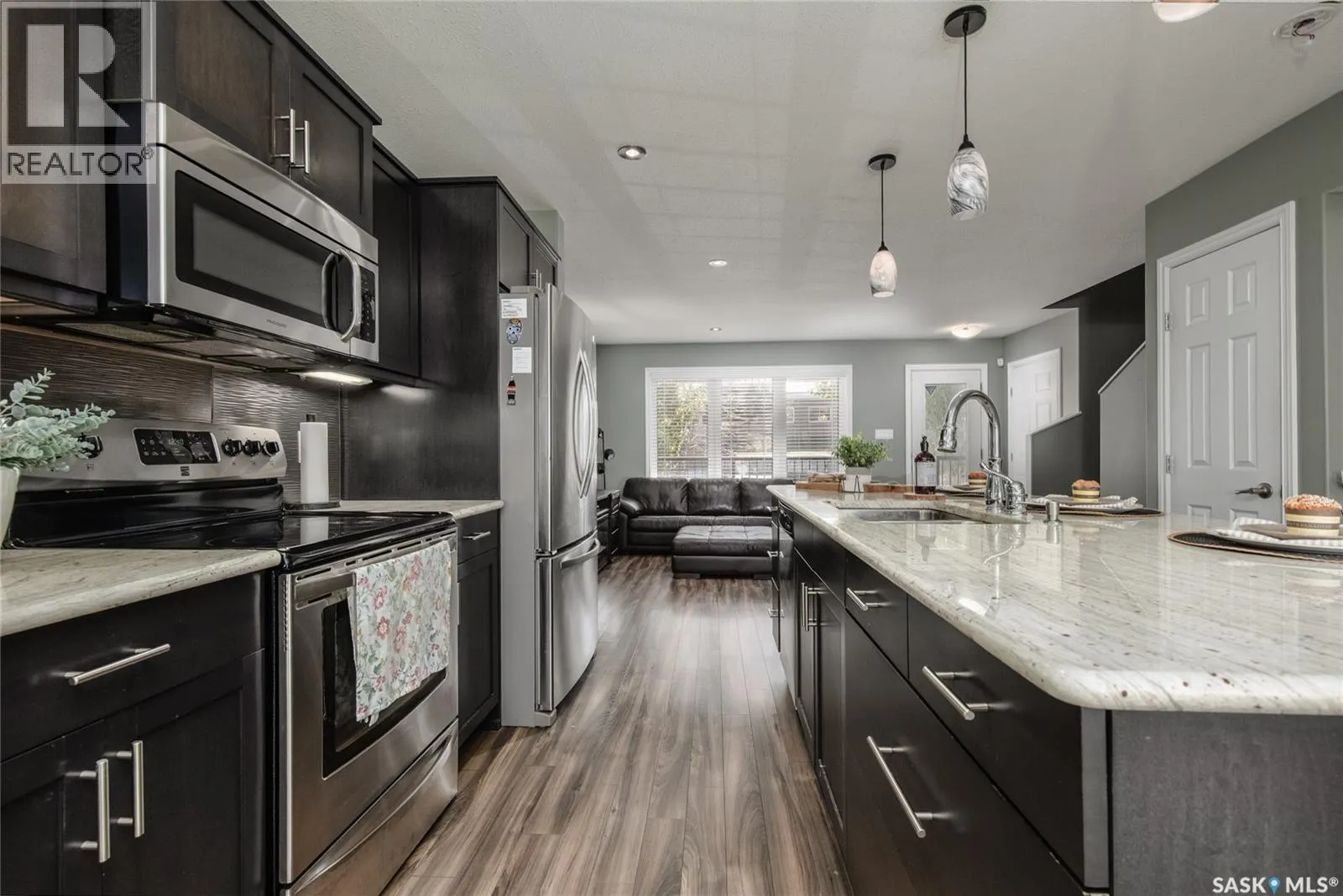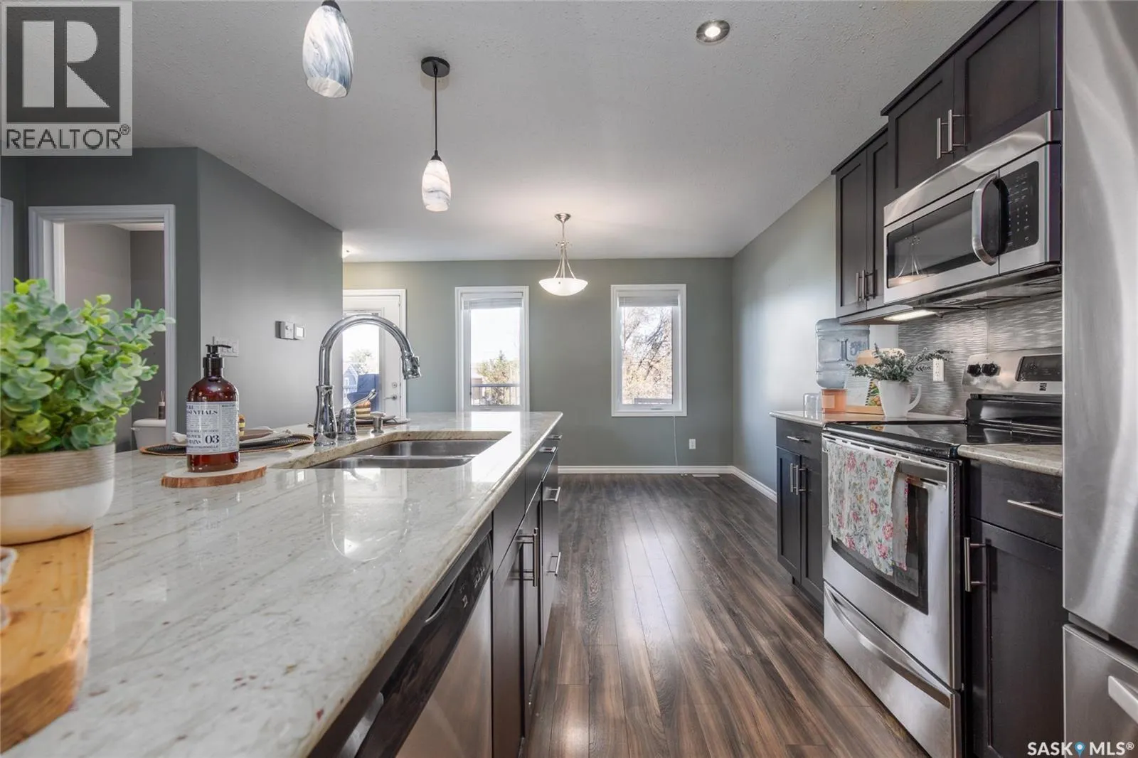 This isnât just a house, itâs the total package: Open-concept main floor, stunning kitchen with granite countertops, and dark cabinets, with an oversized island, and stainless steel appliances. Bright living room up front, dining area at the back, plus a convenient 2-piece bathroom on the main level, perfect for family dinners or hanging out with friends. Upstairs: three bedrooms and a full bath, including a spacious primary with walk-in closet. Downstairs: cozy family/theatre room, guest bedroom, and another full bathroom. Plus a cozy spot for family movie nights. Outside, enjoy a fully fenced yard, extra parking, and even a spot to pull in a camper. Location is prime. Just steps from Cornerstone Christian School, minutes from downtown, and quick highway access makes commuting or trips to 5 Wing Moose Jaw a breeze. Over 2,000 sq. ft. of finished space, thoughtfully laid out, move-in ready, and ready to make your own. Donât just buy a house--buy a lifestyle! (id:27476)