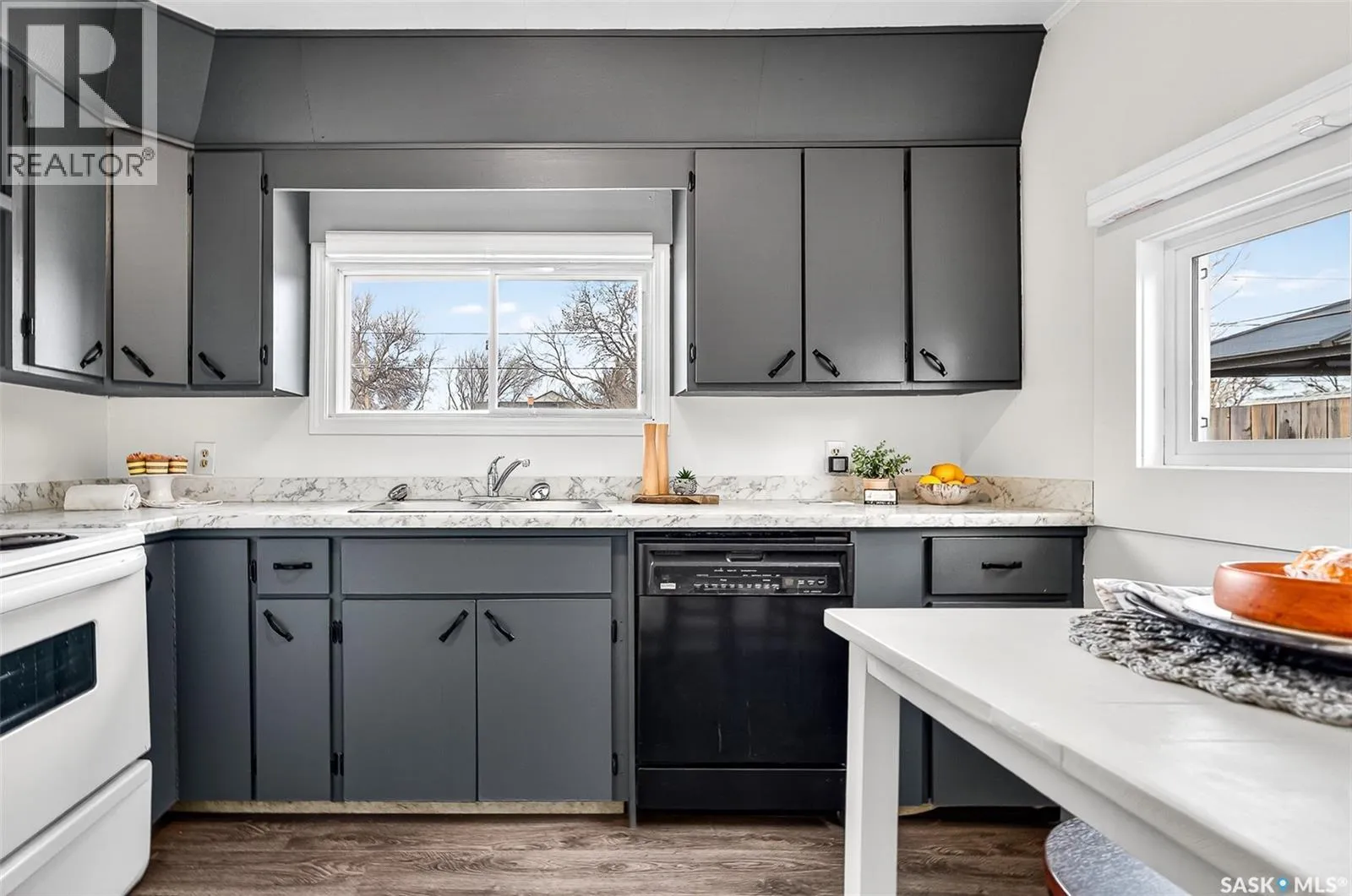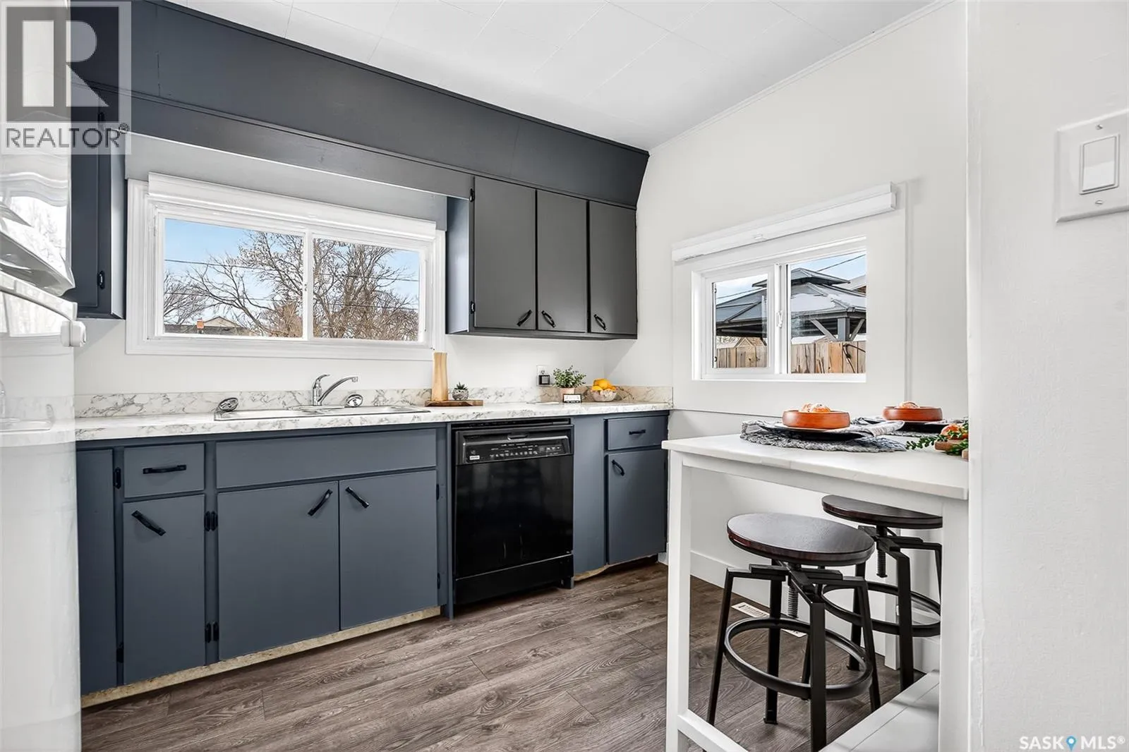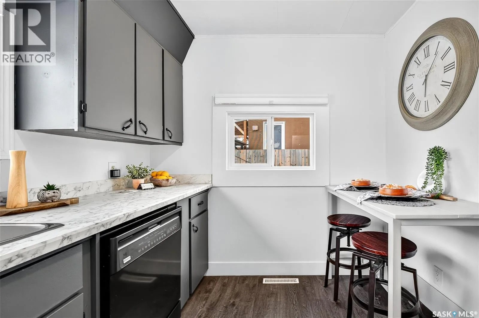 Updated, affordable home close to schools, parks and amenities! This home is move-in-ready at an attractive price point! Updated throughout over the last year, this home has had new flooring installed, updated bathroom, kitchen, new eaves, and most windows replaced! This home sits on a spacious lot with off-street parking, or room to build a garage, with a fenced yard and mature trees. Inside you are invited to a beautiful living area with large south-facing windows pouring the space with natural light. You have a cute eat-in kitchen with ample cabinetry and marble-style countertops. You have two spacious bedrooms, one of which features custom-built-in bunk beds with built-in desks underneath. Under the beds there's room for toys, dressers, or storage, the choice is yours! You have a beautifully updated 4-pc bathroom on this level as well. Downstairs the basement has started renovations and is ready for you to call your own! A great space for a tv room, more storage, hobby space, playroom, you name it! A great home for a great price! Book your showing today! (id:27476)