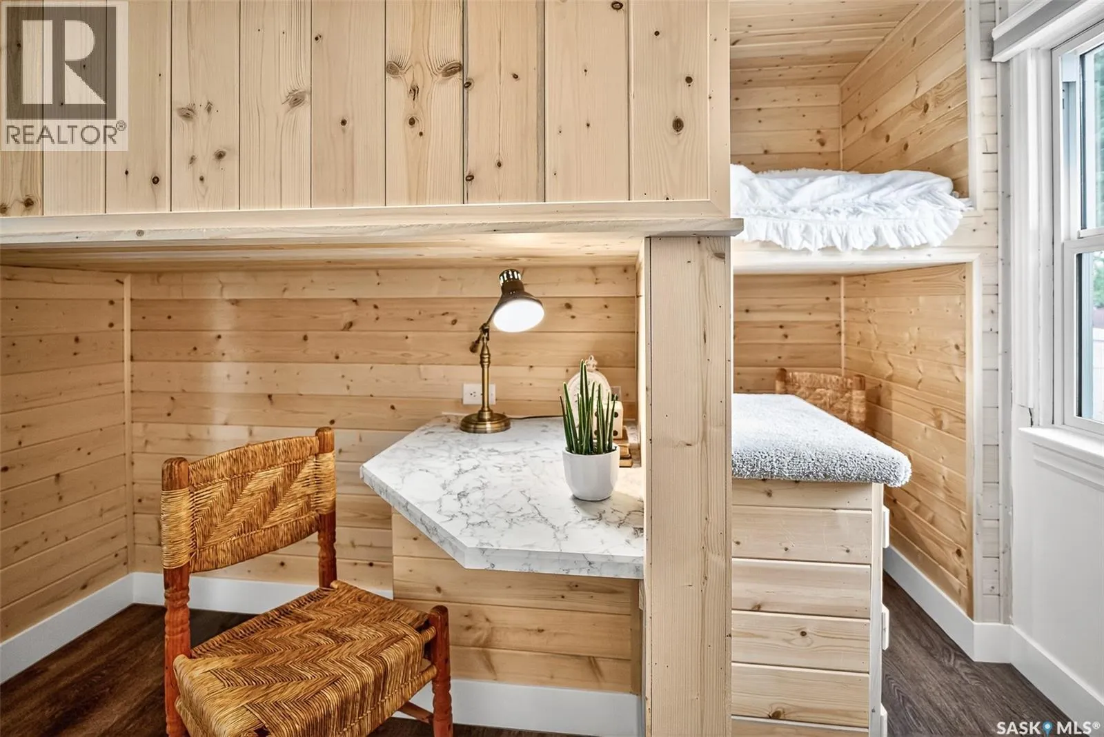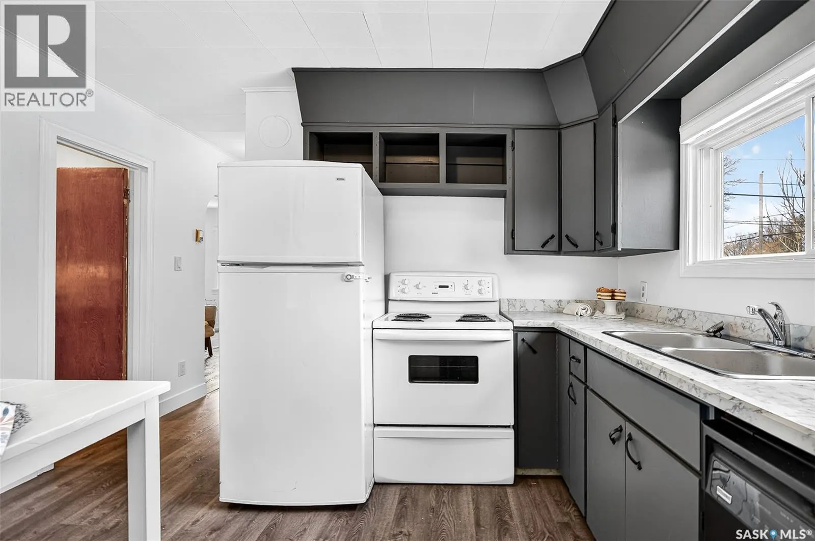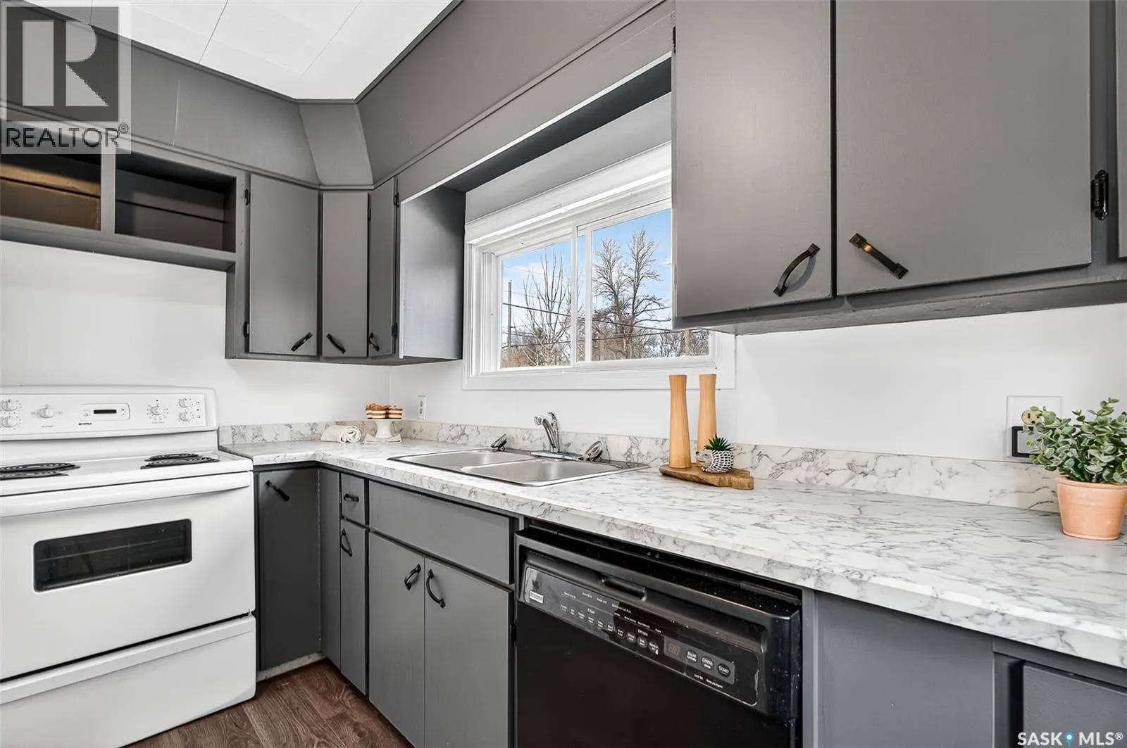 Updated, affordable home close to schools, parks and amenities! This home is move-in-ready at an attractive price point! Updated throughout over the last year, this home has had new flooring installed, updated bathroom, kitchen, new eaves, and most windows replaced! This home sits on a spacious lot with off-street parking, or room to build a garage, with a fenced yard and mature trees. Inside you are invited to a beautiful living area with large south-facing windows pouring the space with natural light. You have a cute eat-in kitchen with ample cabinetry and marble-style countertops. You have two spacious bedrooms, one of which features custom-built-in bunk beds with built-in desks underneath. Under the beds there's room for toys, dressers, or storage, the choice is yours! You have a beautifully updated 4-pc bathroom on this level as well. Downstairs the basement has started renovations and is ready for you to call your own! A great space for a tv room, more storage, hobby space, playroom, you name it! A great home for a great price! Book your showing today! (id:27476)
