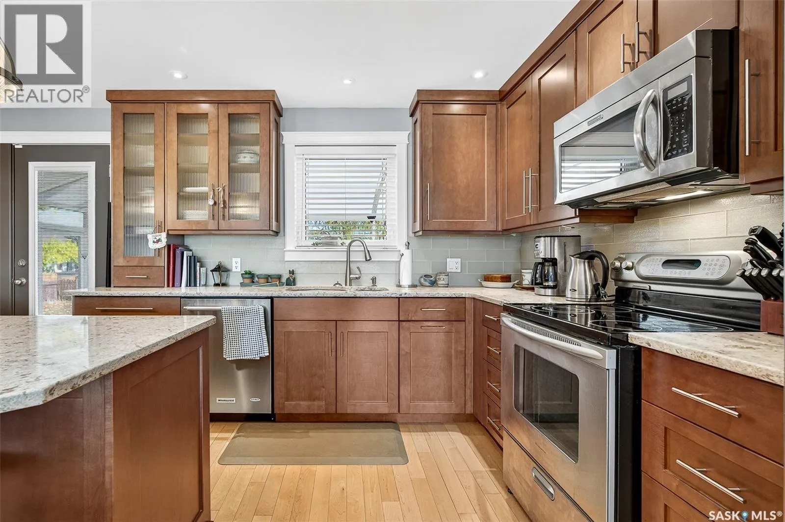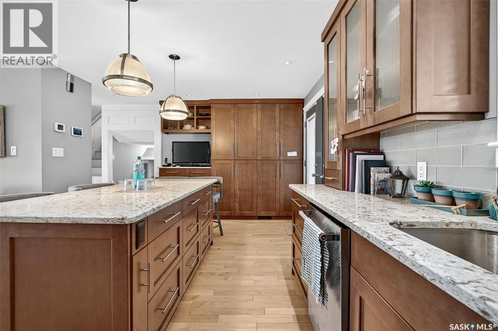 One Owner, Custom Built 5-level split offering an impressive 1,957 sq ft of thoughtfully designed living space. Located in the highly sought-after Sunningdale area, this home showcases craftsmanship and foresight well beyond its year built. As you enter the main level features an open-concept design that seamlessly blends functionality and style. A spacious living room with large windows fills the space with natural light and creates a warm, welcoming atmosphere. The generous dining area flows effortlessly into the renovated kitchen, which is a true highlight â complete with stone countertops, stainless steel appliances, an eat-in island, abundant cabinetry, and an area that could be a coffee bar. Perfect for both everyday living and entertaining. Upstairs is a rare findâ¦.4 bedrooms all on one level. There are three bedrooms, a 4pc main bathroom and a spacious primary bedroom with a 3-piece ensuite and a large walk-in closet. As you walk into the 3rd level you enter a warm, inviting family room featuring a cozy wood-burning fireplace, with convenient access to the double attached garage with radiant heat, laundry area, 3pc bathroom and the access to the fully fenced backyard â ideal for gatherings and outdoor enjoyment. The next level offers a generous games or recreation room, providing endless possibilities for a home gym, playroom, or entertainment area. On the fifth and final level, youâll find a large versatile room with plenty of storage space, the utility area, and potential for relocating the laundry if desired. Outside, enjoy a beautifully landscaped and fully fenced yard complete with underground sprinklers, 2 sheds and a screened-in three-season deck with composite decking (which also has access off the kitchen), perfect for relaxing or entertaining while staying sheltered from the elements. This property perfectly blends quality construction, tasteful updates, and a functional multi-level layout. (id:27476)