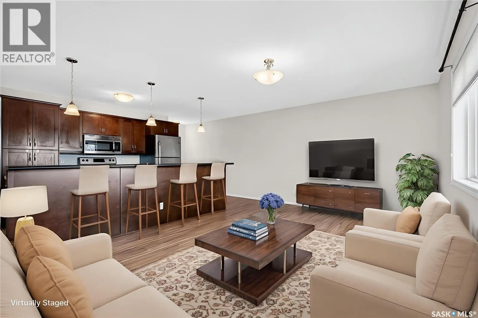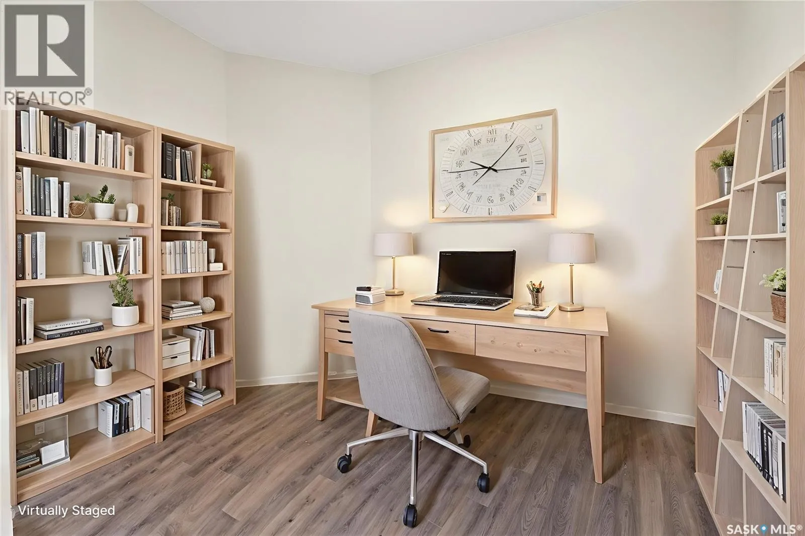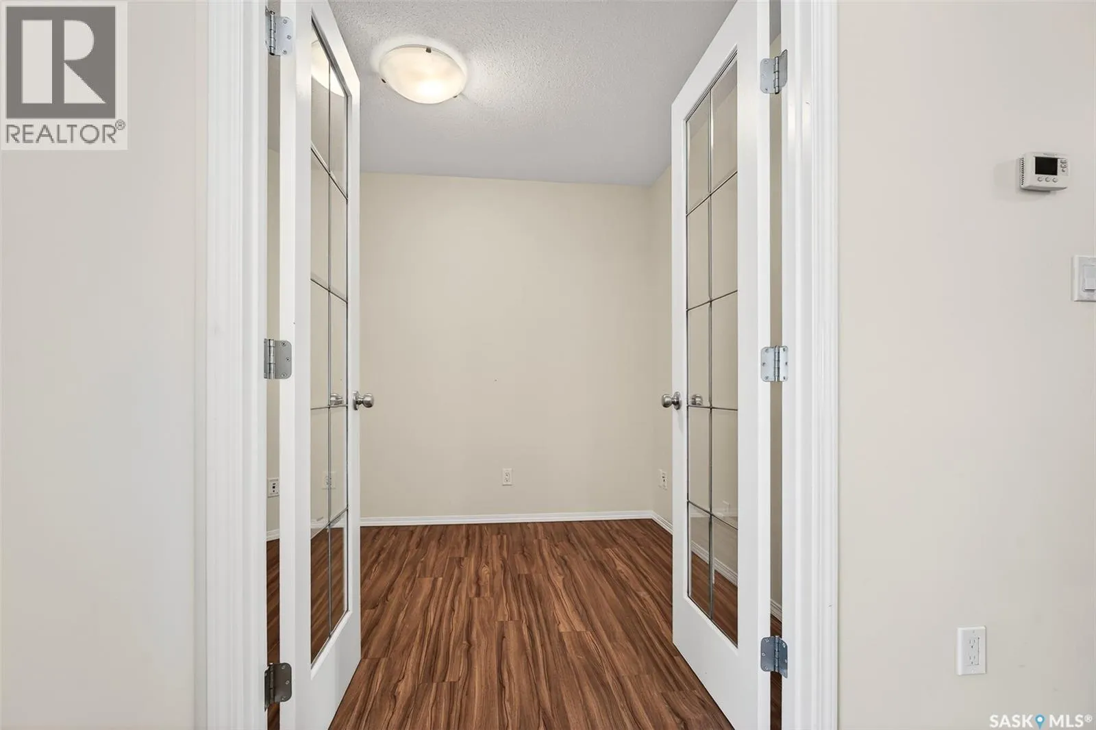 Penthouse living awaits at Plaxton Ridge Condos in this sunny 2-bedroom plus a den unit. With 826 sq.ft. of living space, this top-floor gem boasts a bright and open layout. The stylish kitchen features sleek dark cabinets, stainless steel appliances, and a spacious eating bar. French doors lead to a cozy office space, while the unit also includes convenient in-unit laundry and a charming northwest-facing deck. Enjoy peace of mind with the Intercom Security System for added security. Monthly condo fees of $306 include a reserve fund for building maintenance, lawn care, and more. Don't miss out on this vacant unit - it's ready for its lucky new owner! (id:27476)