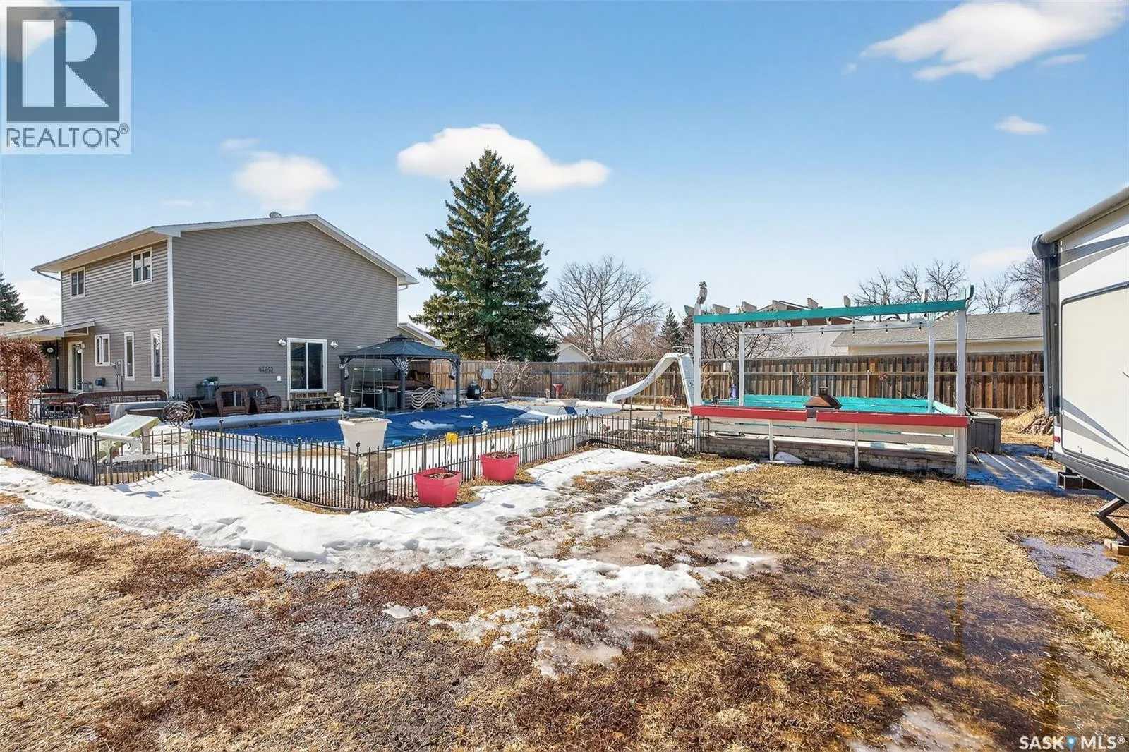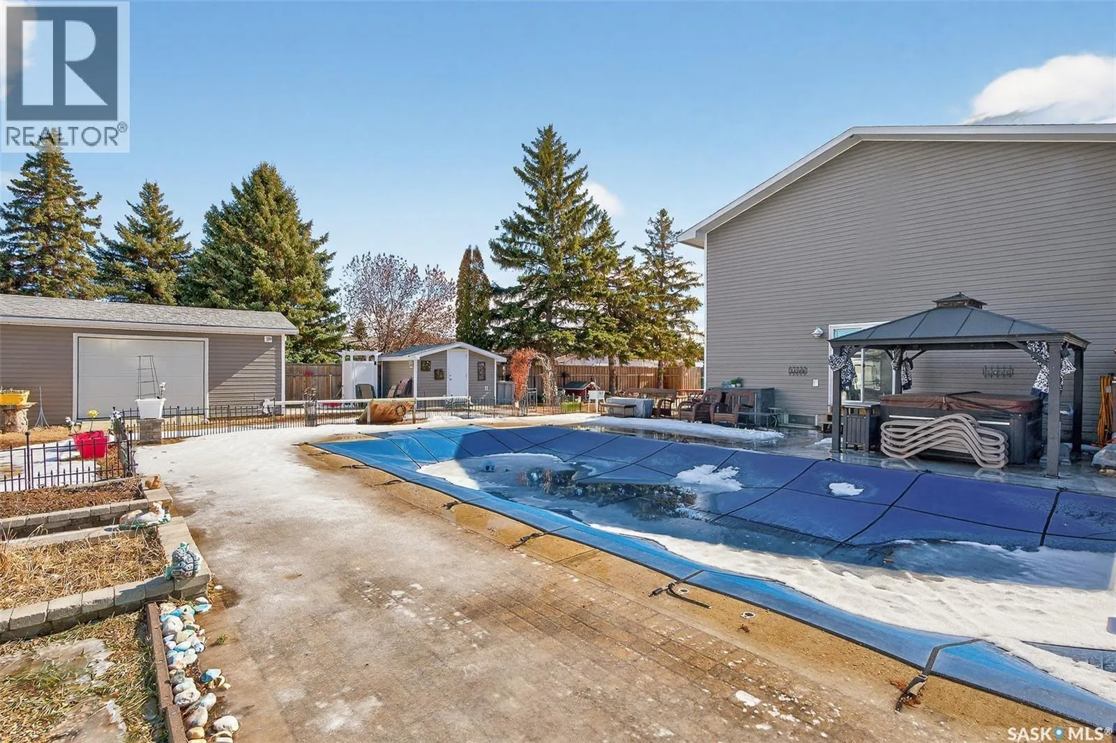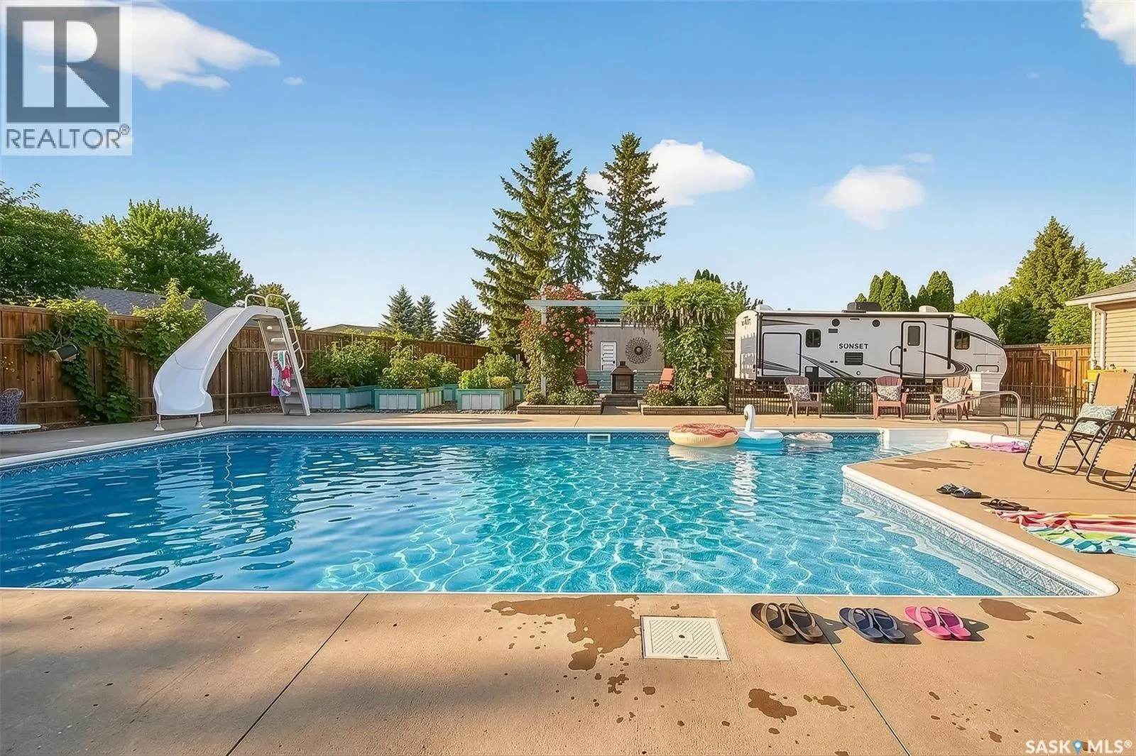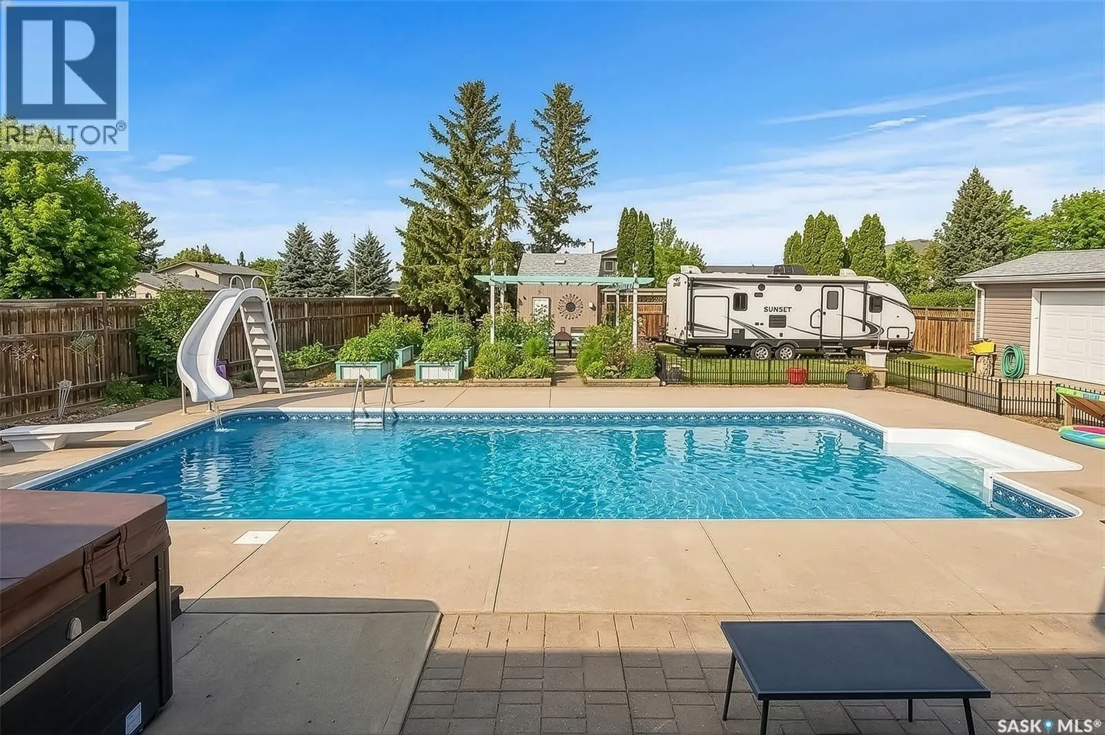 Welcome to 1345 Prince Crescent in the desirable Palliser area of Moose Jaw. This beautifully updated 2,280 sq ft two-storey home offers exceptional space and functionality for family living. The main floor features a bright open foyer with office space, a spacious living room, a formal dining area perfect for entertaining, and a large kitchen with abundant cabinetry and counter space, flowing into a comfortable Great Room ideal for relaxing. There is also convenient access to the double attached garage, along with a 3-piece bathroom off the entry. The upper level includes four bedrooms and a full 4-piece bathroom, highlighted by a generous primary bedroom with an updated 3-piece ensuite. The fully developed lower level provides additional living space with a large family room, an extra bedroom or office, a full 4-piece bathroom, and a spacious laundry room with plenty of storage. Situated on a massive 13,628 sq ft lot, the backyard is a true private retreat designed for both relaxation and entertaining. Enjoy long summer days in the impressive 18' x 36' heated in-ground poolâperfect for everything from morning swims to hosting unforgettable gatheringsâoffering plenty of space for family and guests alike. As the evening cools, unwind in the inviting hot tub, ideal for soaking under the stars or starting your day with a peaceful morning coffee. The yard also features a 30' RV or motorhome parking pad with back alley access, along with multiple outbuildings including a workshop with a 40-amp panel. The exterior is fully landscaped with a low-maintenance zero-scaped front yard and rubber-paved driveway and walkways sets the curb appeal for this home. Recent updates include a new Combi boiler (on-demand hot water) in (2021), water softener (2024), and an expanded 36-inch front entry door. This move-in-ready home offers incredible value and must be seen to be fully appreciated. (id:27476)