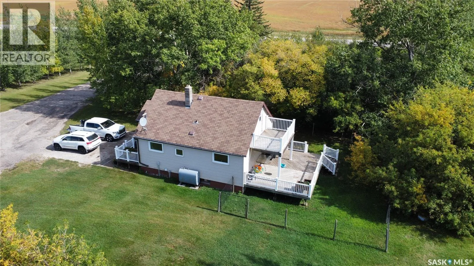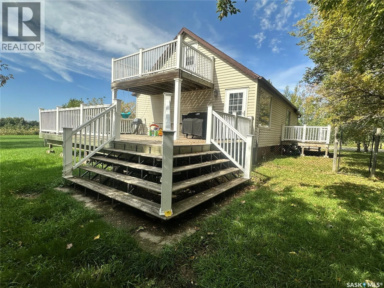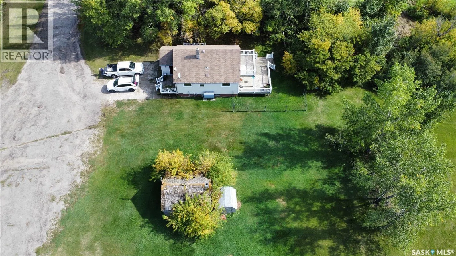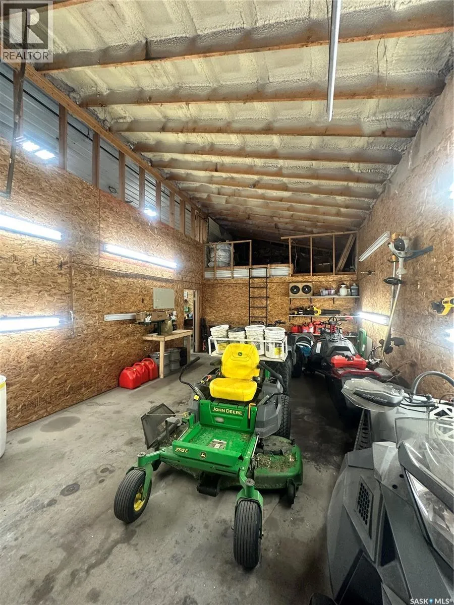 This charming acreage offers peaceful rural living just 5 km from the amenities of Raymore and within commuting distance to the Jansen Mine. Nestled in a mature and partially treed yard, the home features a bright and functional main floor with an open kitchen and dining area, a full bathroom with great storage, a cozy bedroom, and a welcoming living room that opens to a sunny south-facing deckâperfect for your morning coffee or evening unwind. Enjoy double-deck access with an additional deck off the dining room, and a large porch area with plenty of space to kick off your boots and settle in. Upstairs, youâll find a spacious bedroom with access to its own private upper south-facing deck. Adjacent is a versatile bonus roomâcurrently used as a walk-in closetâthat could easily be transformed into a den or office with beautiful views of the property. The basement is unfinished, offering potential for further development or storage. Outside, the property features a 56' x 40' heated shop with spray foam insulation, a 200 AMP electrical panel, an air compressor, and a mezzanine area for additional storage or workspace. The yard is a peaceful retreat with established trees offering privacy and shade, a large garden area perfect for growing your own produce, and new tree growth beginning to flourish along the west sideâadding future shelter and natural beauty to the landscape. (id:27476)