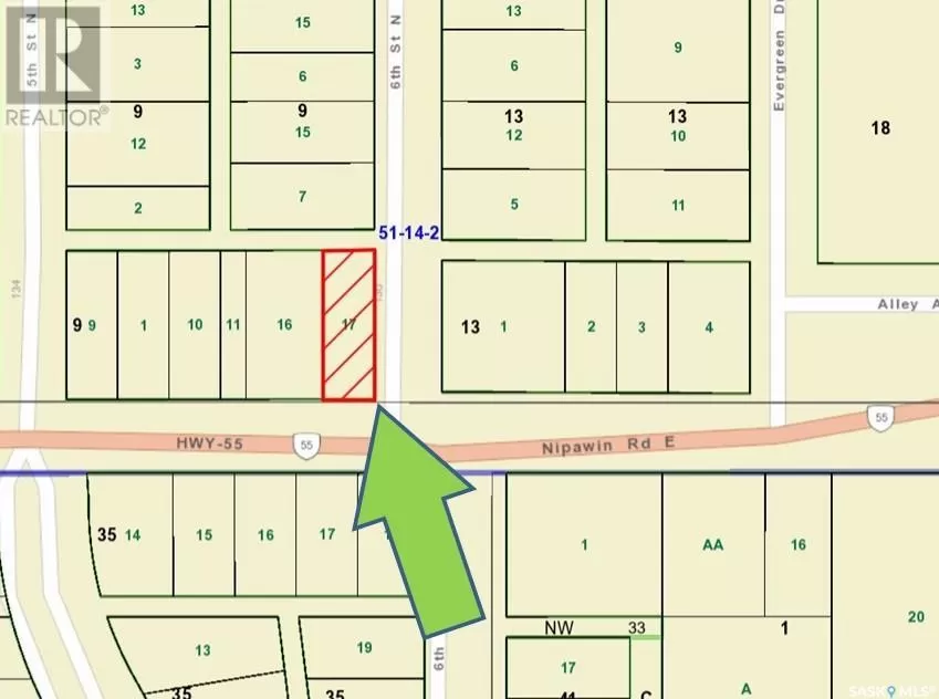 PRIME HIGHWAY COMMERCIAL vacant lot on Nipawin Road East / HWY 55 with 50 ft frontage on the East âgatewayâ to Nipawin! Lot size is approx. 50x144.9â (0.17 acres). Located near the road to the Evergreen center, hotel and the golf course, and is kitty-corner from the gas station. Zone C2 â (C2 â Highway Commercial â more in the Zoning Bylaw). Seller states GST doesn't apply to the sale price. Buyer is required to complete construction within 2 years of purchase. Building permit is required. Town of Nipawin incentives might be available, conditions apply. Property taxes to be assessed. Nipawin and area are known for great fishing, hunting and the great outdoors. Bring your business to Nipawin! Lot across the street is also for sale â see listing SK992238. (id:27476)