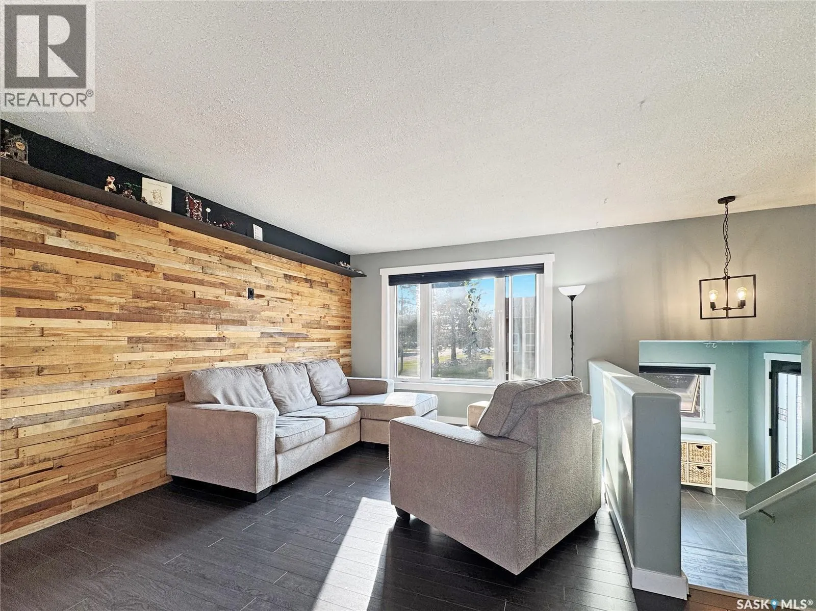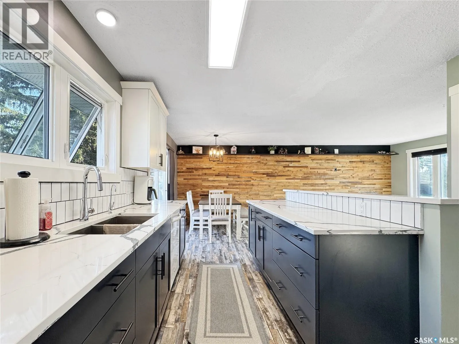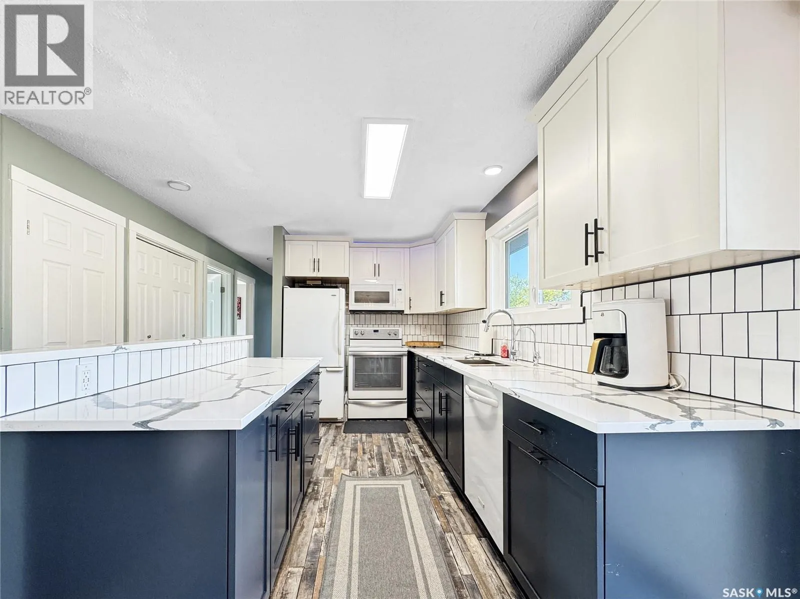 Welcome to this large family home perfectly situated on a desirable corner lot in the beautiful Centennial neighborhood. Originally built in 1979, with additional living quarters added in 1991, this home offers plenty of room for your family to grow and enjoy. Step inside to a welcoming foyer with heated floors that lead into the open-concept kitchen, dining, and living room. The remodeled kitchen was completed in 2021 featuring quartz countertops and tiled backsplash. With the kitchen open to the dining area, your space is fully extended with beautiful garden doors to your private back deck, perfect for entertaining. Main floor offers a unique flex space for potentially an office, playroom, or even a cozy reading nook. Main floor laundry with an abundance of storage space adds everyday convenience. This floor is completed with a fully remodelled main bathroom and a bedroom. Upstairs, the huge master bedroom is a true retreat, greeted with french doors, a walk-in closet and a three-piece en suite with a skylight flooding the space with natural light. Two additional spacious bedrooms complete this level. The basement is designed for family fun with two large recreation/living areas and a handy kitchenetteâgreat for hosting gatherings. Direct access to the double attached garage (insulated and drywalled) adds practicality. More recent updates include the lower-level shingles (2024), windows lower side of home and front door (2021) fresh paint and some flooring. This location canât be beat! Just steps across the road, youâll find green space and a playground, plus Centennial Park is a short walk away offering a track, natural playground, splash pad, skate park, and outdoor rink. If youâre looking for a spacious, well-kept family home in a sought-after neighborhoodâthis is the one! Call today for your own exclusive tour! (id:27476)