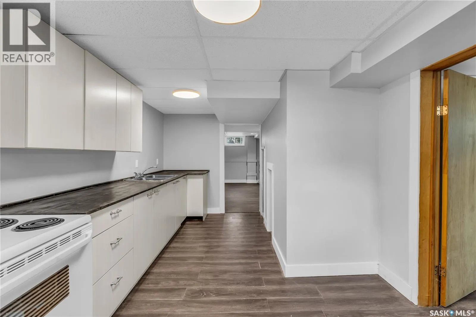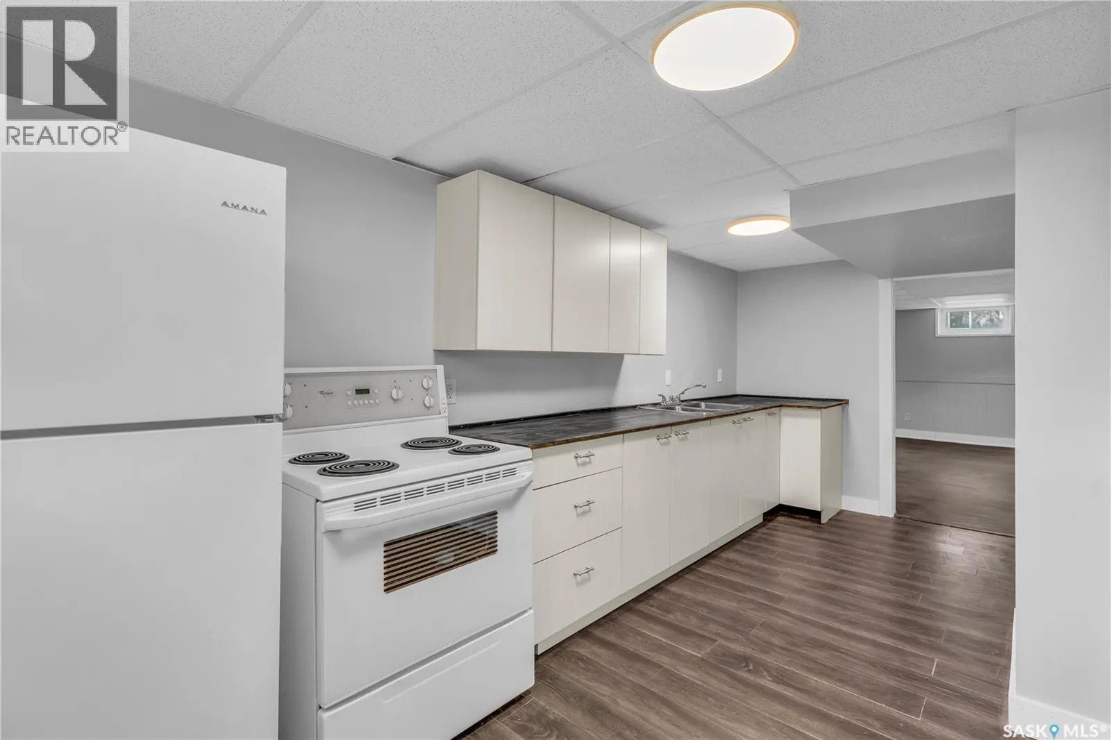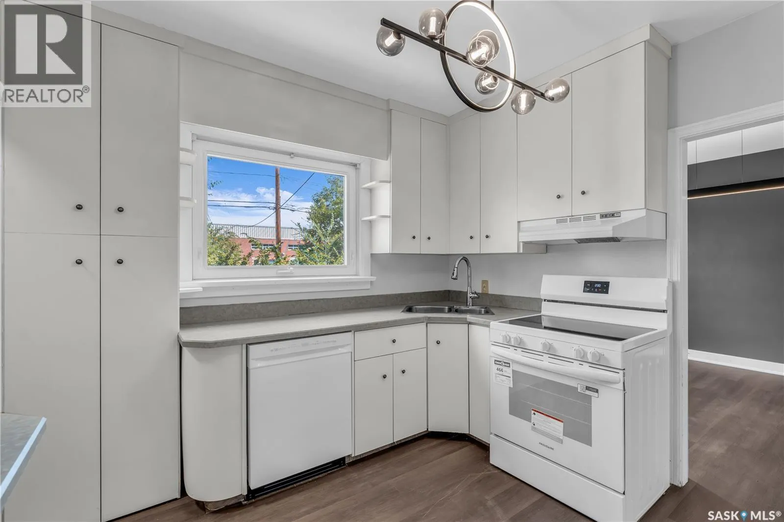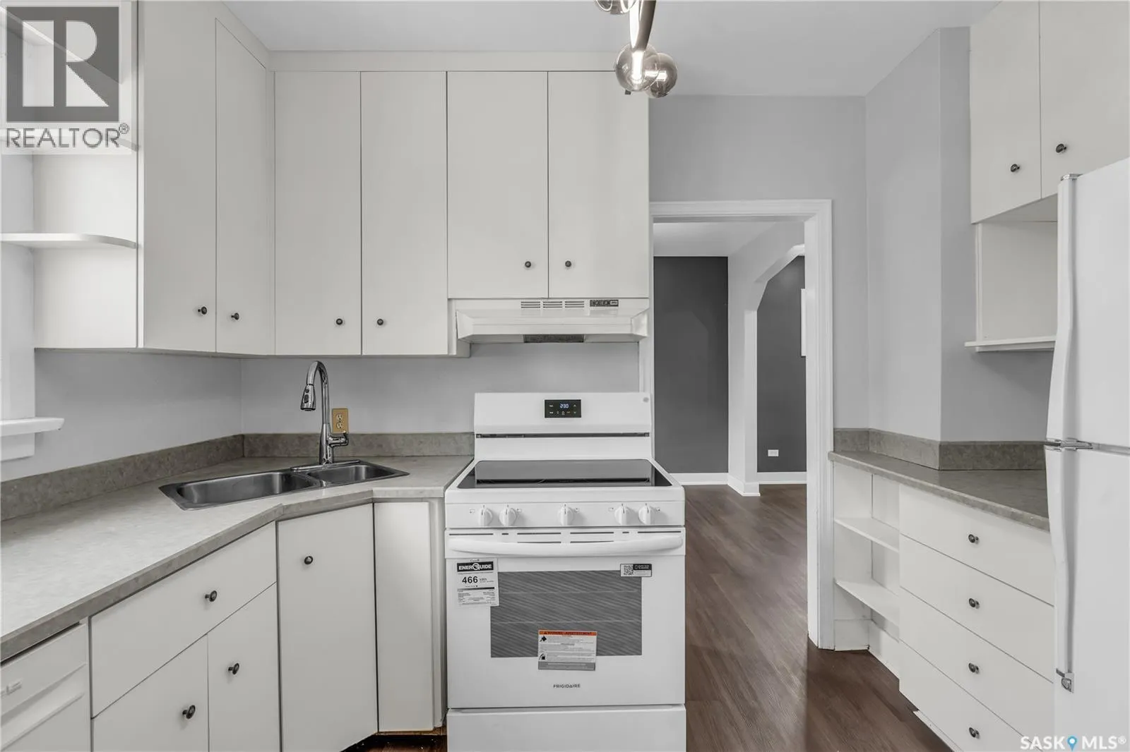 Charming bungalow on a large corner lot in a great location! This bright and inviting 960 sq ft home features a sun-filled main floor with two bedrooms, a full bathroom and one bedroom + den basement suite. Recent upgrades in 2025 include vinyl plank flooring, modern lighting, and fresh interior paint, while the exterior was repainted in 2019 to enhance curb appeal. The fully developed basement offers even more value with a non-conforming suite, ideal for extended family or potential rental income. It includes a kitchenette with appliances, one spacious bedroom + den, and a beautifully renovated bathroom/laundry area. Additional features include a newer water heater, some updated windows, new ceiling tiles in the basement, and a fully fenced yard with a storage shedâperfect for pets, kids, or relaxing summer BBQs. Located directly behind John Paul II Collegiate and close to parks, shopping, and amenities, this home offers excellent value for first-time buyers, investors, or those looking to downsize. Book your private showing today. (id:27476)
