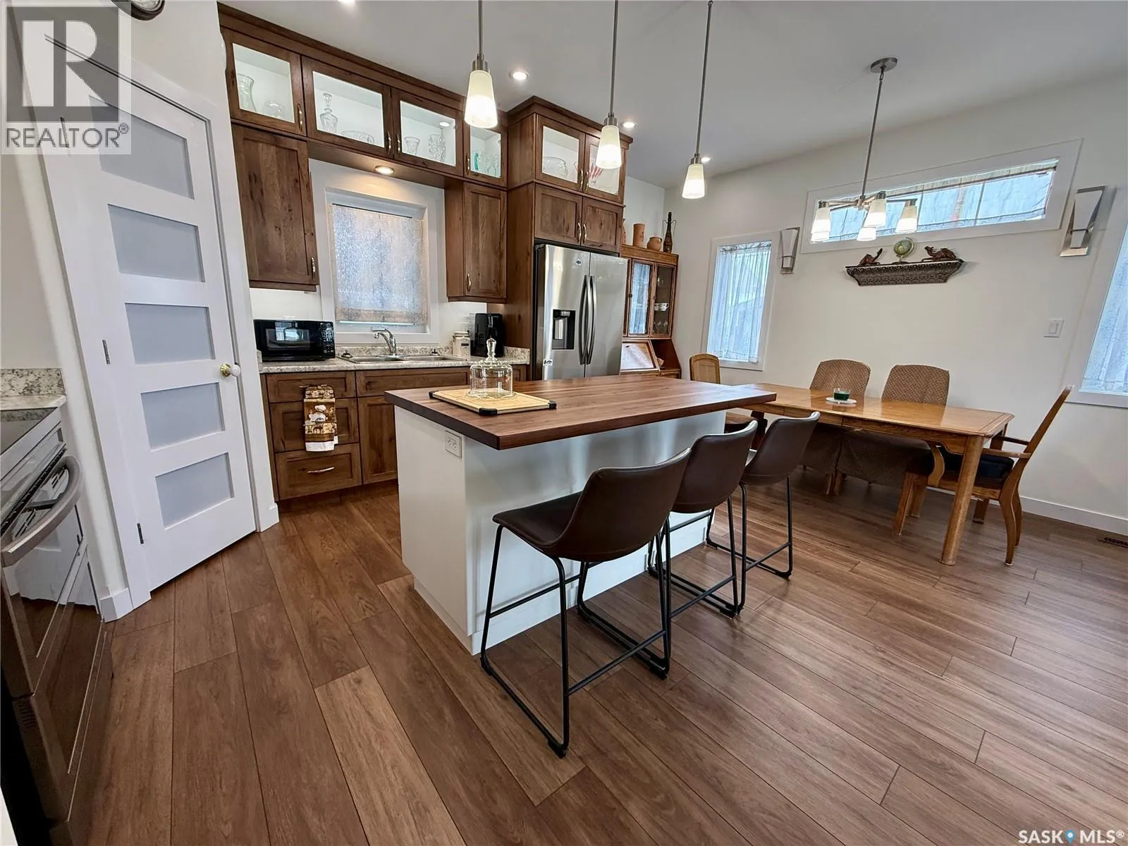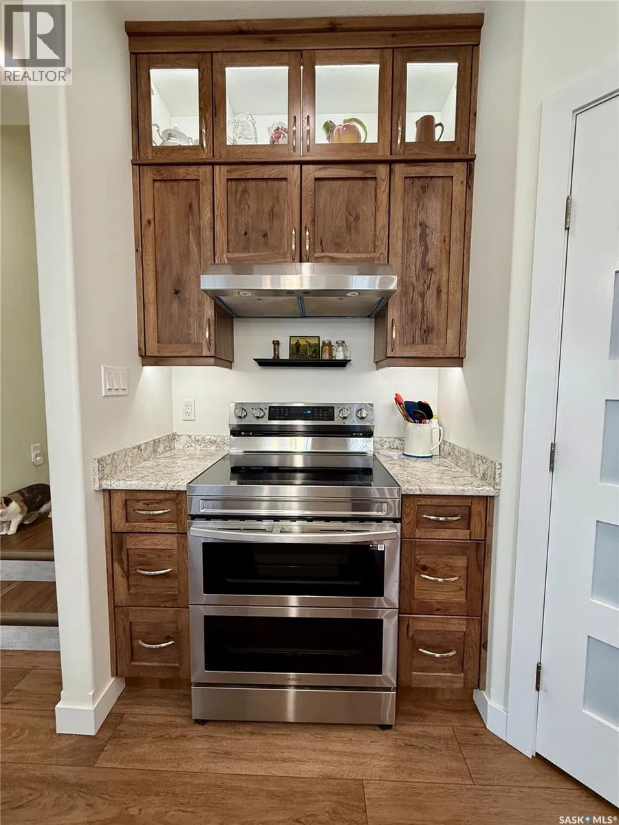 Welcome to this 2024 new build in the Riverview neighbourhood of North Battleford. Offering 1,346 sq. ft. of thoughtfully designed living space, this home blends quality craftsmanship with a functional layout and modern finishes. A spacious front foyer welcomes you in, providing plenty of room for coats, shoes, and guestsâan ideal everyday entry point that sets the tone for the homeâs practical design. The main floor features durable vinyl plank flooring throughout and a custom solid walnut kitchen by Bernier Millwork, complete with a butcher block island, walk-in pantry, and ample workspace. Two bedrooms are located on the main level, each with their own private ensuite, while the primary bedroom also includes a walk-in closet. The fully developed basement adds additional living space with a games room featuring a billiards table and wet bar, a third bedroom, and a 3-piece bathroomâideal for guests or entertaining. Built with Fox Blocks ICF foundation, the home offers added energy efficiency and durability, complemented by triple pane windows throughout. Outside, the fully fenced backyard is set up for both relaxation and function, with a deck, covered gas BBQ area, and a gated storage space with a concrete padâperfect for a boat, trailer, or additional equipment. The property also includes two sheds. At the front, a covered porch provides a great spot to unwind and take in evening sunsets. A front driveway offers more convenient off-street parking. The detached double garage is fully insulated and partially heated, and includes a separate man cave space for hobbies or additional use. A well-built, move-in ready home with modern construction and practical features throughout. (id:27476)