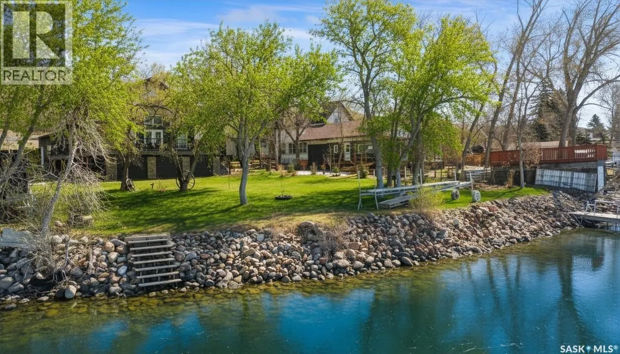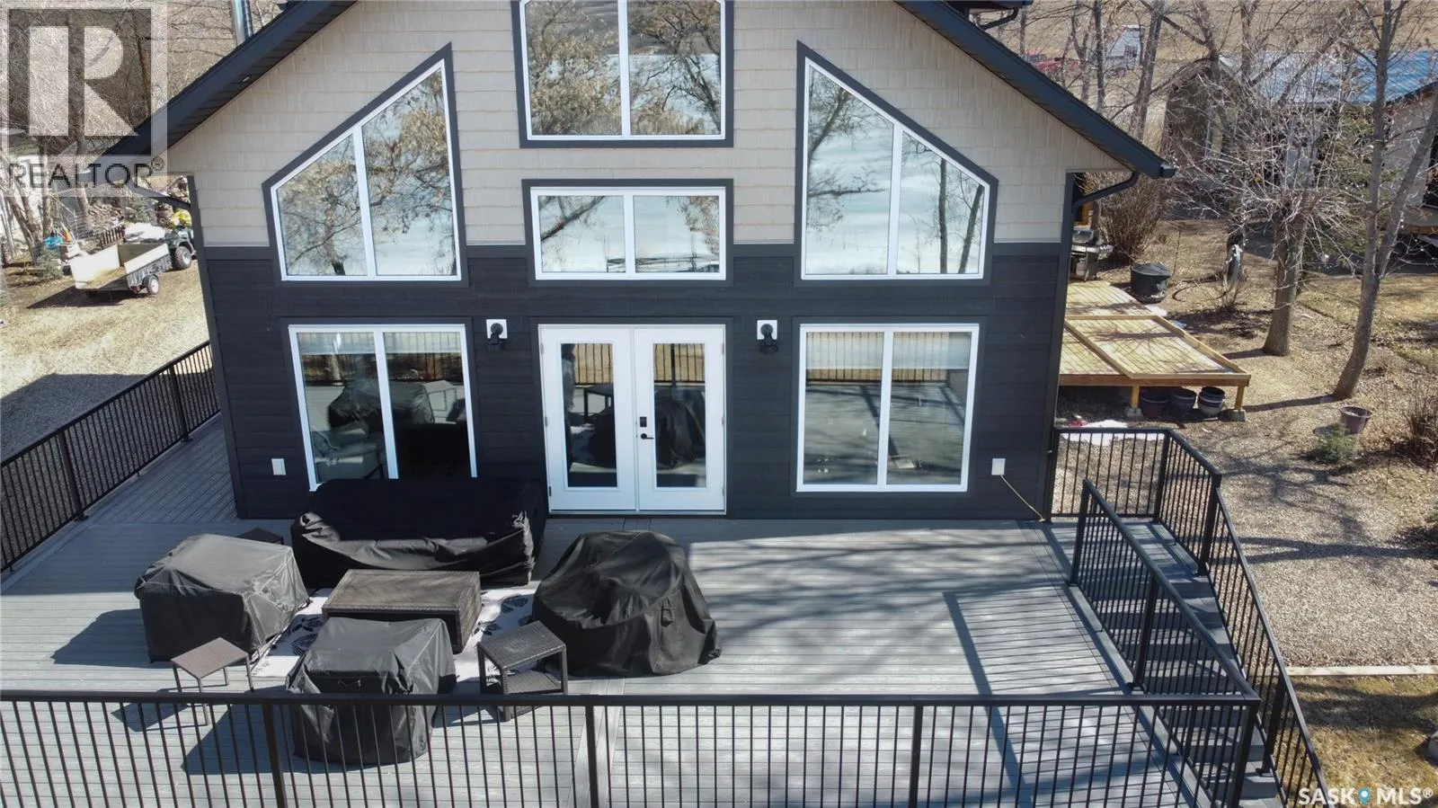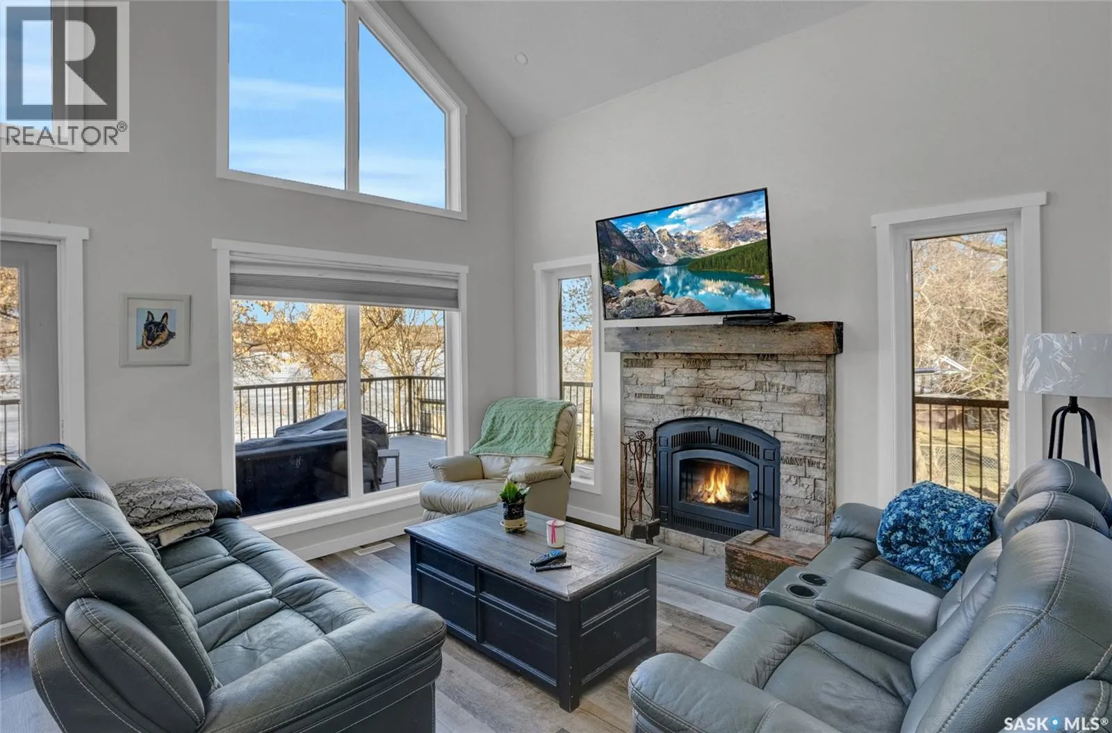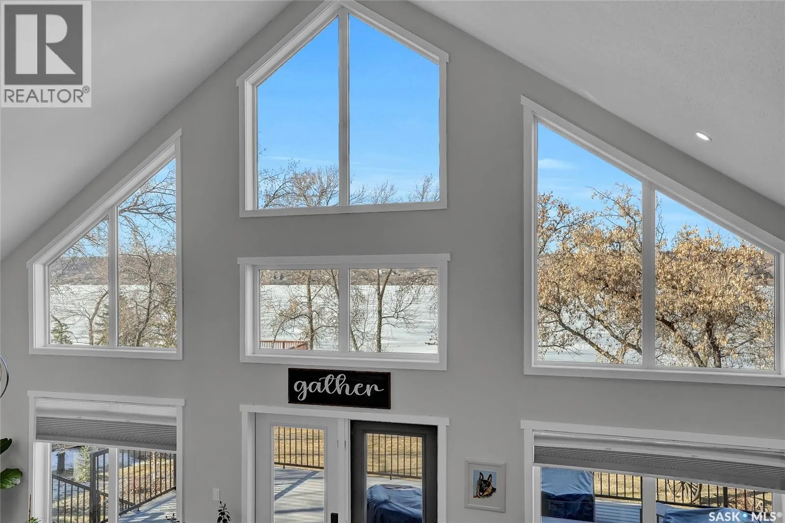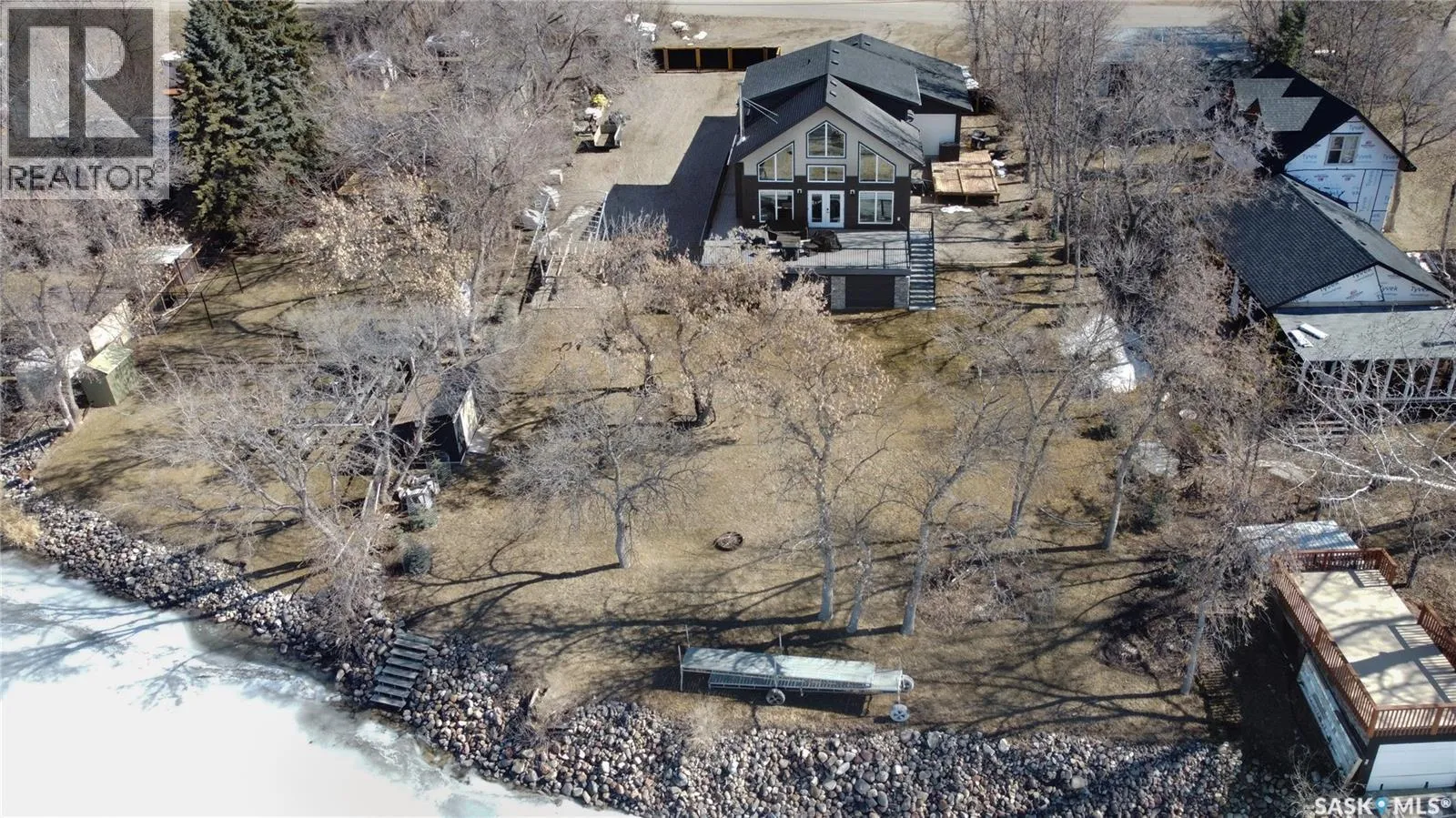 Experience luxury lakefront living in the Resort Village of North Grove on the serene shores of Buffalo Pound Lake. This remarkable 4-season home offers an unparalleled blend of upscale comfort & year-round enjoyment, conveniently located just a short drive from Moose Jaw & Regina. Designed to capture breathtaking lake views, this property boasts a spacious open-concept layout w/expansive windows that seamlessly blend indoor & outdoor living. Step into the foyer, you'll be greeted by stunning chalet-style windows that frame picturesque views of the grounds, the lake & its surroundings. The living room, enhanced by a wood burning fireplace, flows effortlessly into the dining area. The gourmet kitchen is a culinary haven, perfect for creating memorable meals w/the family. On the main floor, you'll find the primary bedroom, designed to accommodate a king-size suite. It features a walk-in closet & a beautifully appointed 3pc. ensuite. Additional conveniences on this floor include a powder room, laundry room, utility area & direct access to the triple att. heated garage with a drive-thru overhead door. The 2nd floor offers a versatile flex room that overlooks the main floor & provides a breathtaking view of the lake. This space can be tailored to suit your family's needs. The floor is completed w/2 additional bedrooms & 4pc. bath. Step outside onto the generously sized deck w/composite decking, thoughtfully designed for relaxation & entertainment. The manicured grounds feature mature landscaping & underground sprinklers, drawing water from the lake to keep the grass lush and vibrant. This property includes a triple att. heated garage, & room for RV/boat parking & comes with a dock & boat lift. This property is ideal for boating, fishing & all-season enjoyment. Nestled in a peaceful resort community renowned for its natural beauty & outdoor lifestyle, this is a rare opportunity to own a premier lakefront property. CLICK ON MULTI MEDIA LINK FOR A VISUAL TOUR & call today! (id:27476)
