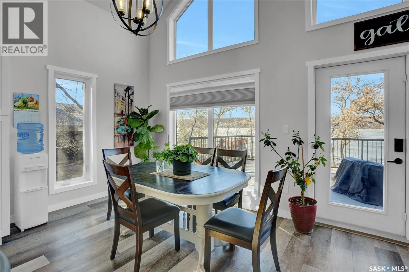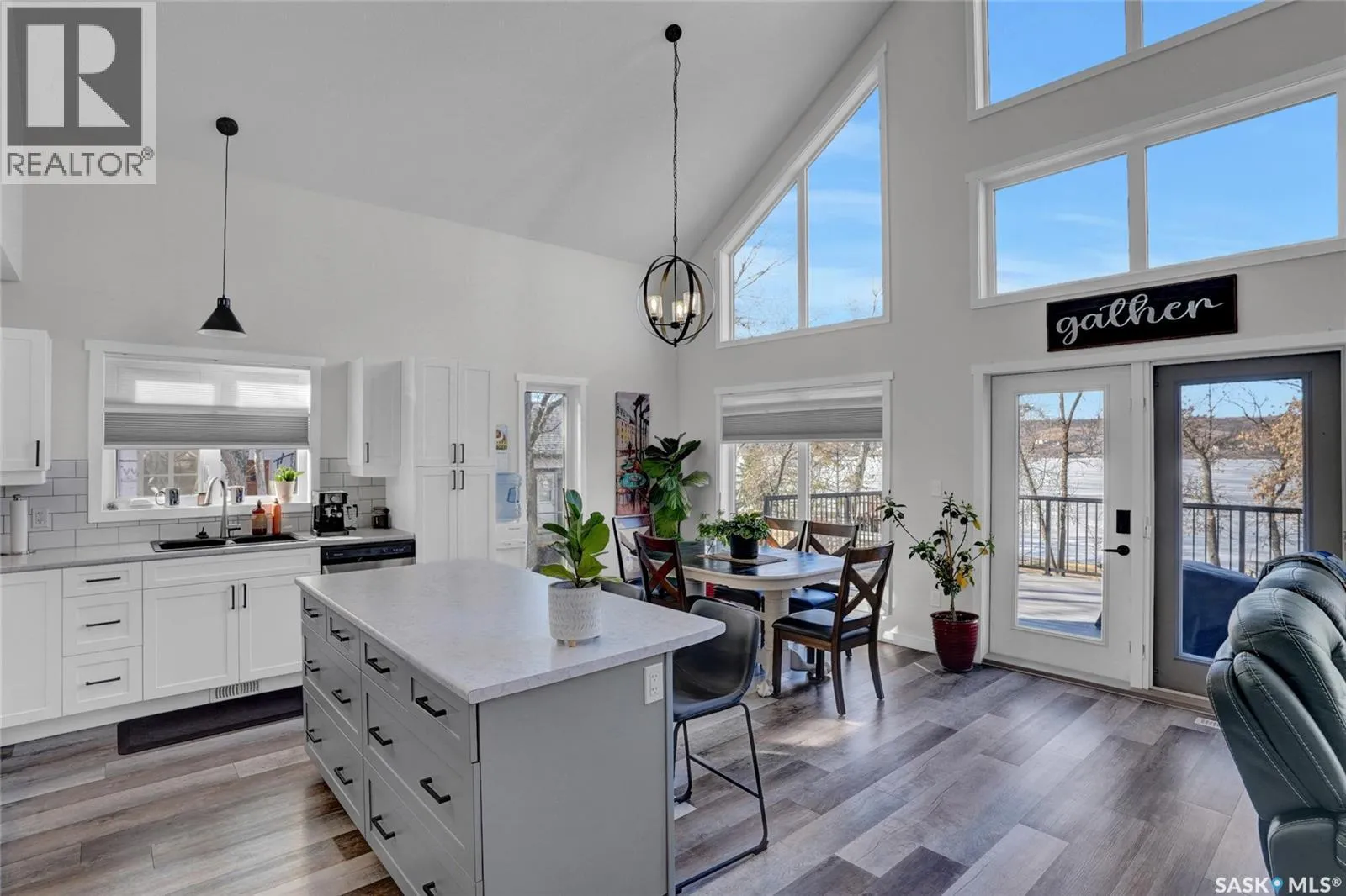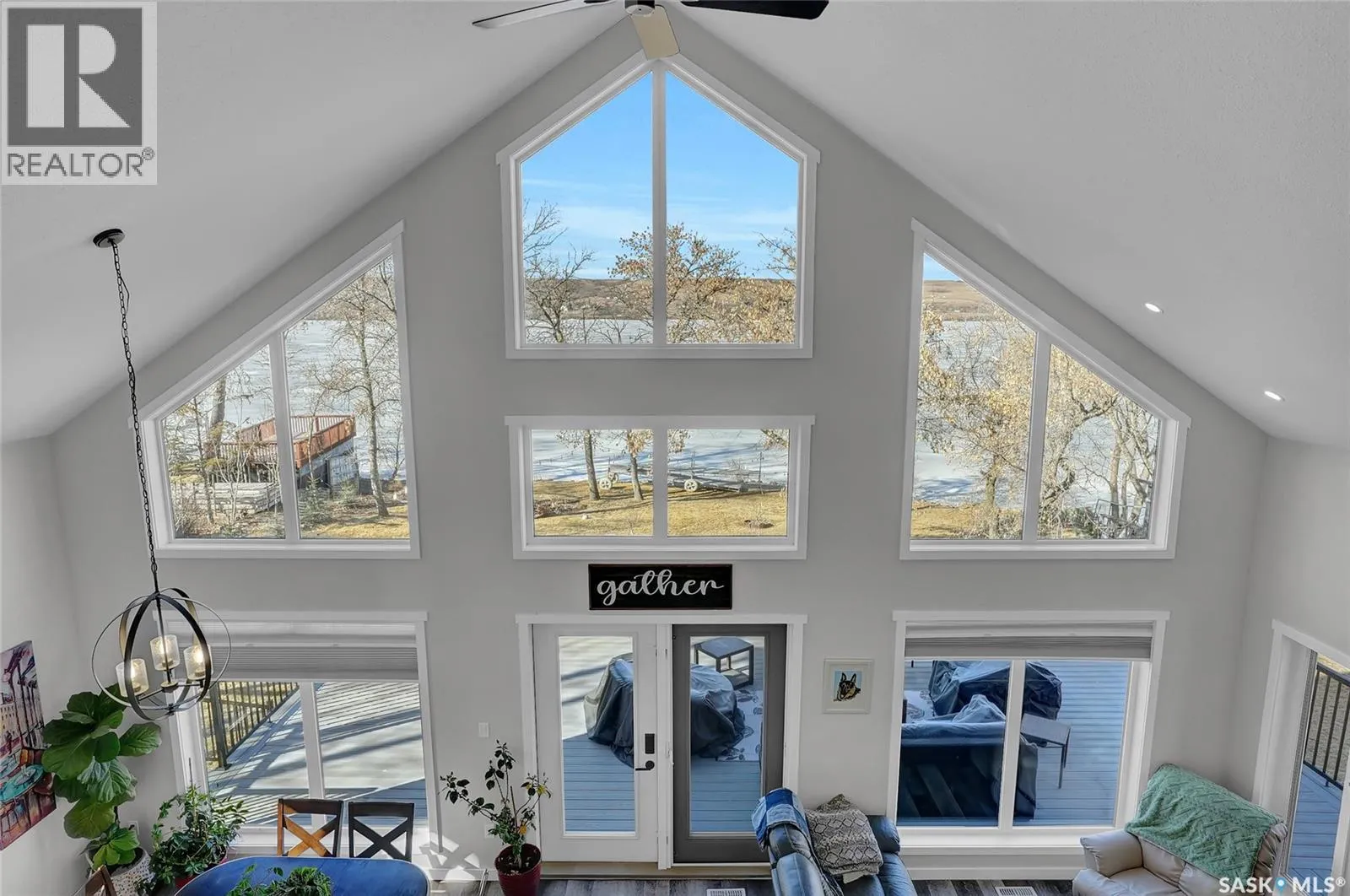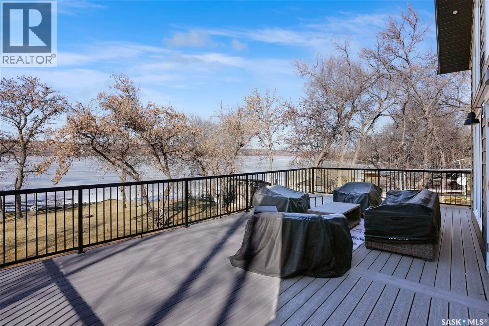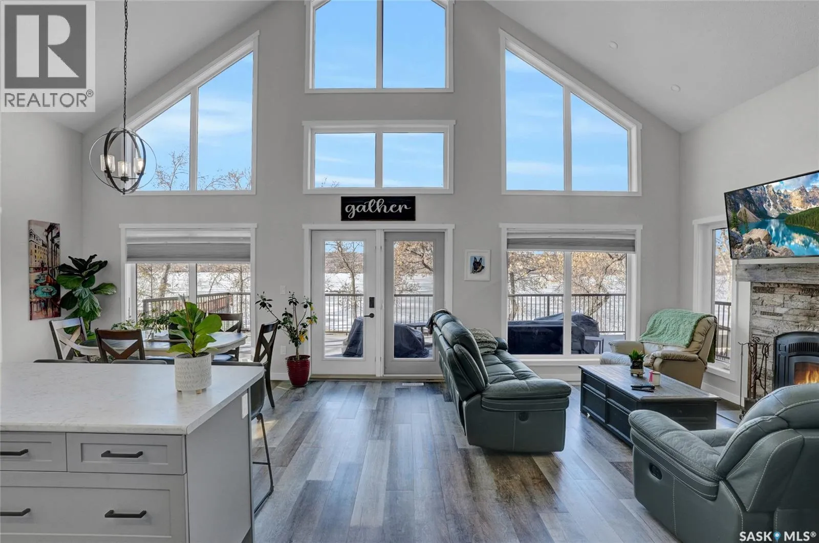 Experience luxury lakefront living in the Resort Village of North Grove on the serene shores of Buffalo Pound Lake. This remarkable 4-season home offers an unparalleled blend of upscale comfort & year-round enjoyment, conveniently located just a short drive from Moose Jaw & Regina. Designed to capture breathtaking lake views, this property boasts a spacious open-concept layout w/expansive windows that seamlessly blend indoor & outdoor living. Step into the foyer, you'll be greeted by stunning chalet-style windows that frame picturesque views of the grounds, the lake & its surroundings. The living room, enhanced by a wood burning fireplace, flows effortlessly into the dining area. The gourmet kitchen is a culinary haven, perfect for creating memorable meals w/the family. On the main floor, you'll find the primary bedroom, designed to accommodate a king-size suite. It features a walk-in closet & a beautifully appointed 3pc. ensuite. Additional conveniences on this floor include a powder room, laundry room, utility area & direct access to the triple att. heated garage with a drive-thru overhead door. The 2nd floor offers a versatile flex room that overlooks the main floor & provides a breathtaking view of the lake. This space can be tailored to suit your family's needs. The floor is completed w/2 additional bedrooms & 4pc. bath. Step outside onto the generously sized deck w/composite decking, thoughtfully designed for relaxation & entertainment. The manicured grounds feature mature landscaping & underground sprinklers, drawing water from the lake to keep the grass lush and vibrant. This property includes a triple att. heated garage, & room for RV/boat parking & comes with a dock & boat lift. This property is ideal for boating, fishing & all-season enjoyment. Nestled in a peaceful resort community renowned for its natural beauty & outdoor lifestyle, this is a rare opportunity to own a premier lakefront property. CLICK ON MULTI MEDIA LINK FOR A VISUAL TOUR & call today! (id:27476)