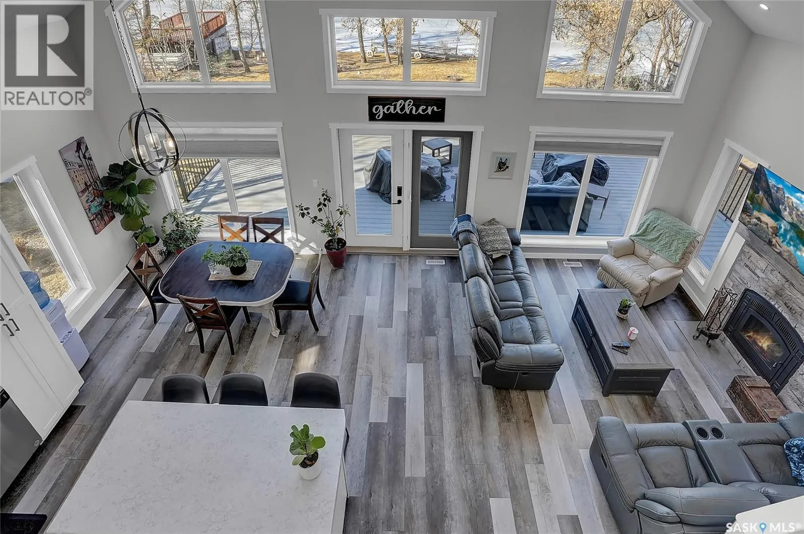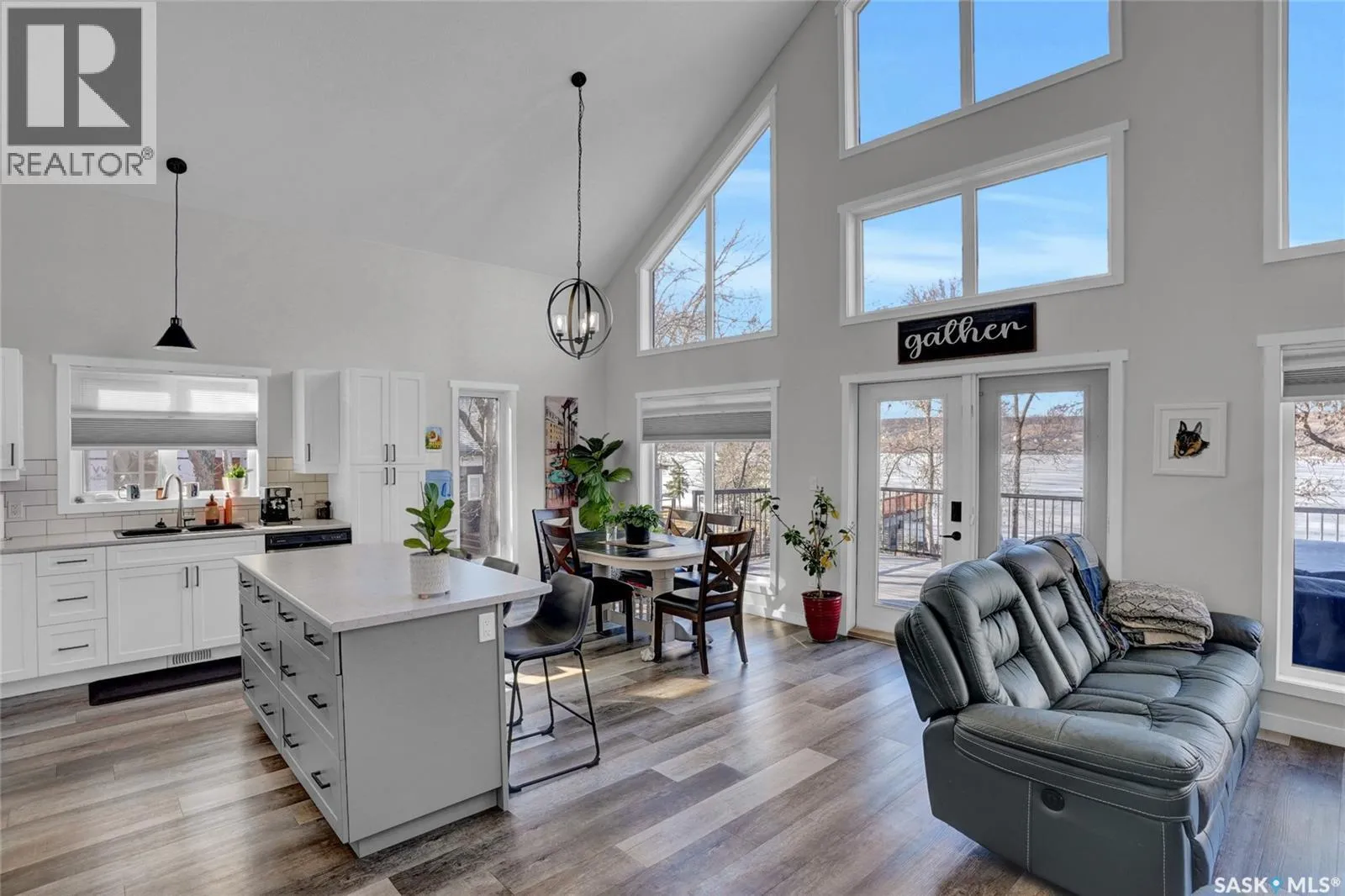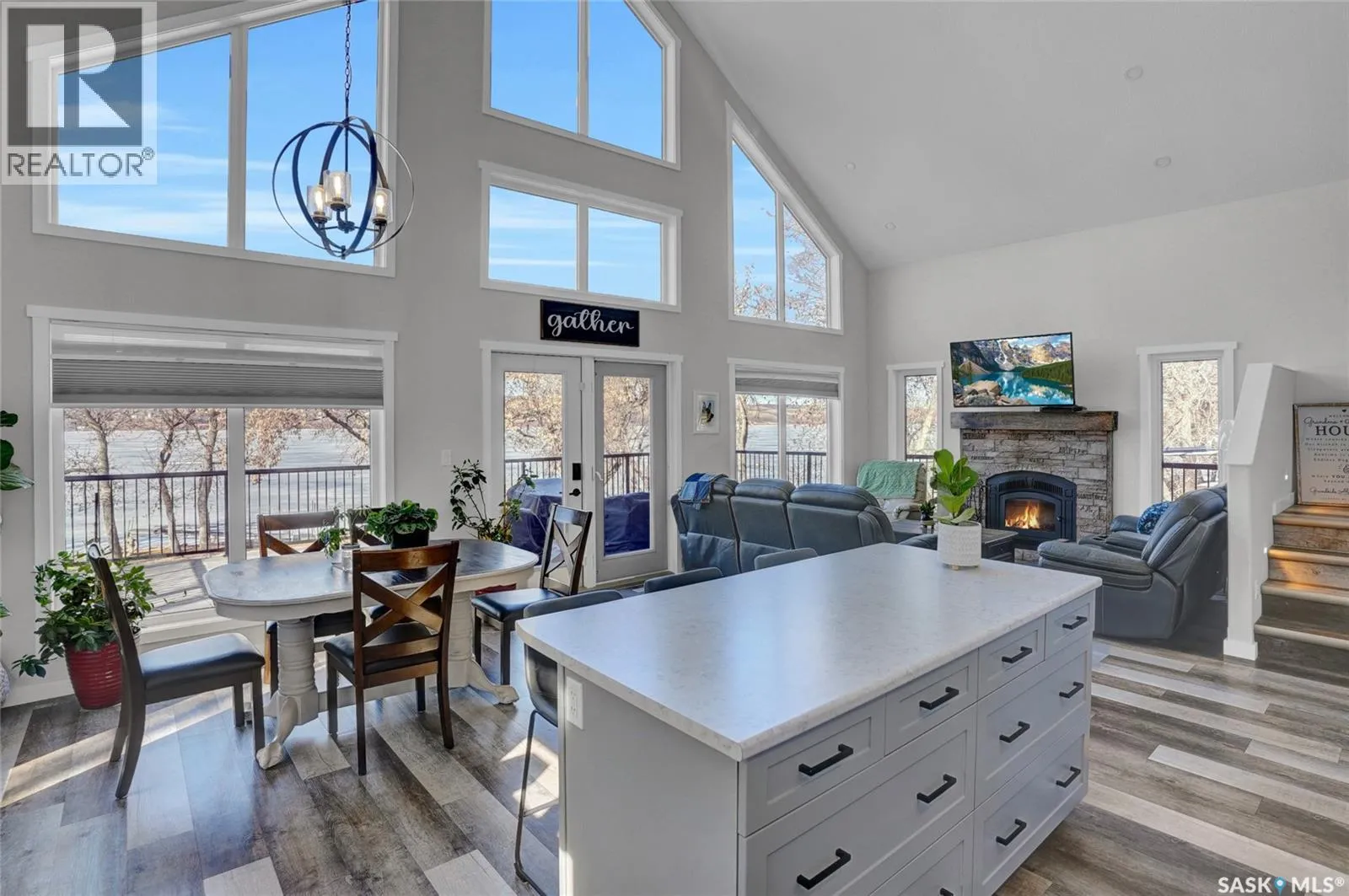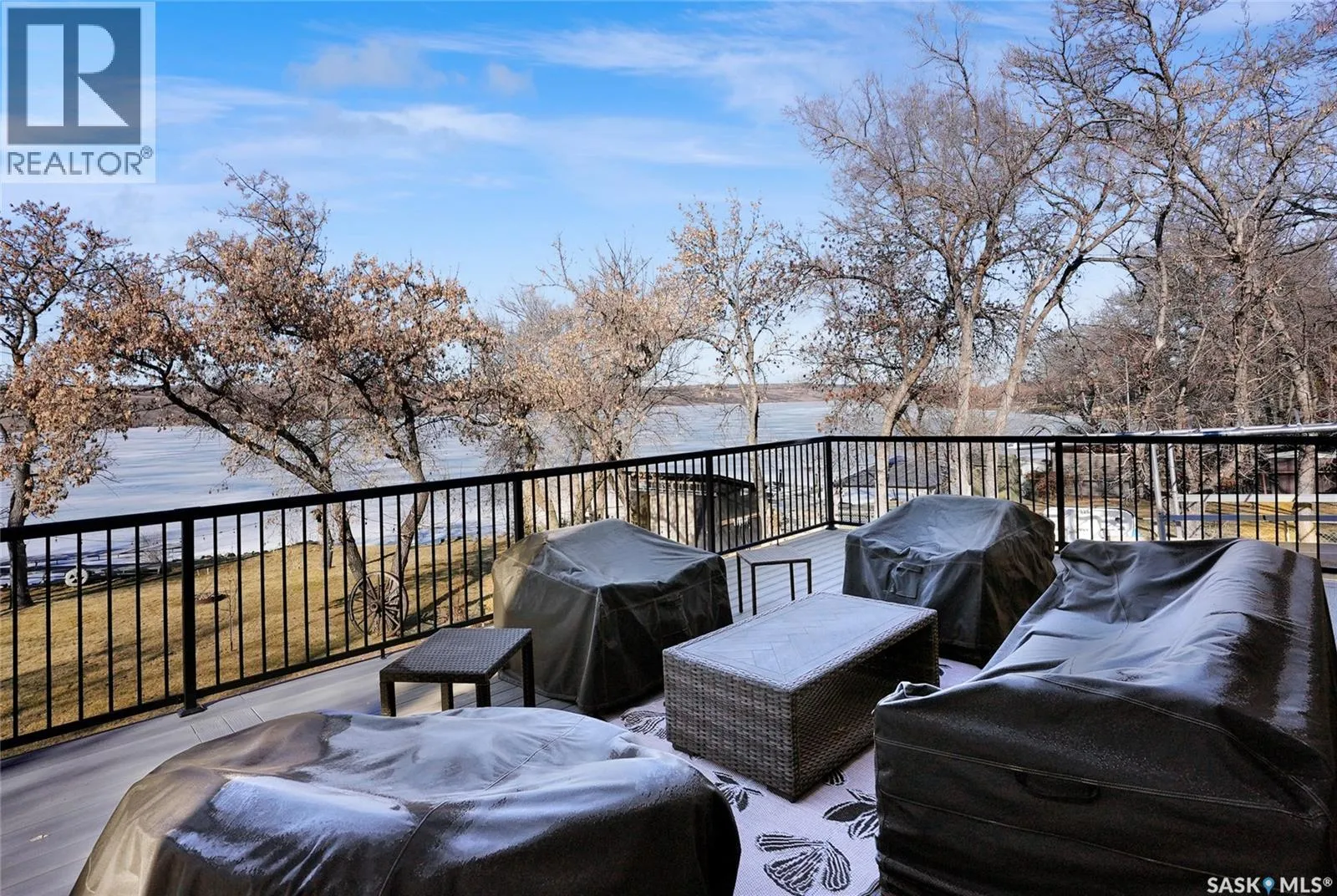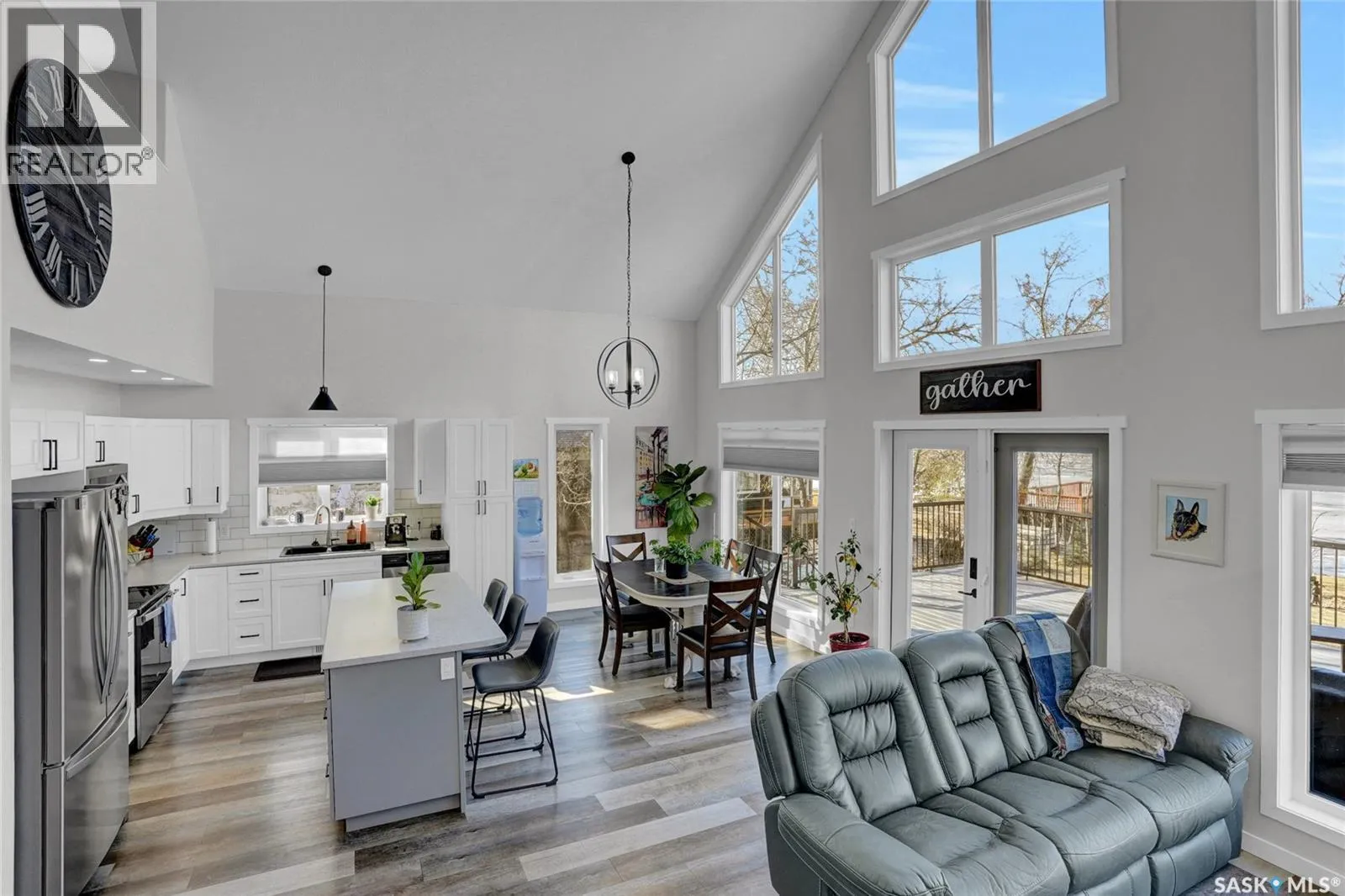Experience luxury lakefront living in the Resort Village of North Grove on the serene shores of Buffalo Pound Lake. This remarkable 4-season home offers an unparalleled blend of upscale comfort & year-round enjoyment, conveniently located just a short drive from Moose Jaw & Regina. Designed to capture breathtaking lake views, this property boasts a spacious open-concept layout w/expansive windows that seamlessly blend indoor & outdoor living. Step into the foyer, you'll be greeted by stunning chalet-style windows that frame picturesque views of the grounds, the lake & its surroundings. The living room, enhanced by a wood burning fireplace, flows effortlessly into the dining area. The gourmet kitchen is a culinary haven, perfect for creating memorable meals w/the family. On the main floor, you'll find the primary bedroom, designed to accommodate a king-size suite. It features a walk-in closet & a beautifully appointed 3pc. ensuite. Additional conveniences on this floor include a powder room, laundry room, utility area & direct access to the triple att. heated garage with a drive-thru overhead door. The 2nd floor offers a versatile flex room that overlooks the main floor & provides a breathtaking view of the lake. This space can be tailored to suit your family's needs. The floor is completed w/2 additional bedrooms & 4pc. bath. Step outside onto the generously sized deck w/composite decking, thoughtfully designed for relaxation & entertainment. The manicured grounds feature mature landscaping & underground sprinklers, drawing water from the lake to keep the grass lush and vibrant. This property includes a triple att. heated garage, & room for RV/boat parking & comes with a dock & boat lift. This property is ideal for boating, fishing & all-season enjoyment. Nestled in a peaceful resort community renowned for its natural beauty & outdoor lifestyle, this is a rare opportunity to own a premier lakefront property. CLICK ON MULTI MEDIA LINK FOR A VISUAL TOUR & call today! (id:27476)