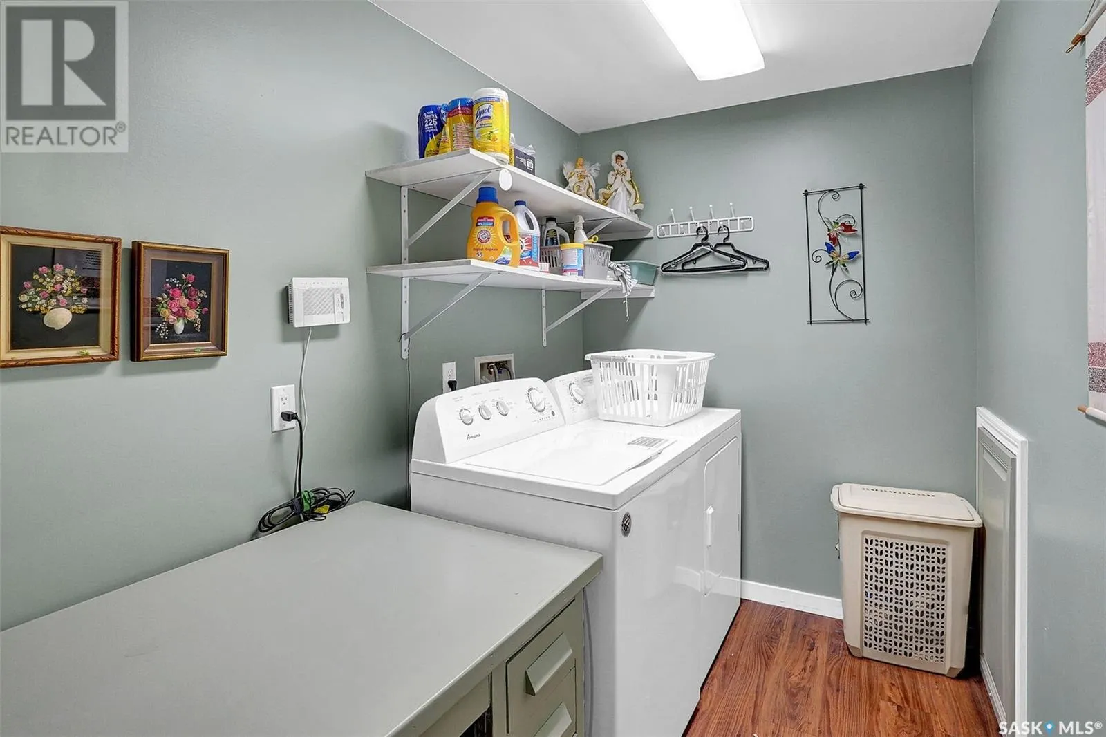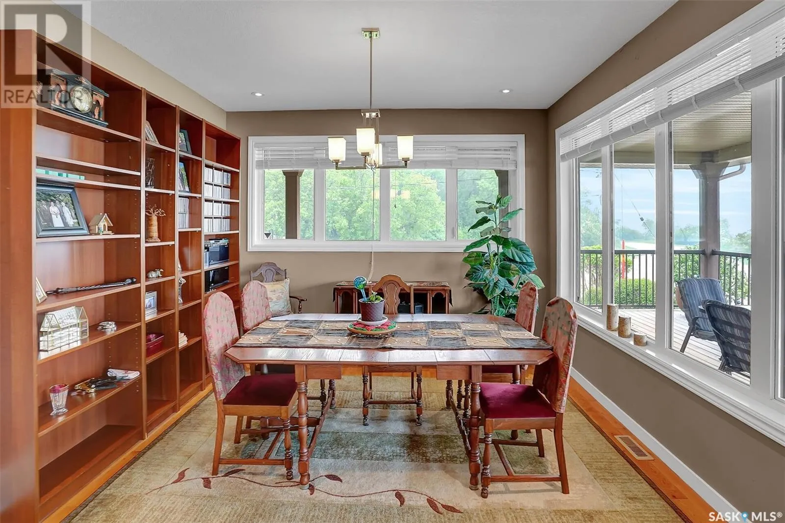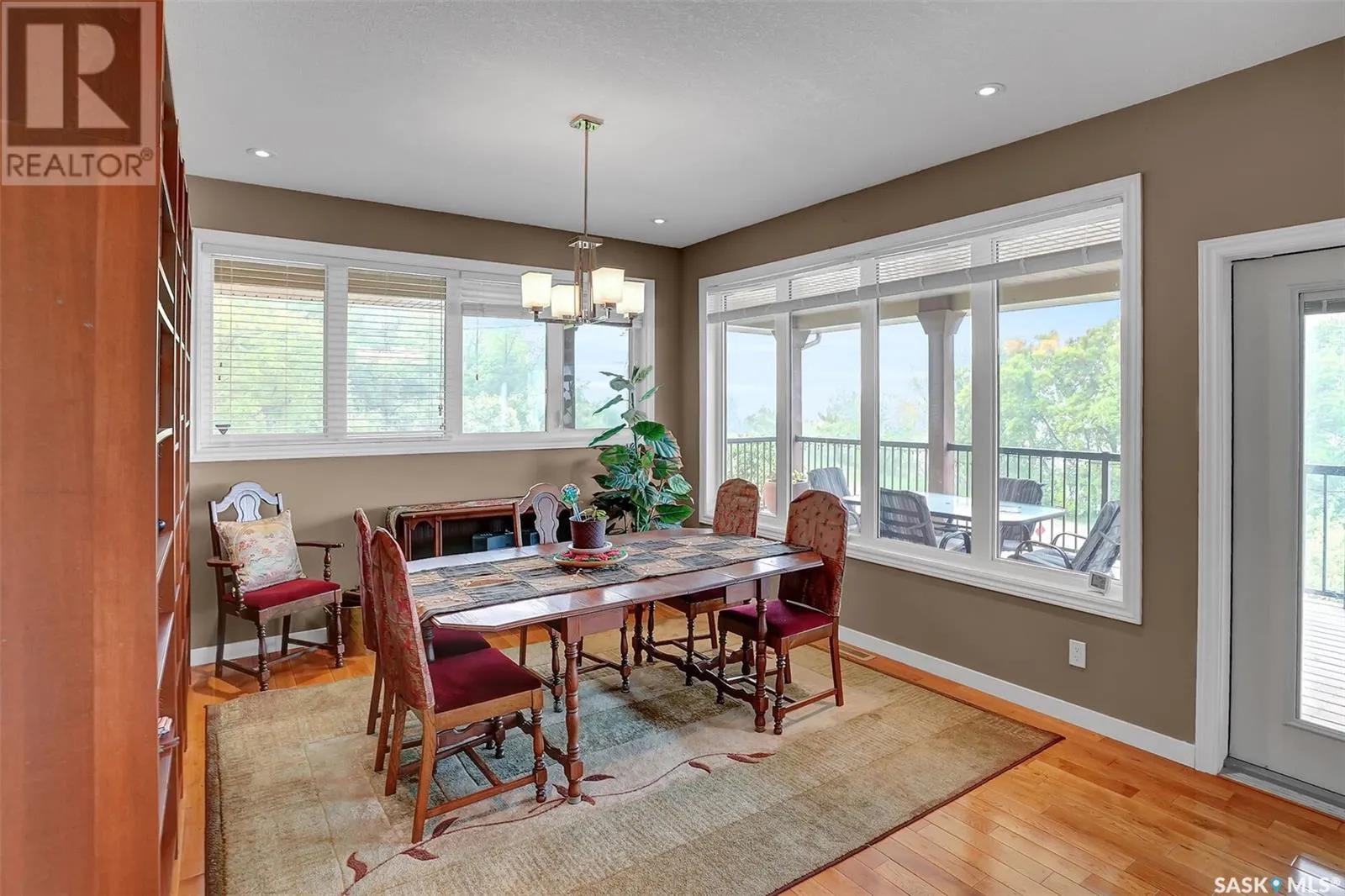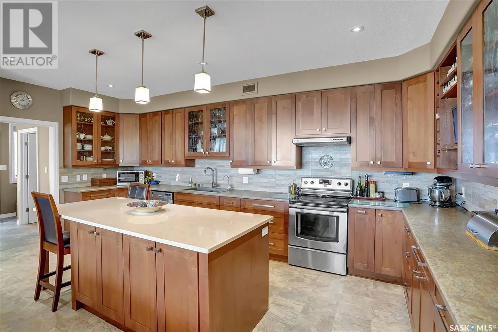 1 mile east of Mission Ridge Winter Park Welcome to 81 Kinsley Place at Mission Lake! WOW! This large walkout delivers incredible, unobstructed views to the lake! This custom, thoughtfully designed home offers an abundance of both luxury and practicality! The main level features 3 good size bedrooms + the primary suite that proudly includes a great 3 pc ensuite, walk in closet, and large windows. The formal dining area is open to the living room with gorgeous hardwood floors. The large kitchen is a chef's dream with nutmeg maple cabinets, large island with a quartz top, S/S appliances (Kenmore Elite freezer/fridge combo), built in pantry with rolling drawers, wine rack, tons of counter space/storage and added pot lights. There is a convenient flex room and 2 pc bath tucked away behind the kitchen. The main bath and ensuite boasts heated flooring. The large laundry room includes the washer and dryer, sink, and more storage capacity. The impressive walkout level showcases an 1800 sq ft suite with a large kitchen with crisp white cabinets, full set of appliances, 3 bedrooms, private laundry room, a full 4 pc bath, and patio doors that lead to a large, private patio space. The exterior of this property includes a retaining wall, swale, garden area, ample parking, and a super impressive covered deck that spans the entire length of the home where you could easily have 75+ people comfortably enjoying the sunrise or the sunsets! There has been many large gatherings and even a few weddings on the property! A large insulated and heated double garage with a workshop completes this property. Other important noteables - steel beam construction, original owners, central vac, central air, air exchanger, original drawings available. A true gem in the land of the living skies! (id:27476)